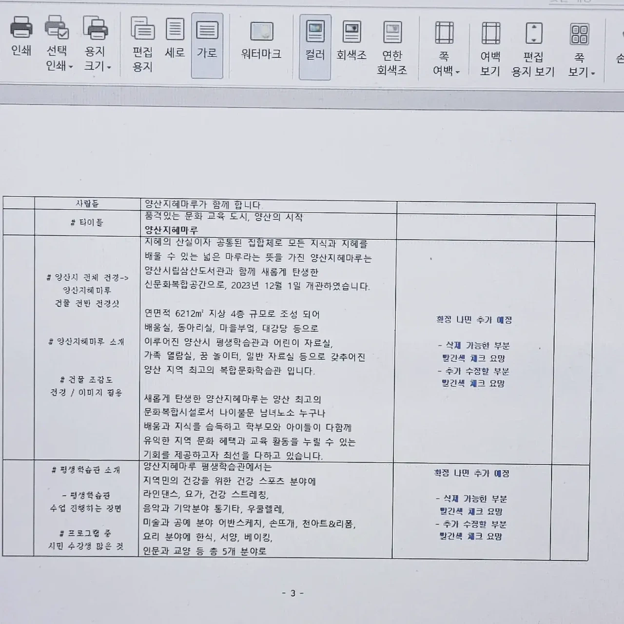 - 10년 넘게 작가로 일하면서 무수히 많은 방송과 대본을 쓰고 창작하지만 경력이 아무리 쌓여도 대본은 쓸 때마다 새롭고 귀하다. 글이 쉽게 쓰일수 있다는건 그만큼의 경험과 경력의 힘이며, 쉽게 써도 가벼운 마음으로 쓰는 건 없다. 무게의 중심을 잡듯이 글의 무게를 적절히 둔다. 몇년 간 함께 일해온 우감독님의 제안으로 연달아 2편의 홍보시나리오 작업을 진행한다. 경산 화장품 산업 영상 시나리오는 대본 마감 후, 편집 수정 중에 있으며 같은 시기의 감독님 요청으로 양산 지혜마루 (평생학습관 or 도서관) 광고 시나리오 대본을 작업중인데 1차 마감했고, 내일 피드백을 받아서 수정 작업이 진행될 예정. 종이책이 나날이 사라지고 있는 시점에서 지역 문화 시설이 만들어져서 다행이라는 생각이 든다. 며칠 밤샘이라 피곤하지만 일을 할 때만큼은 졸지않고 집중해서 작업하고 있다. 나에게 글은 방송이든, 광고든, 책이든, 글은 삶의 일부다. 과연, 2차 대본은 어떻게 수정해야 할까. 바쁜 일상 속에서도 내가 가진 재능으로 의미있는 일에 믿고 투입된다는 것이 새롭고 기쁘다.