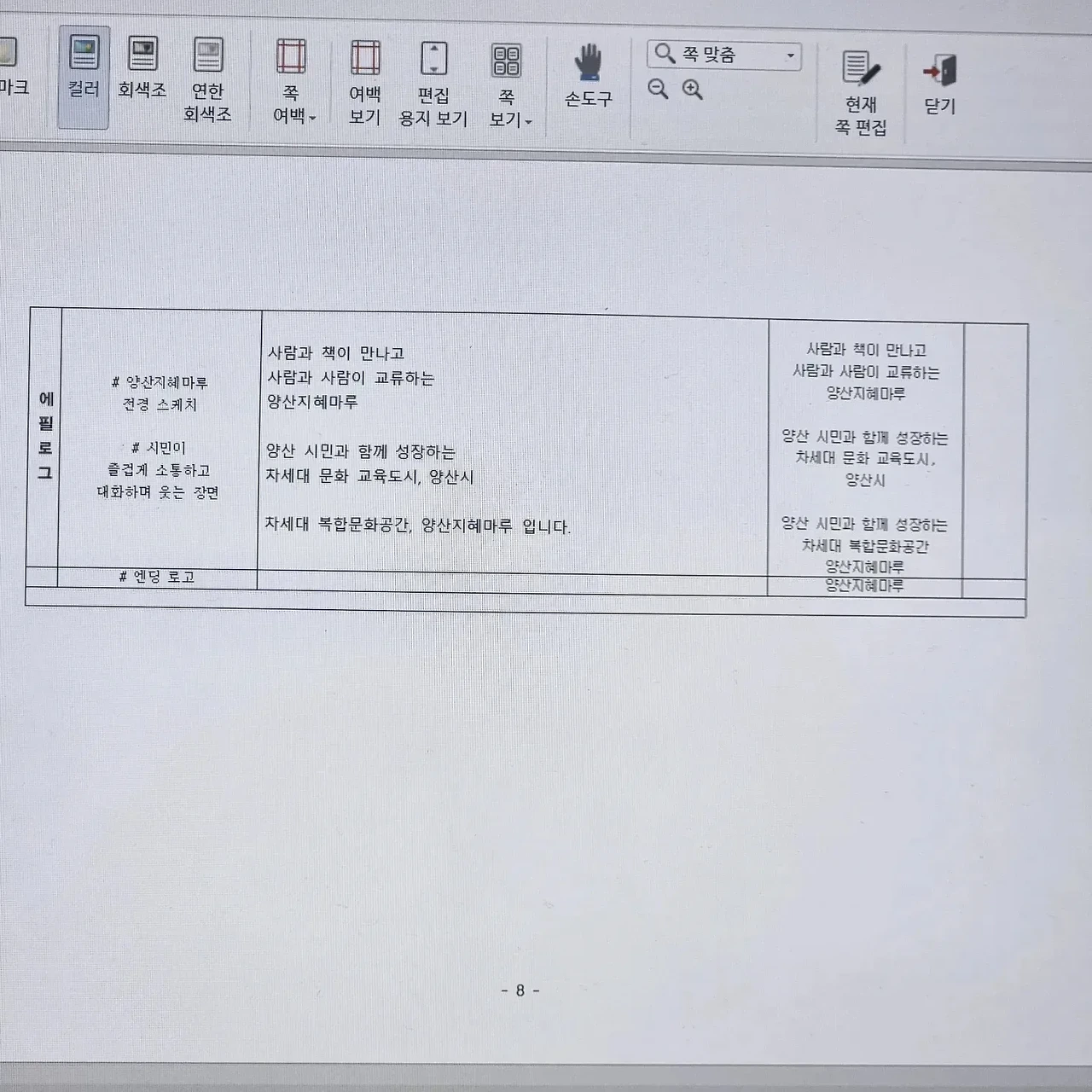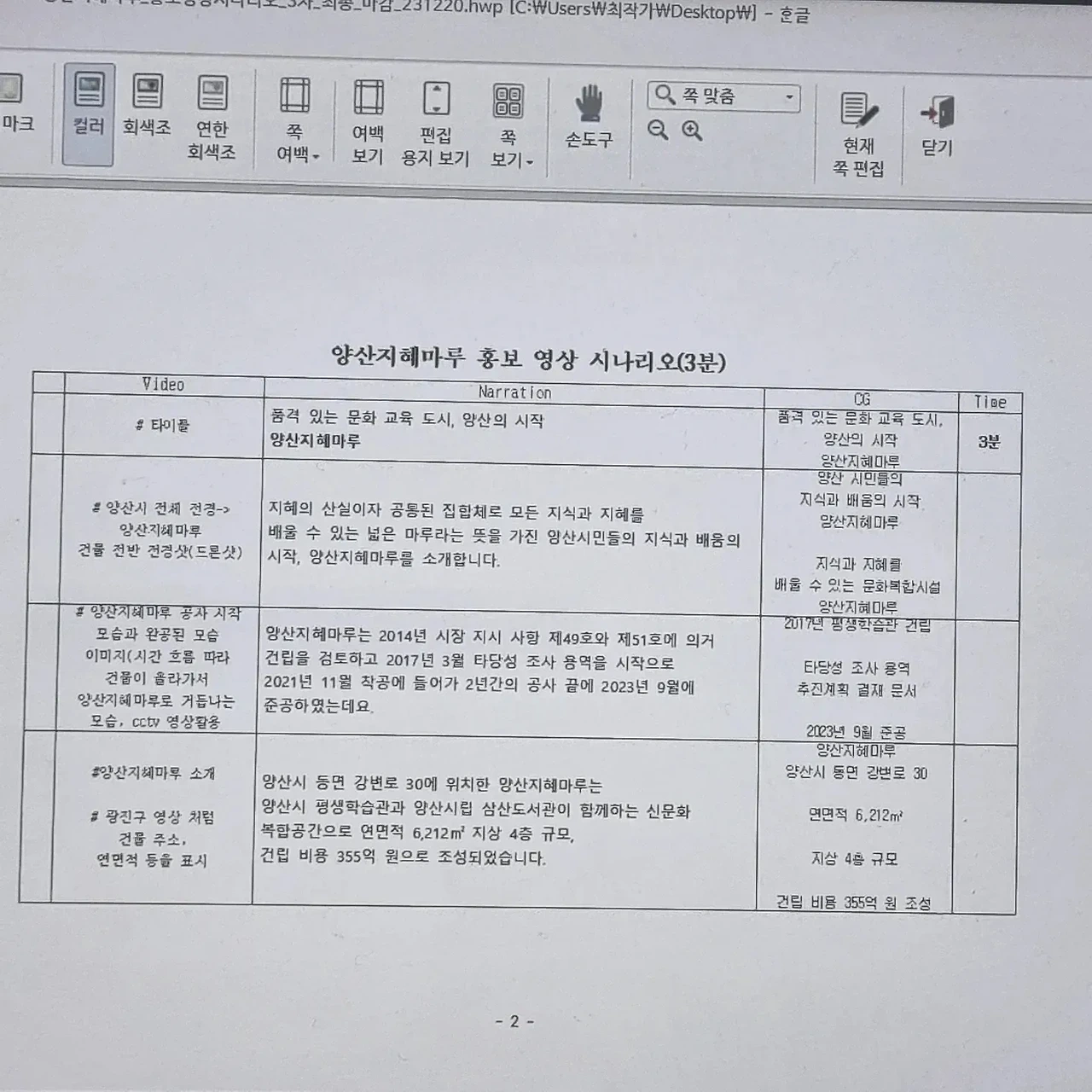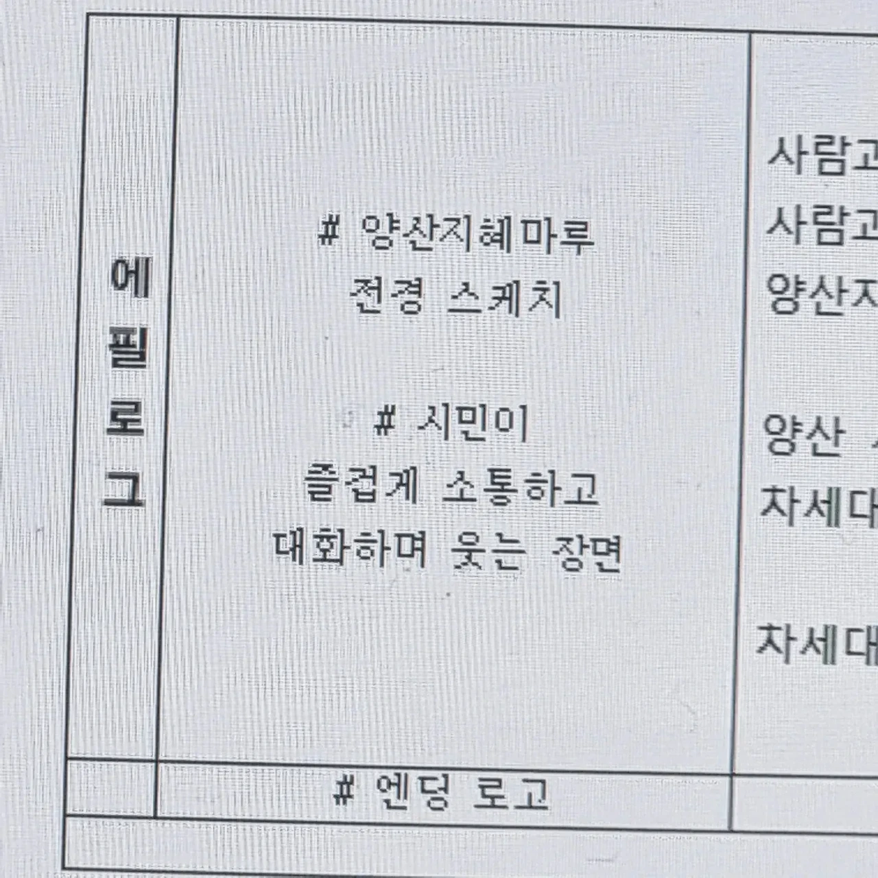 - 기업 광고나 관공서 광고 시나리오를 작업할 때 가장 중요한 건 기사와 자료, 정보 수집이다. 모르는 것 보다, 알고 있는 게 많으면 많을수록 대본 초고 작업에 도움 된다. 그리고 초고 이후엔 수정 작업의 연속이다. 클라이언트와 감독이 원하는 시간 대에 맞추어 내레이션과 자막을 작업하고, 성우 녹음 전 작가가 내레이션 대본을 읽고 어느 정도의 내레이션 분량을 시간에 맞춘다. 대본 수정 작업 시 가장 중요한 것은 과감히 버림과 비움이다. 정해진 시간에 맞추어 적절히 버리고 비워내는 것에서 최종 대본 마감의 끝이 보인다. 창작의 고통은 곧 창작의 끝에서 끝나기에 이번 작업도 참 수고했어. 초고에서 만족하는 작가는 절대 없다. 천부적인 재능을 가진 천재가 아닌 이상, 작곡가, 작사가가 아닌 이상, 작가는 수정의 연속성으로 최고의 작품을 만든다. 프롤로그와 에필로그는 늘 긍정적인 에너지와 웃음이 필요하다. 캠페인이 아닌 이상, 눈물보다 웃음이 답.