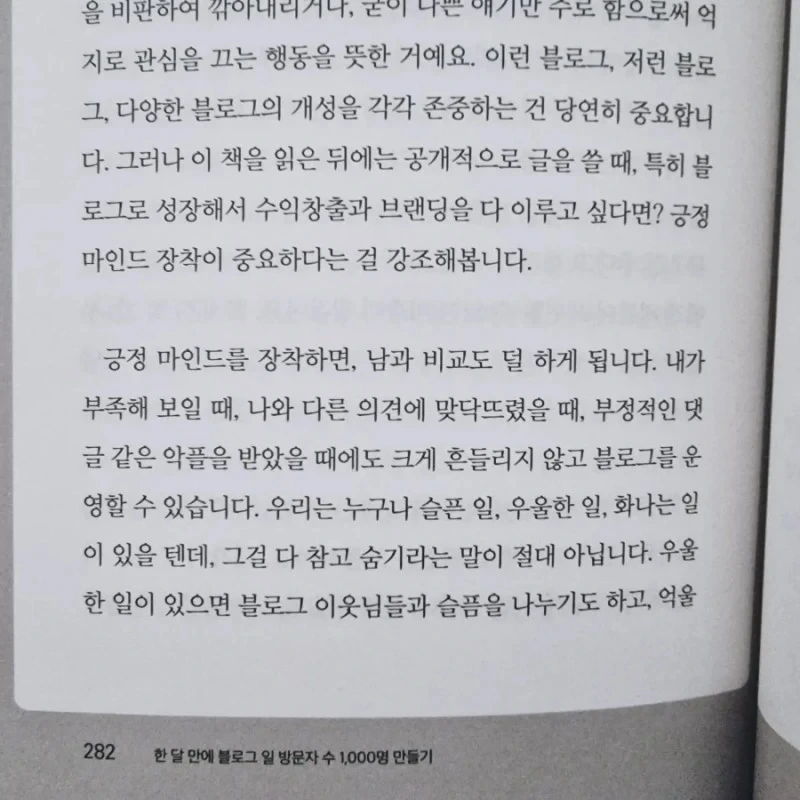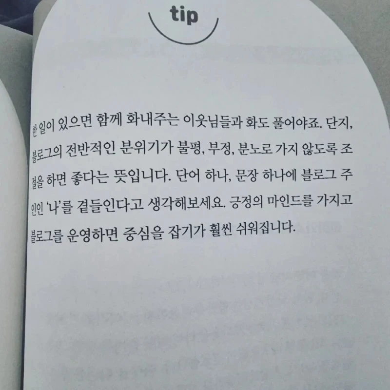 다양한 블로그의 개성을 각각 존중하는 건 당연히 중요합니다. 그러나 이 책을 읽은 뒤에는 공개적으로 글을 쓸 때, 특히 블로그로 성장해서 수익창출과 브랜딩을 다 이루고 싶다면? 긍정마인드 장착이 중요하다는 걸 강조해봅니다. 긍정 마인드를 장착하면, 남과 비교도 덜 하게 됩니다. 내가 부족해보일 때, 나와 다른 의견에 맞닥뜨렸을 때, 부정적인 댓글같은 악플을 받았을 때에도 크게 흔들리지 않고 블로그를 운영할 수 있습니다. 우리는 누구나 슬픈 일, 우울한 일, 화나는 일이 있을텐데, 그걸 다 참고 숨기라는 말이 절대 아닙니다. 우울한 일이 있으면 블로그 이웃님들과 슬픔을 나누기도 하고 억울한 일이 있으면 함께 화내주는 이웃님들과 화도 풀어야죠. 단지, 블로그의 전반적인 분위기가 불평, 부정, 분노로 가지 않도록 조절을 하면 좋다는 뜻입니다. 단어 하나, 문장 하나에 블로그 주인인 ‘나’를 곁들인다고 생각해보세요. 긍정의 마인드를 가지고 블로그를 운영하면 중심을 잡기가 훨씬 쉬워집니다. p.282-283
