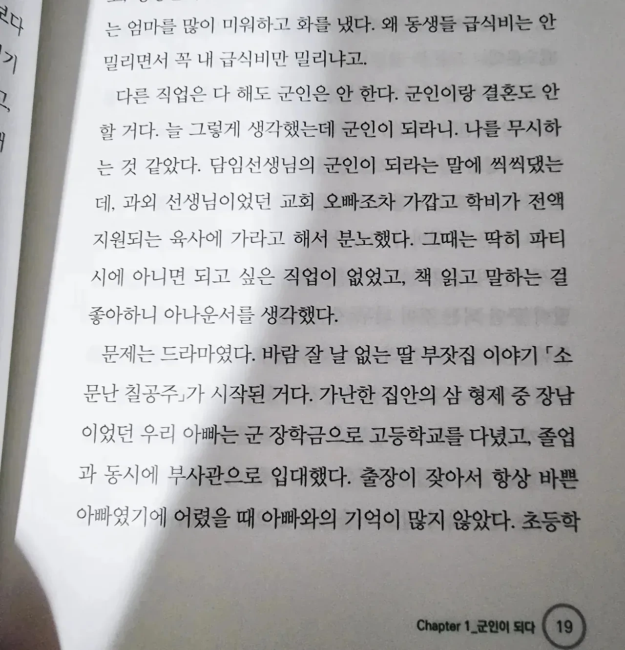 - 다른 직업은 다 해도 군인은 안 한다. 군인이랑 결혼도 안할 거다. 늘 그렇게 생각했는데 군인이 되라니. 나를 무시하는 것 같았다. 담임선생님의 군인이 되라는 말에 씩씩댔는데, 과외선생님이었던 교회 오빠 조차 가깝고 학비가 전액 지원되는 육사에 가라고 해서 분노했다. 그때는 딱히 파티시에 아니면 되고 싶은 직업이 없었고, 책 읽고 말하는 걸 좋아하니 아나운서를 생각했다. 문제는 드라마였다. 바람 잘 날 없는 딸 부잣집 이야기 <소문난 칠공주>가 시작된 거다. 가난한 집안의 삼 형제 중 장남이었던 우리 아빠는 군 장학금으로 고등학교를 다녔고, 졸업과 동시에 부사관으로 입대했다. 출장이 잦아서 항상 바쁜 아빠였기에 어렸을 때 아빠와의 기억이 많지 않았다. P-19