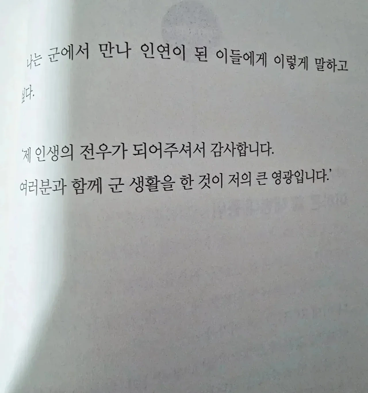 - 부모가 직업 군인이라면 자연스럽게 딸도 군인이 될 것 같다는 생각을 한 적이 있다. 책 속의 저자는 아버지가 군인이고, 군인 아파트에서 10년을 거주 했다고 한다. 특이한 점은 국어국문학과를 입학해서 ROTC를 통해 직업 군인으로 6년을 살았다는 것. 드라마 속 이야기가 아니라, 실제 직업군의 이야기를 통해 군인의 삶도 평범한 사람들과 비슷하다는 걸 알게 되었다. <태양의 후예> 보다, <미생>에 가깝다는 말이 절묘하게 설득이 되었다. 인간은 어릴 때부터 학교라는 공간을 통해 사회를 만나게 되고, 남성의 경우 성인이 되면 국방의 의무를 다하기 위해 군대에 간다. 여성의 경우는 본인이 선택해서 갈 수 있는데, 내가 볼때는 쉽지 않았을 것 같다. 그래서 대단한 것 같다. 군인으로 살아온 6년의 삶은 누구보다 명예롭고 빛나는 시간이었으리라 생각해 본다.