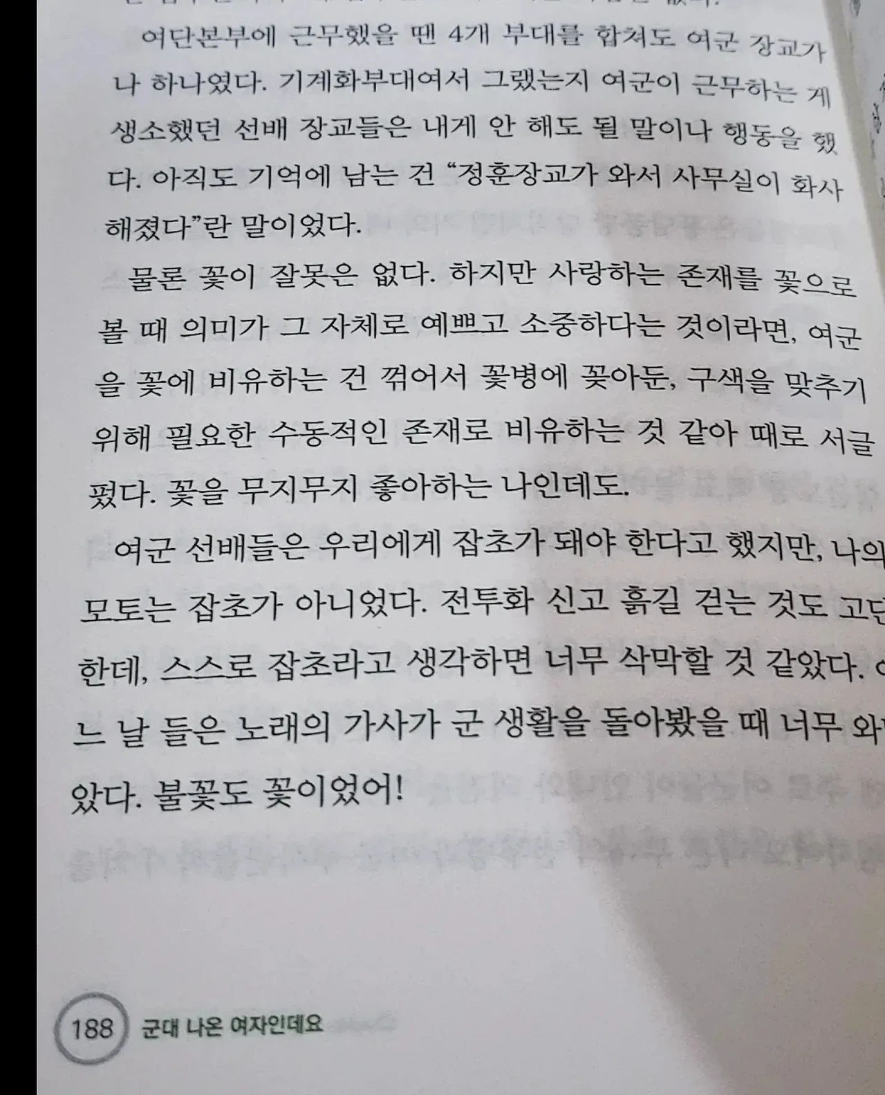 - 아빠는 반대하셨다. 좋은 직업을 가지고 편하게 살았으면 좋겠다고, 네가 군대에 가면 동생들도 다 군인이 될 거라고 하면서 말리셨다. 그러나 지금 생각해 보면 욕심 많은 딸이 조직에서 적응을 못하고, 폐가 될까 봐 걱정하셨던 마음도 느껴진다. 운명은 내 편이었는지, 여성 학군단 후보생을 모집한다는 플랜카드가 캠퍼스 여기저기 붙었다. 나를 위한 기회인 것 같았다. 1년간 체력 단련과 면접 준비를 해서 최종 합격을 한 후에야 아빠께 얘기할 수 있었다. ‘아빠는 아들이 없어서 군대 간 자식 걱정은 안 할 줄 알았는데.’ P-41