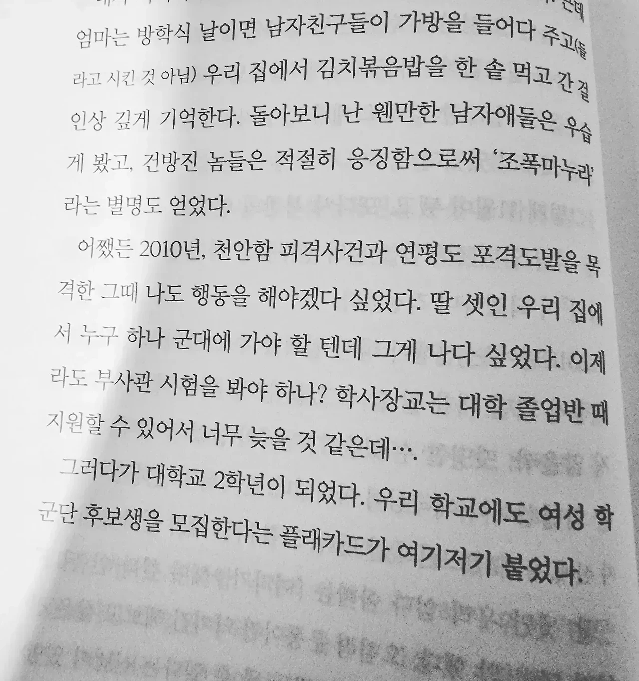 - 어쨌든 2010년, 천안함 피격사건과 연평도 포격도발을 목격한 그때 나도 행동을 해야겠다 싶었다. 딸 셋인 우리 집에서 누구 하나 군대에 가야 할 텐데 그게 나다 싶었다. 이제라도 부사관 시험을 봐야하나? 학사장교는 대학 졸업반 때 지원할 수 있어서 너무 늦을 것 같은데. 그러다가 대학교 2학년이 되었다. 우리 학교에도 여성 학군단 후보생을 모집한다는 플랜카드가 여기저기 붙었다. P-26