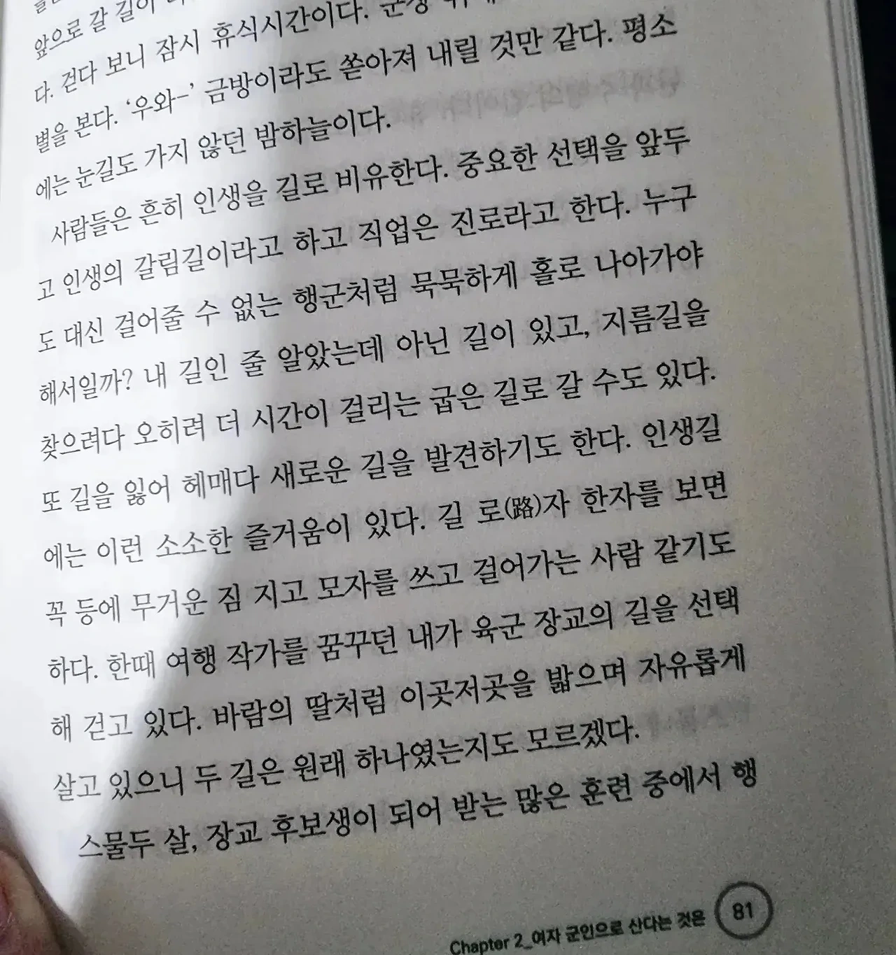 - 사람들은 흔히 인생을 길로 비유한다. 중요한 선택을 앞두고 인생의 갈림길이라고 하고 직업은 진로라고 한다. 누구도 대신 걸어줄 수 없는 행군처럼 묵묵하게 홀로 나아가야해서 일까? 내 길인 줄 알았는데 아닌 길이 있고, 지름길을 찾으려다 오히려 더 시간이 걸리는 굽은 길로 갈수도 있다. 또 길을 잃어 헤매다 새로운 길을 발견하기도 한다. 인생길에는 이런 소소한 즐거움이 있다. 길 로(路)자 한자를 보면 꼭 등에 무거운 짐 지고 모자를 쓰고 걸어가는 사람 같기도 하다. 한때 여행 작가를 꿈꾸던 내가 육군 장교의 길을 선택해 걷고 있다. 바람의 딸처럼 이곳저곳을 밟으며 자유롭게 살고 있으니 두 길은 원래 하나였는지도 모르겠다. P-81 - 일반인에게 여군이란 직업은 생소하다. 하지만 이 책을 읽으면 생각이 달라진다. 여군이란 직업에 공감을 하게 되고, 이 또한 국가와 사회를 위해 묵묵히 일하는 직업이라는 것_ 그녀의 삶은 누구보다 치열하고 뜨거웠을 것이다. MZ세대인 여군의 삶은 생각보다 더 어른스럽다. 그녀의 삶에 대한 열정과 자부심을 존경한다. 여군을 꿈꾸는 대학생, 청소년들이 읽으면 도움이 많이 될 것 같다. 그리고 일반인들은 이 책을 통해 여군에 대한 편견과 시각이 개선 될 거라고 믿는다.