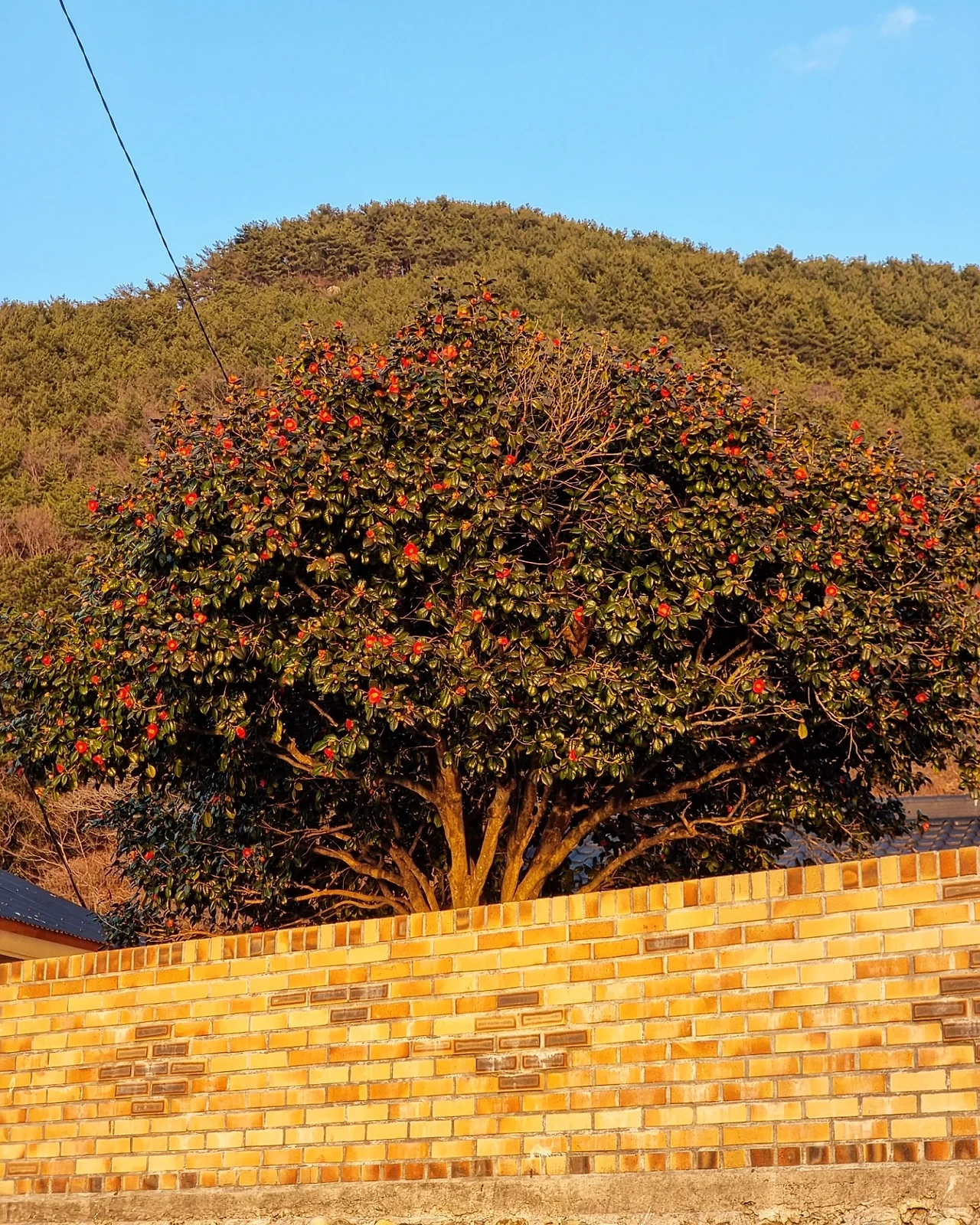 담장 너머로 큰 동백나무 한 그루가 심겨져 있다.