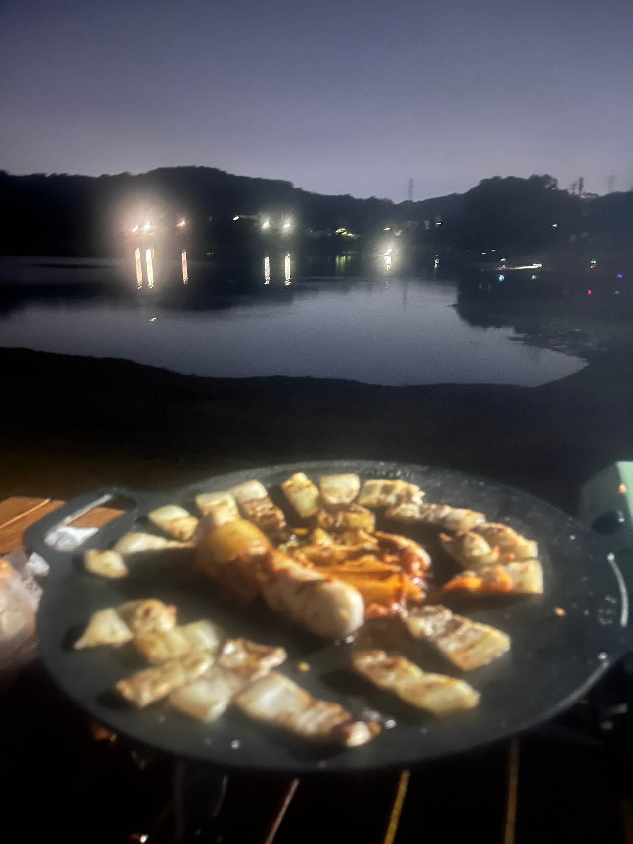 "캠핑의 묘미는 당연히 삼겹살이지!" 우리는 돼지기름에 볶아낸 김치와 함께 삼겹살을 맛있게 구워 먹었다. 맥주 한 잔을 곁들이며 그동안 못다 한 이야기를 나누었다. 일에 치여 바쁘게 지내던 일상에서 벗어나, 여기서는 시간이 천천히 흐르는 듯했다. 저수지의 물소리와 숲에서 들려오는 바람 소리는 우리의 대화에 고즈넉한 배경음이 되어주었다. 비록 모기에게 나의 피를 조금 헌혈했지만, 그것조차도 큰 문제는 아니었다.