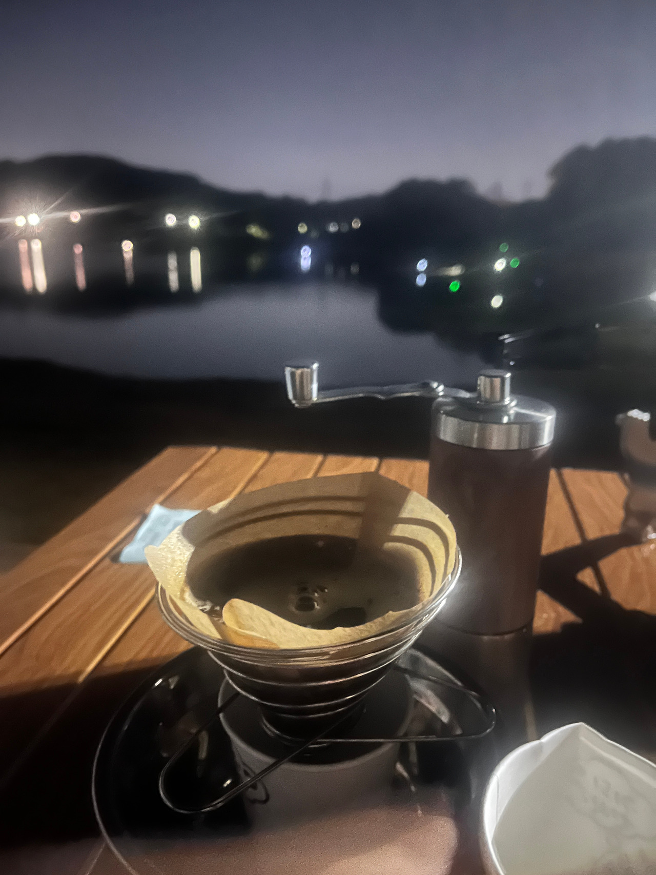 캠프파이어를 피우고, 챙겨 온 원두를 드립퍼에 넣어 드립커피를 준비했다. 커피 향이 반짝이는 저수지의 물결과 하늘에서 쏟아지는 별들과 함께 춤을 추며 나의 콧속으로 스며들어왔다. 세상에 이런 행복이 있을까 싶을 정도로 그날 그 시간만큼은 행복했다.