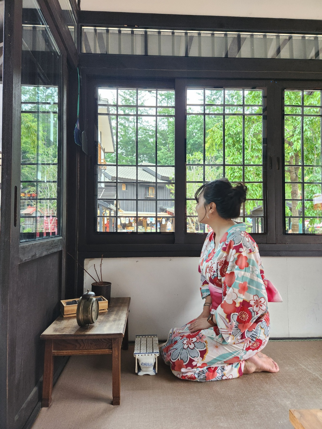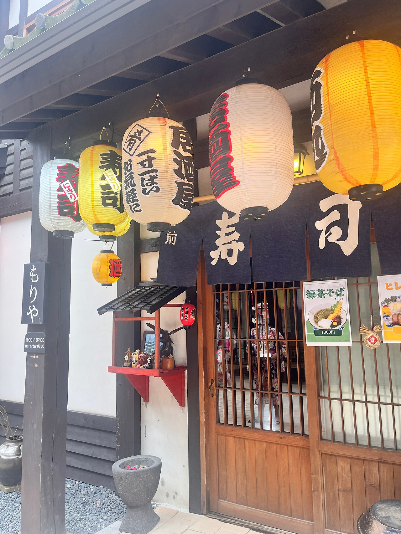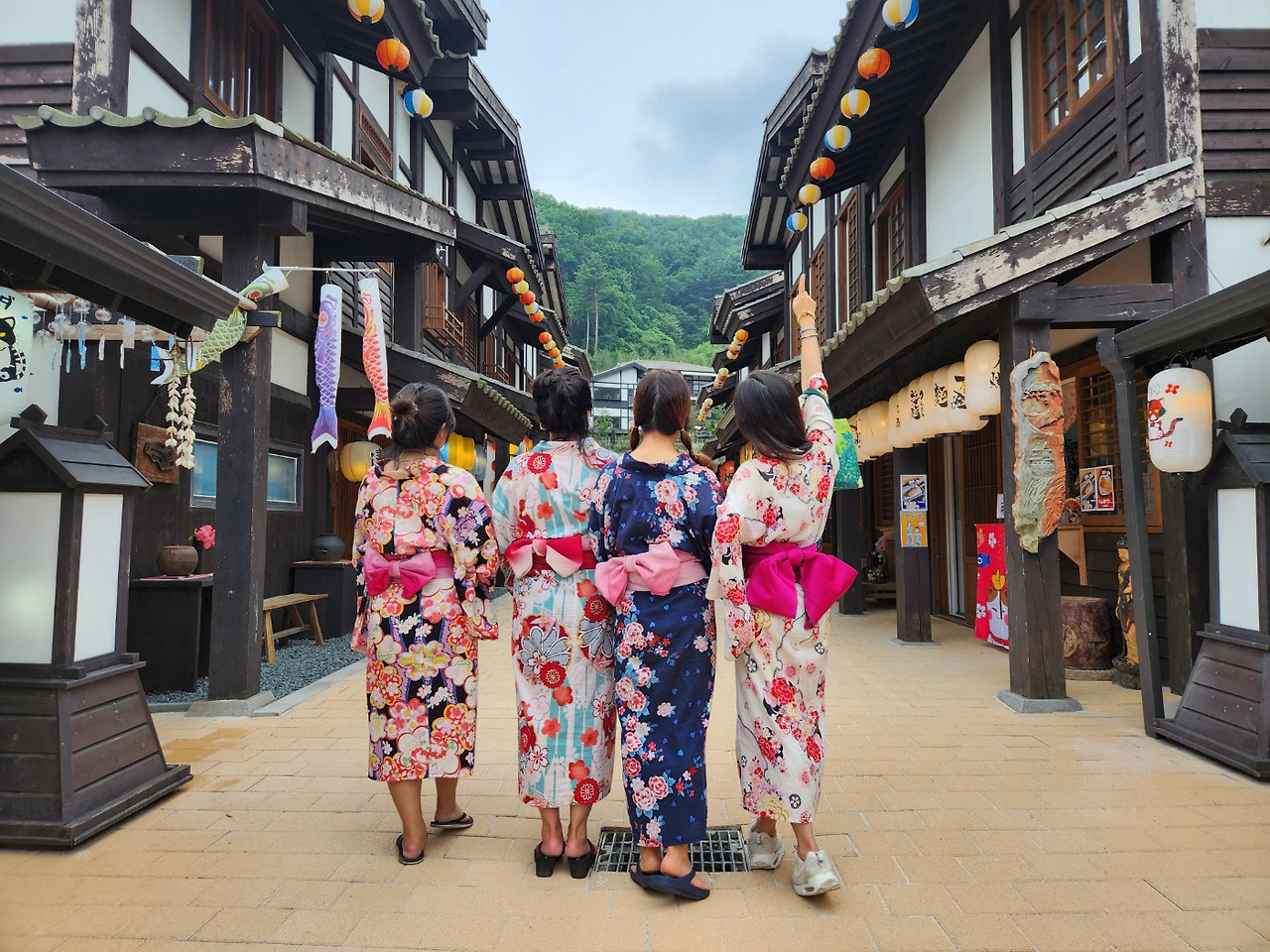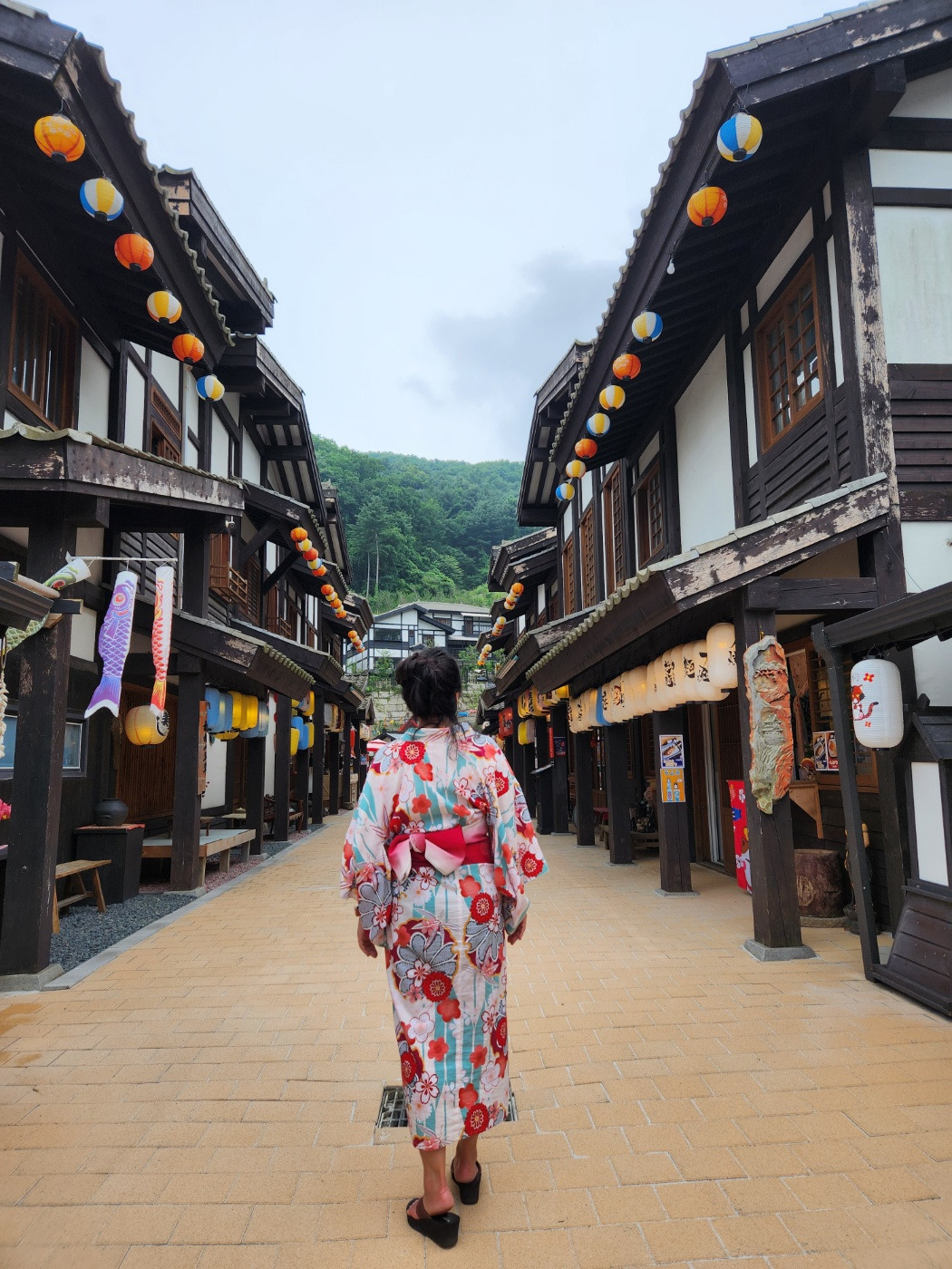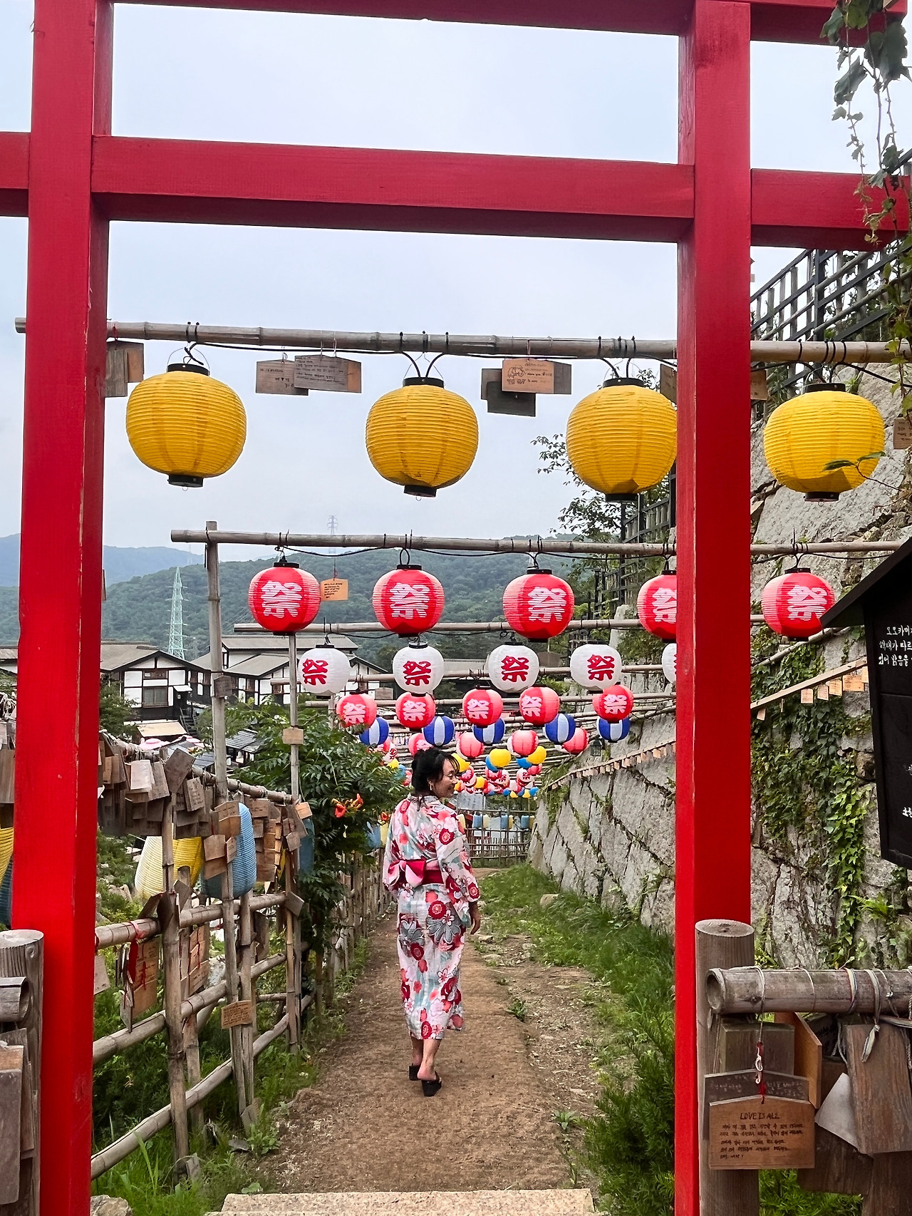 입구에 들어서자마자 일본에 와 있는 듯한 기분이 들었다. 정류장에는 일본어로 된 입간판이 있어, 마치 일본의 작은 마을로 데려다줄 것 같은 분위기의 작은 버스 정류장이 잘 꾸며져 있었다. 입구에서 친구들과의 추억사진 한 장 남기고 우리는 모리의상실에서 기모노를 착용하고 밖으로 나왔다.