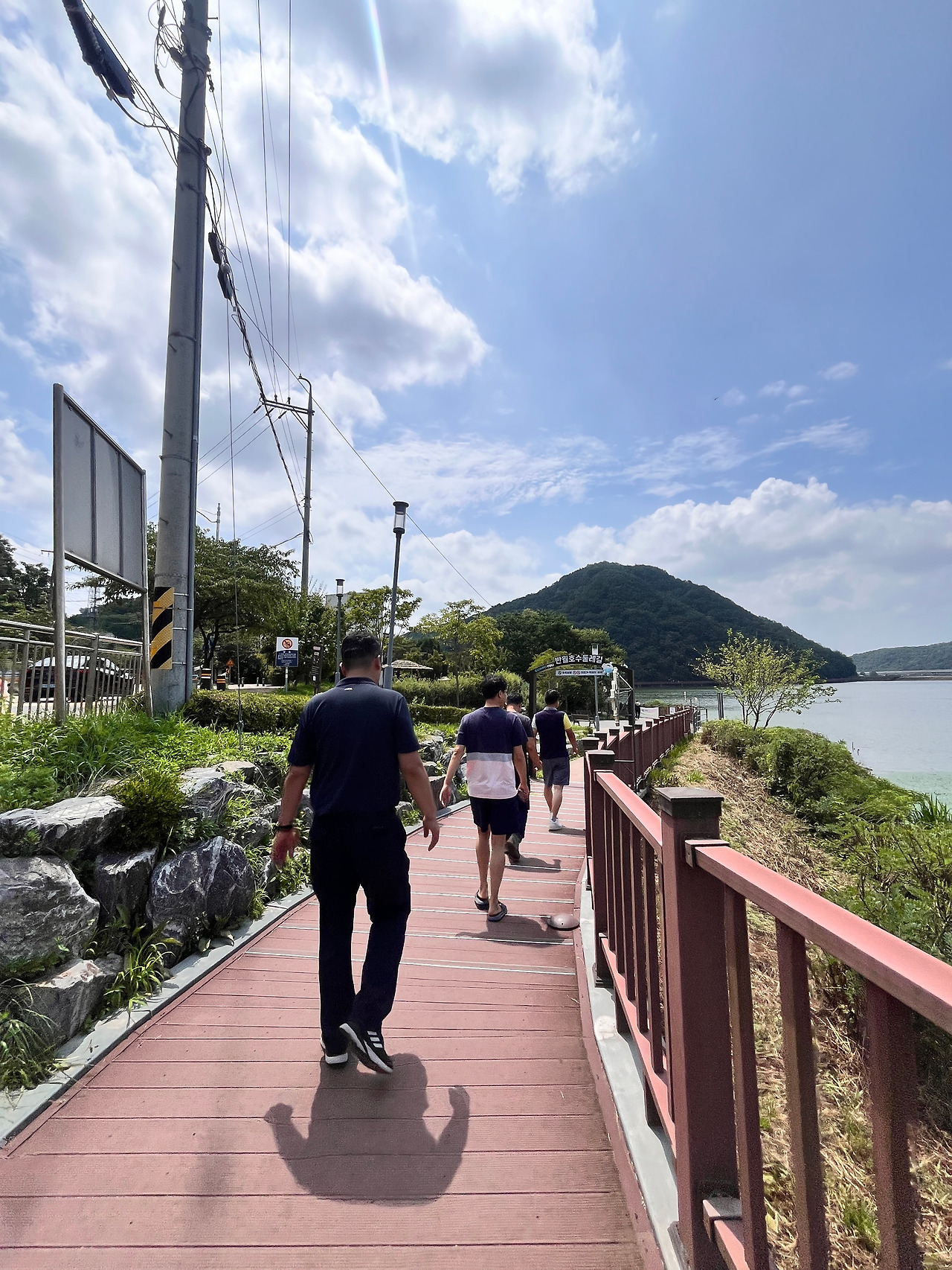 나는 조금 일찍 도착하여 반월저수지 한 바퀴를 산책하기로 했다. 여름날씨에 덥고 찌뿌둥하지만 하늘은 가을날씨처럼 구름이 높고 아름다웠다. 청명한 하늘 아래의 저수지는 잔잔하다 못해 고요했고 더운 날씨에도 저수지 둘레길을 한바뀌 돌아 식당에 도착했다.