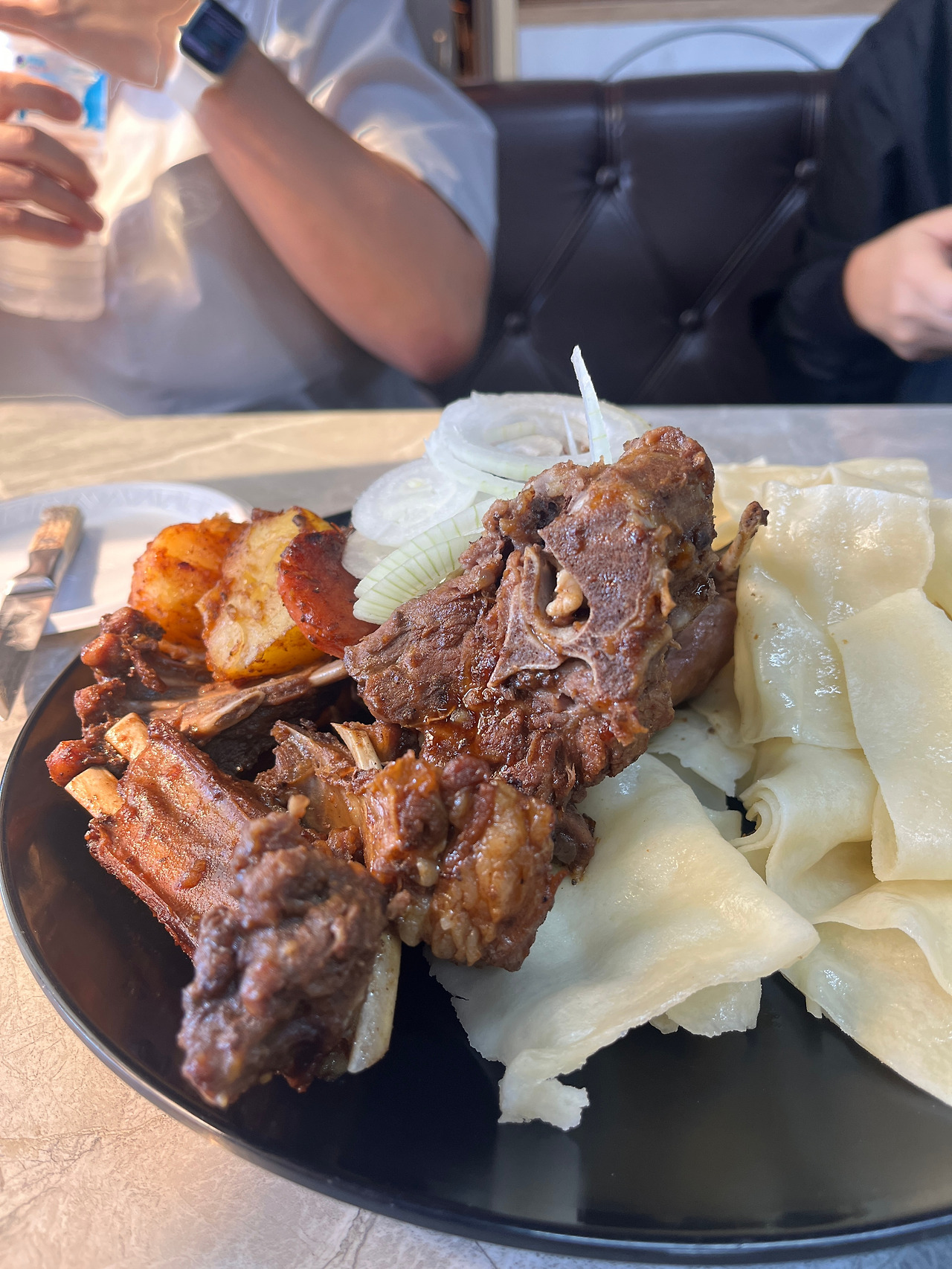 오늘의 목적지는 욜링암(Ёлын Ам)이었다. 가기 전, 시내에 들러 장을 보고 인근식당에서 점심을 먹기로 했다. 점심 메뉴는 몽골에서 귀한 손님에게 대접하는 음식인 ‘진비’, 몽골 전통 양갈비찜이었다. 밀가루 반죽으로 만들어낸 부침개도 곁들여 나왔다. 가이드 자야는 우리에게 특별한 대접을 하고 싶었나 보다, 하지만 우리의 입맛에는 잘 맞지 않아 많이 남기게 되어 미안했다.