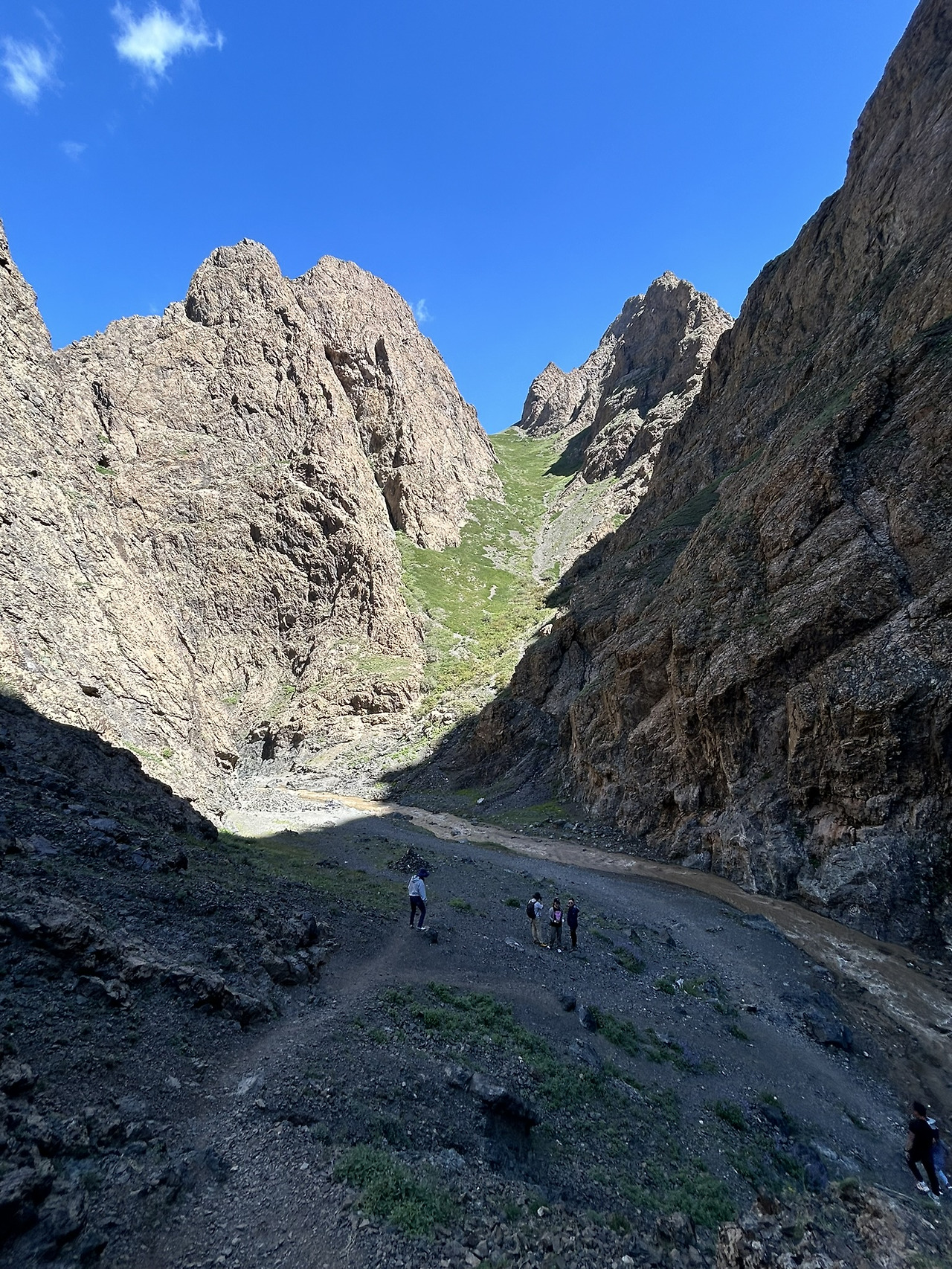 점심을 마친 후, 다시 오프로드를 달려 욜링암 근처 숙소에 도착했다. 가이드는 추운 날씨를 대비해 긴바지와 긴팔 옷을 입으라고 조언해 주었다. 옷을 챙겨 입고 욜링암으로 향했다. 비가 온 뒤라 계곡을 따라 들어가는 길은 파여 있어 차량이 심하게 흔들렸다. 마치 롤러코스터를 타는 기분이었다. 가는 길에 앞서가던 차가 길에 빠져 옴짝달싹 못하고 있었고, 그 차가 겨우 빠져나간 뒤에야 우리의 차량도 협곡으로 다시 나아갈 수 있었다. 가는 중간에 몽골인 연인이 더위에 걸어가는 모습이 안쓰러워 태워줬다.