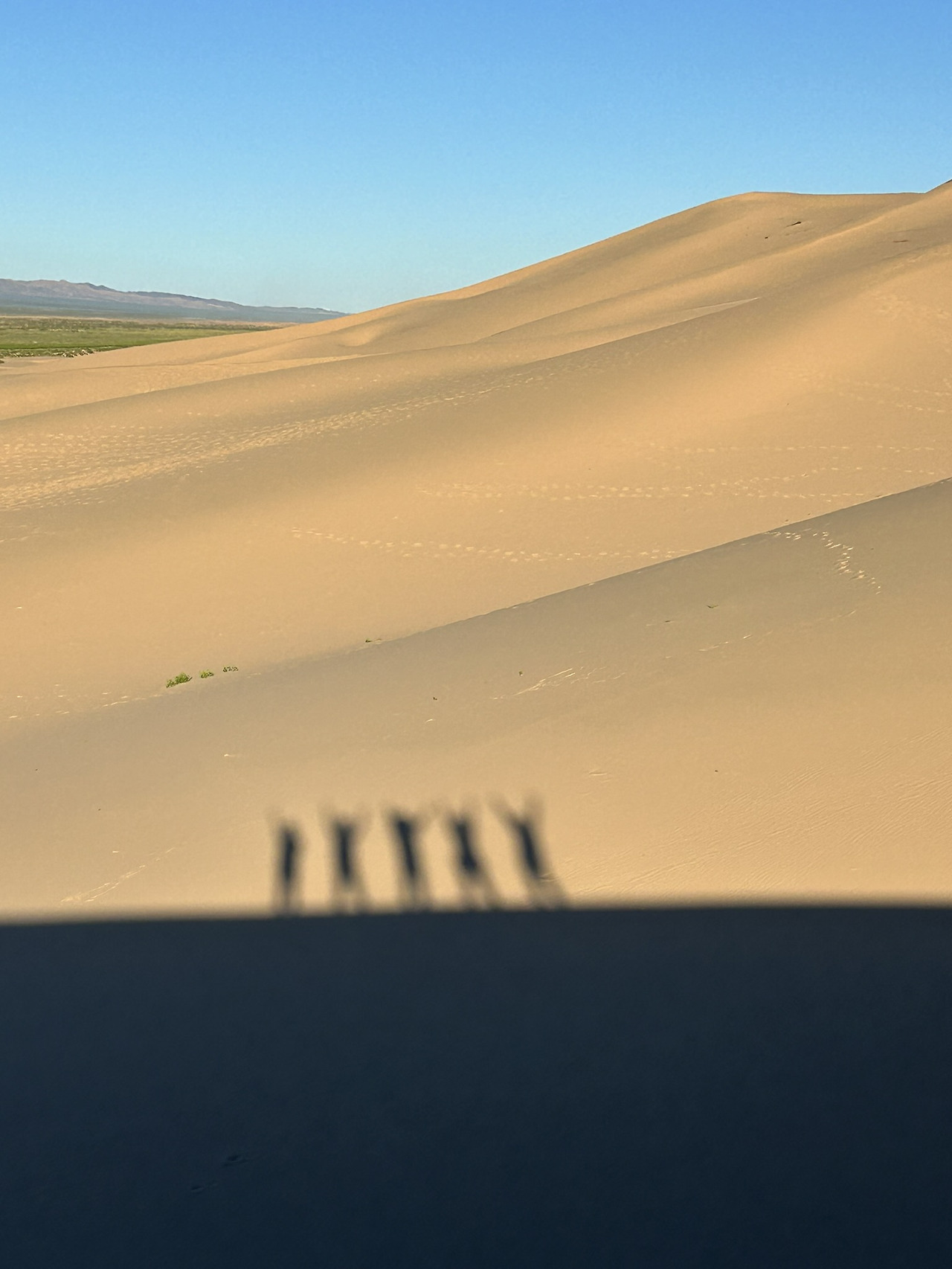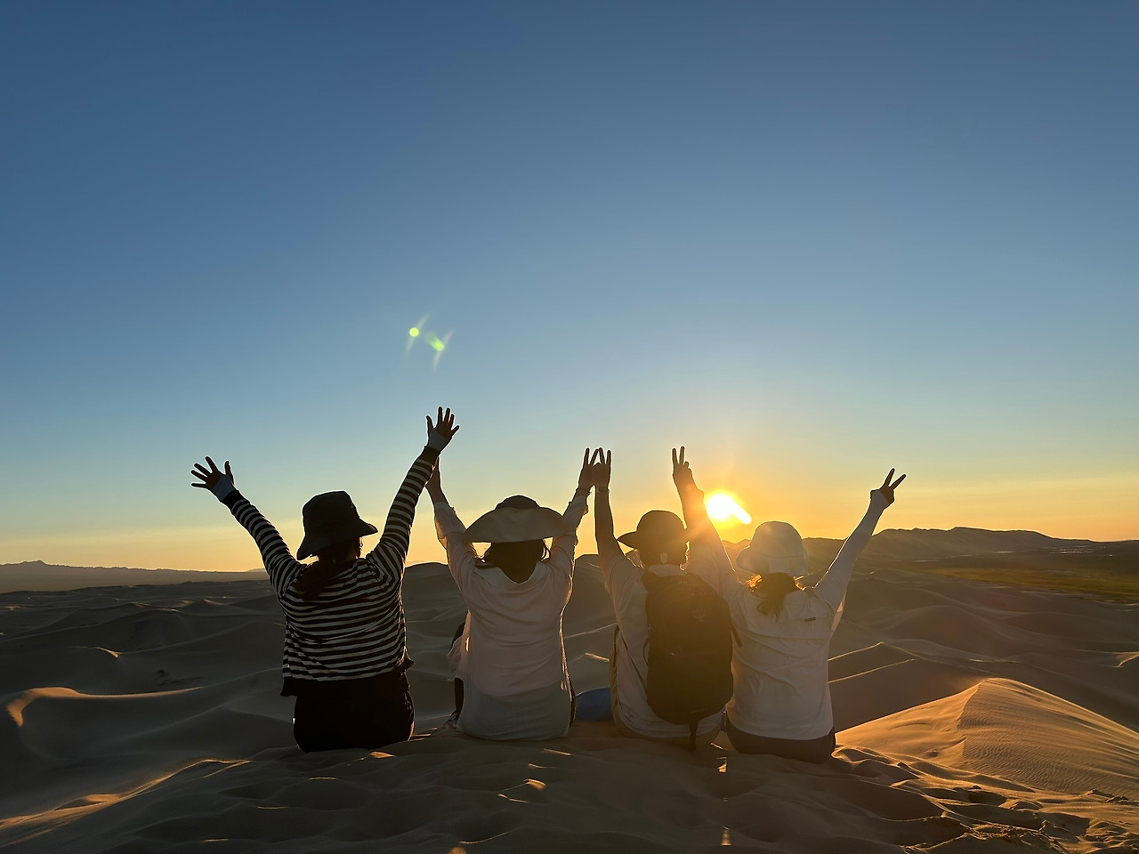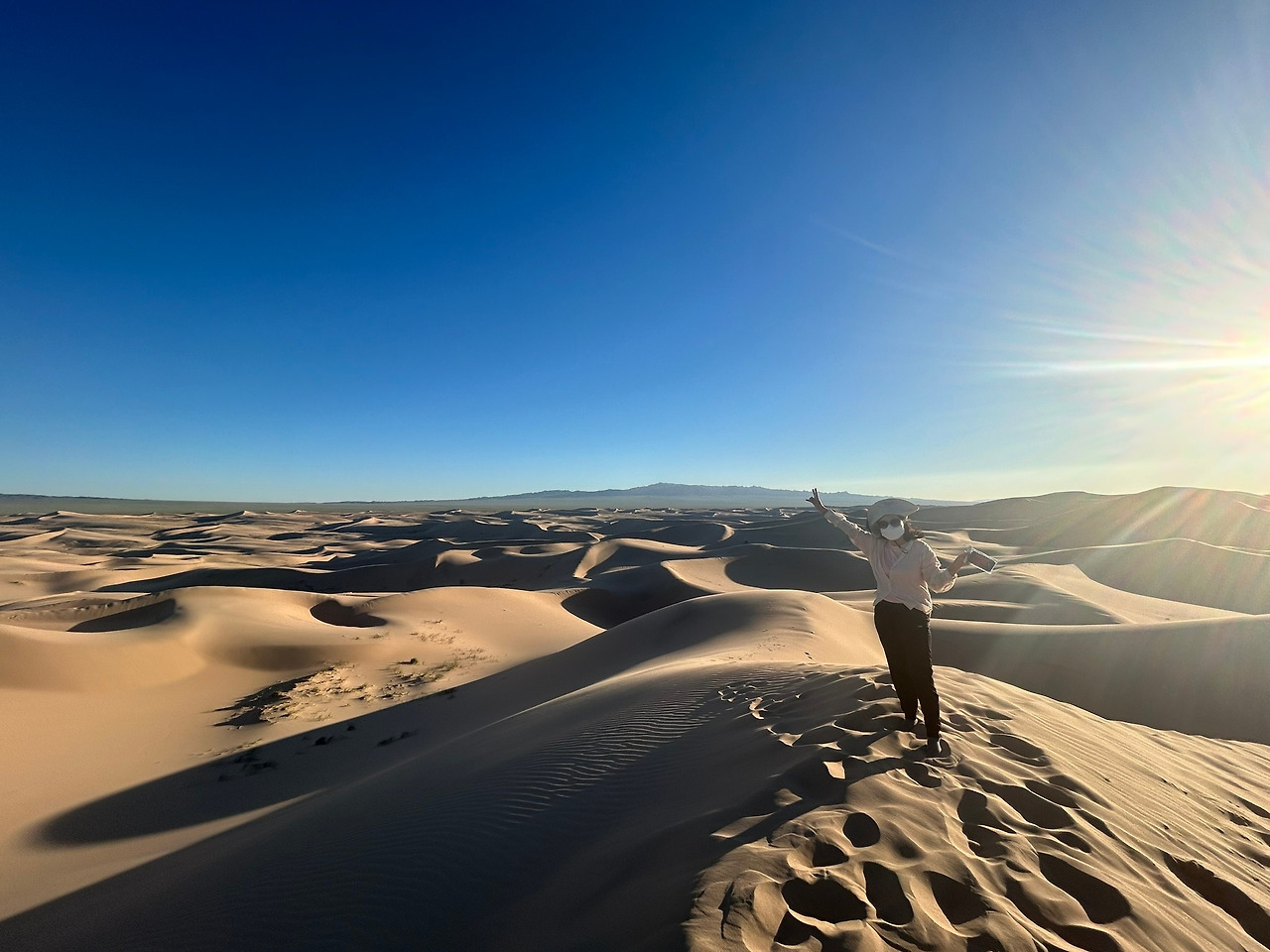 고비사막의 모래언덕은 그 광활한 풍경 속에서 마치 시간이 멈춘 듯한 고요함과 젊은 친구들의 깔깔대는 웃음소리만이 고요함을 깨고 있었다. 끝없이 펼쳐진 모래바닷속에서 하나둘 솟아오른 모래언덕은 그저 바람에 의해 쌓였지만 나에게는 경이로움 그 자체다. 언덕 위에 서서 사방을 둘러보면, 황금빛과 붉은 노을로 모래가 일렁이며 하늘과 맞닿은 지평선까지 이어져 있다. 그 웅장한 모습은 마치 세상 어디에도 존재하지 않는 다른 세상에 와 있는 듯했다.