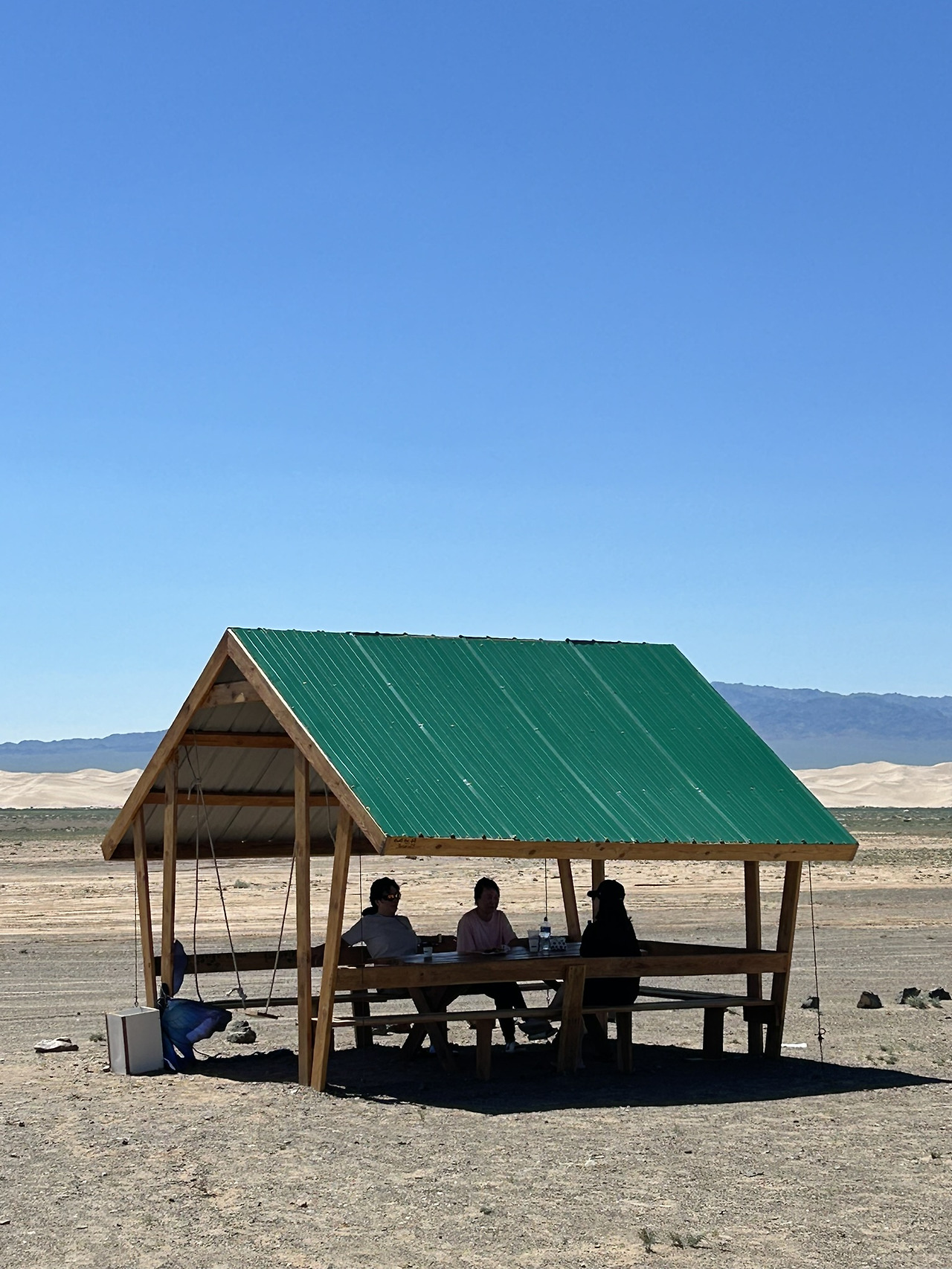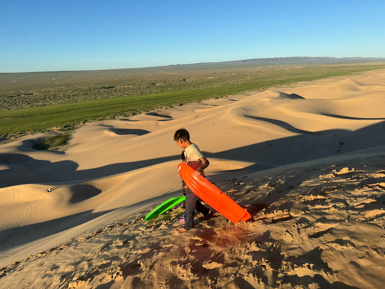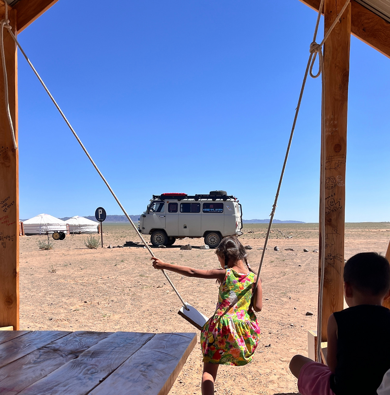 졸다가 깨다를 반복하니, 어느새 홍고르엘스 고비사막에 도착했다. 가이드는 석양이 아름다운 사막에서의 모래썰매 체험을 안내해 주었다. 저녁까지는 자유시간이었다. 우리는 게르 옆에 설치된 야외 테이블에 앉아 잠시 여유를 즐겼다. 시원한 바람이 불어오는 그곳에서 음악을 들으며 사색에 잠겼다. 다리를 뻗고 앉아 꾸벅꾸벅 졸기도 하고, 시원한 바람을 맞으며 이런저런 이야기를 나누던 중, 꼬마 친구들이 다가왔다. 게르 주인의 자녀들로 보이는 여섯 살쯤 된 누나와 남동생이었다.