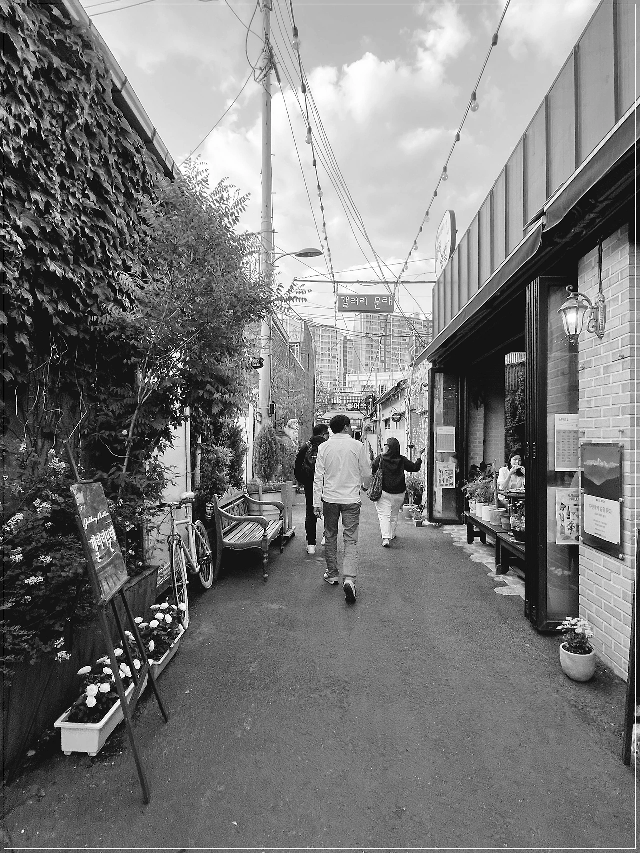 현지인들의 일상과 역사를 담은 작품도 많다. 골목길을 걷다 보면 녹슨 철통에 그림을 그려 새로운 작품을 만들고 그곳에 노란색 꽃 금계화와 초록 식물들을 심어 멋들어진 대형화분으로 거리를 장식했다. 폐기물을 재활용한 예술작품이 회색빛 골목에 생기를 불어넣었다. 골목 사이사이에는 작은 갤러리가 많아 예술을 산책하듯 즐기기엔 흥미로운 장소다. 나는 조광기 작가의 “자연에서 길을 묻다”전시를 감상하러 갔다. 그림에 대한 전문지식은 부족하지만 작품의 주제는 인간성의 회복이라는 화두에 흥미를 느꼈다. ‘人中天地一 (인중천지일)’란 말은 사람 안에는 하늘과 땅이 있다는 뜻이다. 이 말은 우리 안에는 우주 전체가 존재한다는 아이디어를 담고 있다. 작가는 이를 통해 혼탁한 세상에서 상실되어가는 인간의 본질을 회복하고자 했다. 작품을 통해 천지 자연과 하나되는 인간의 모습을 그려냈다. 그 속에서 나는 자신의 존재와 가치에 대해 생각해 보며 이 작품을 통해 작가가 전하는 메시지는 우리가 자연과 하나가 되어 살아가야 함을 느끼게 해주었다. 나도 내 삶 속에서 그런 큰 가치를 찾아보고자 한다