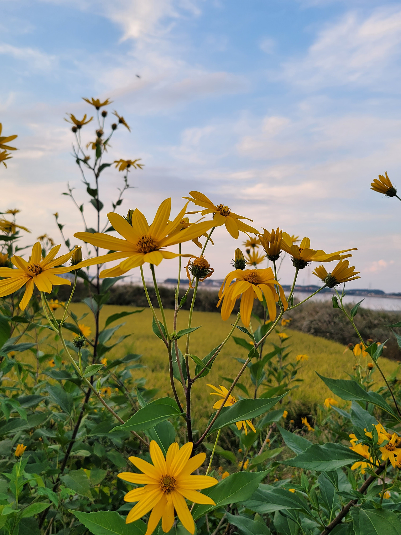 하늘하늘 코스모스인 듯 아닌듯한 노란색 꽃 금계국이 피어있는 측도, 바다와 어우러져 파란 하늘과 노란색으로 물든 바다는 더욱 아름다웠다.