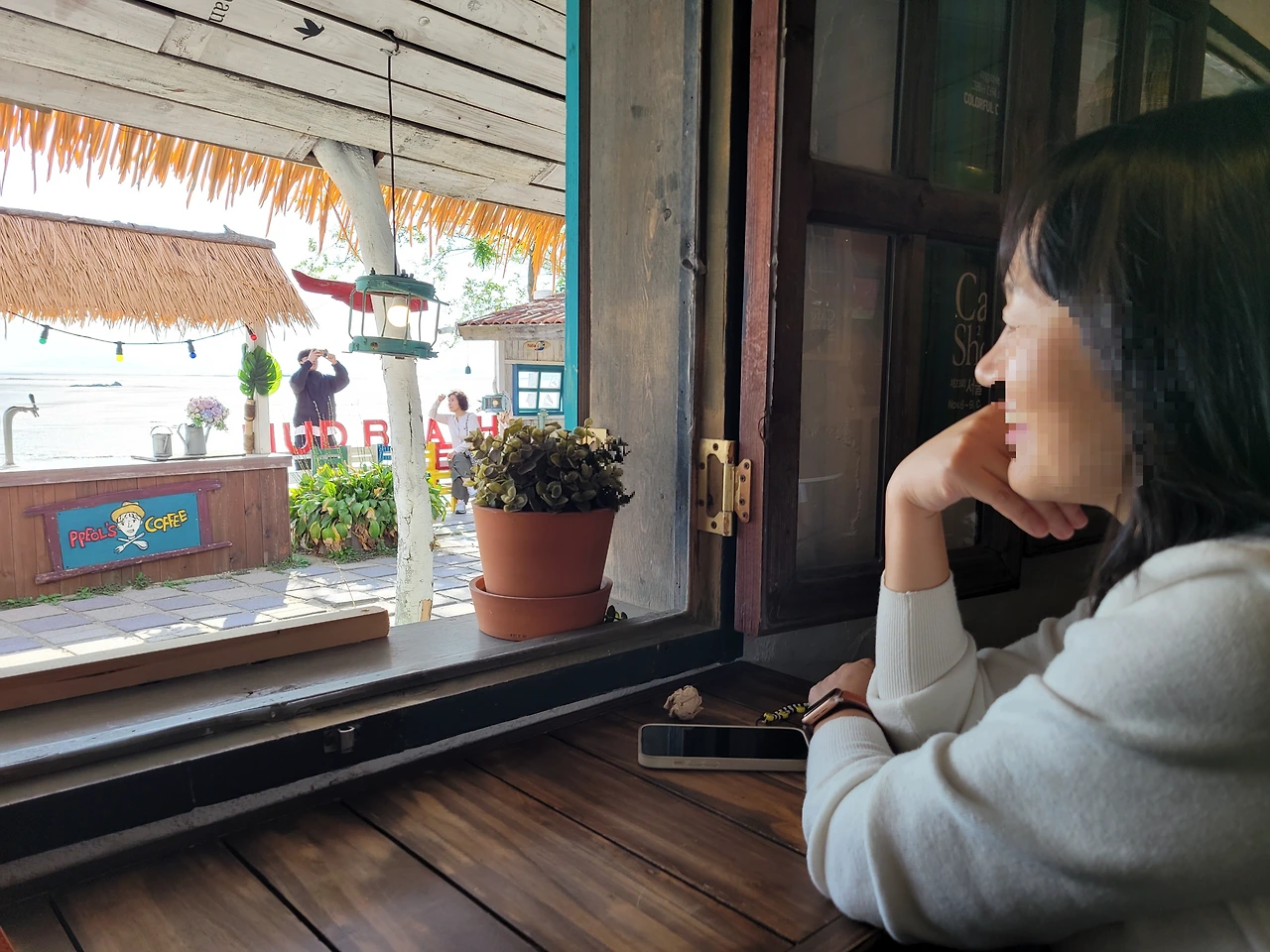 목재와 유리로 이루어진 아늑한 실내와 바닷가 앞에 야외테이블이 이국적인 인테리어로 외국에 온 것 같은 착각이 들었다. 나는 창가 자리에 바깥 풍경이 그대로 보이는 자리에 자리를 잡고 바다를 바라보았다.