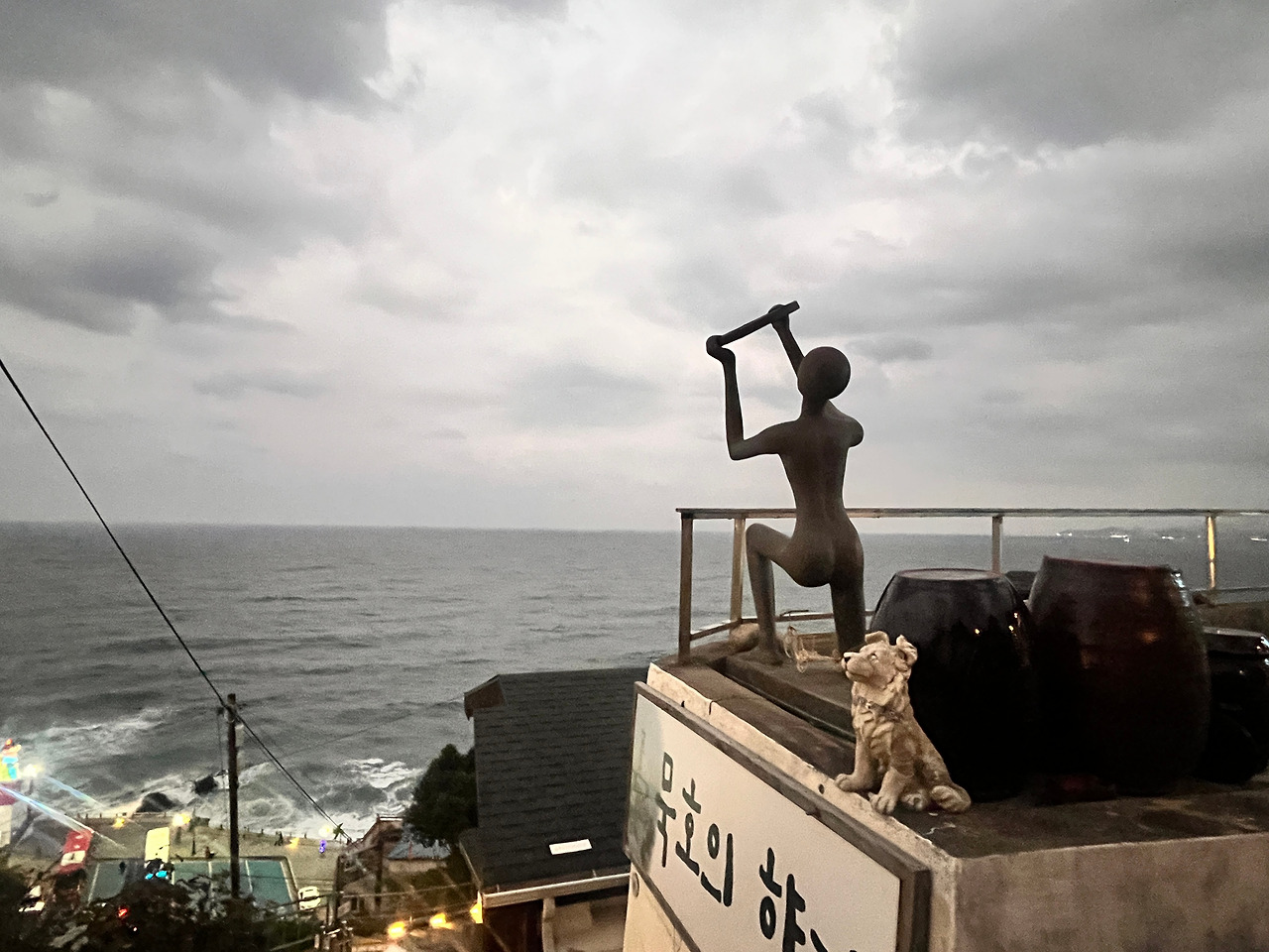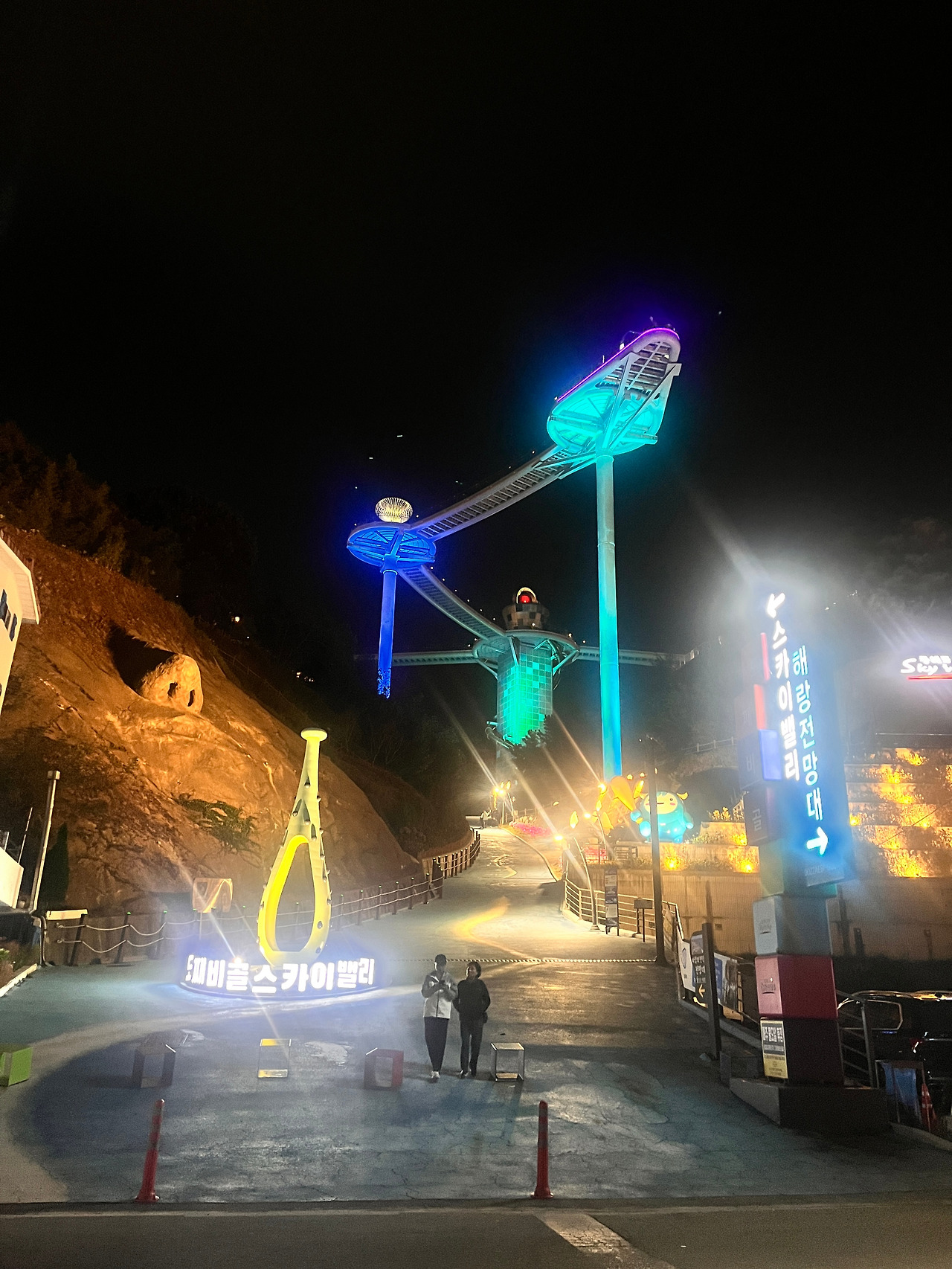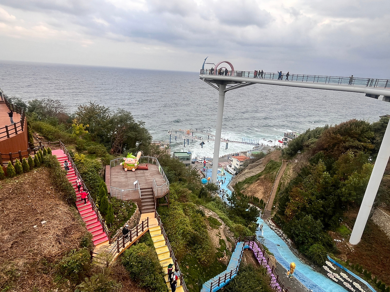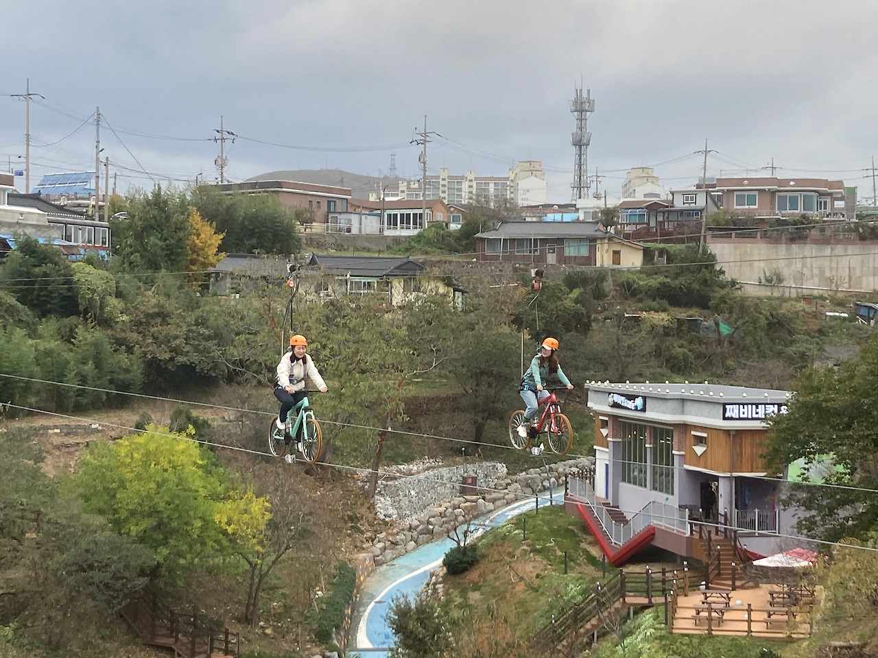 논골담길을 시작하는 곳에 또 하나의 특별한 체험이 기다리고 있었다. 바로 ‘하늘자전거’였다. 로프 위에서 자전거를 타고 달리며 하늘에 떠 있는 듯한 기분을 만끽할 수 있는 곳으로, 동해를 내려다보며 자전거 페달을 밟는 경험은 상상 이상으로 신선했다. 페달을 밟을 때마다 바닷바람이 얼굴을 스치고, 멀리서 파도 소리가 들려와 마음이 고요해졌다. 파란 물결 위를 날아가는 듯한 이 느낌, 시원한 수평선이 손에 닿을 듯 가까워지는 순간이 인상적이었다.