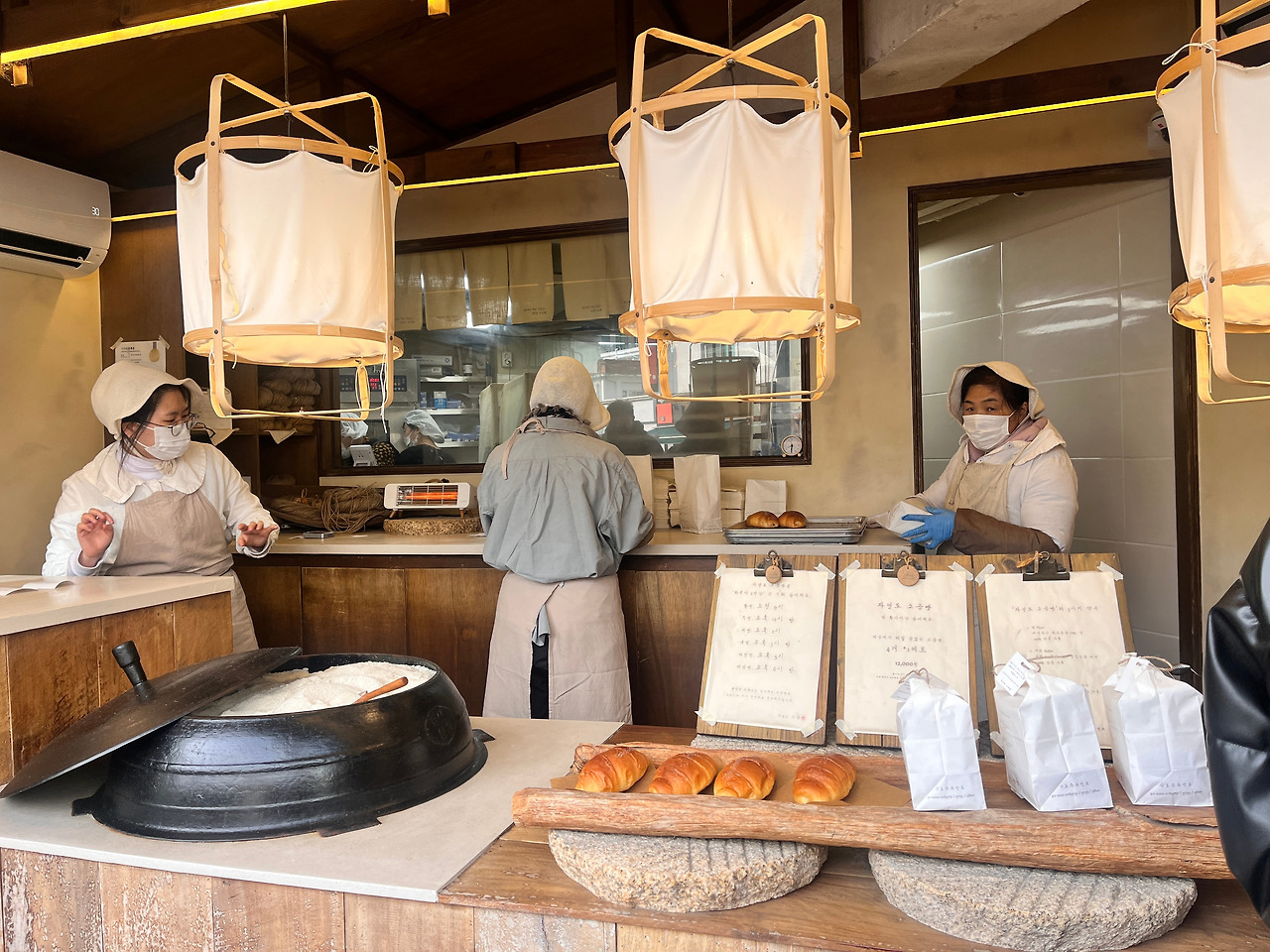사람들이 줄을 길게 서 있길래 우리도 자연스레 동참했다. 가게 입구에 오랜만에 보는 가마솥과 맷돌 위에 빵이 놓여있어 찐빵집인가 했지만, 알고 보니 고소한 버터 향과 바삭한 식감으로 유명한 소금빵을 전문으로 하는 곳이었다. 갓 구운 소금빵은 촉촉하고 쫀득한 식감으로 정말 맛있었다. 기다림이 아깝지 않았다.