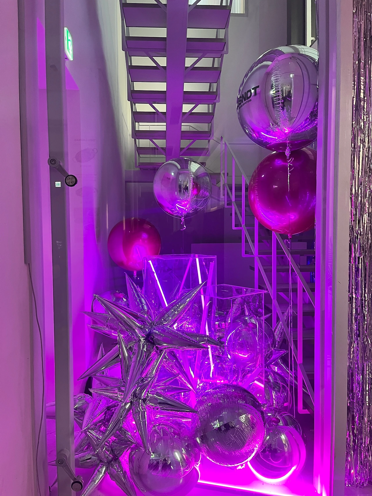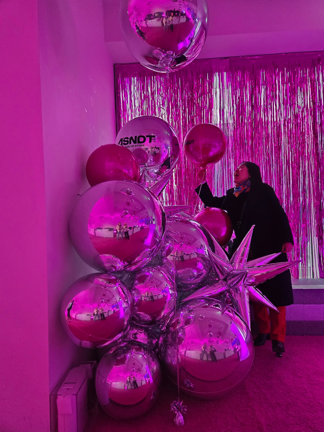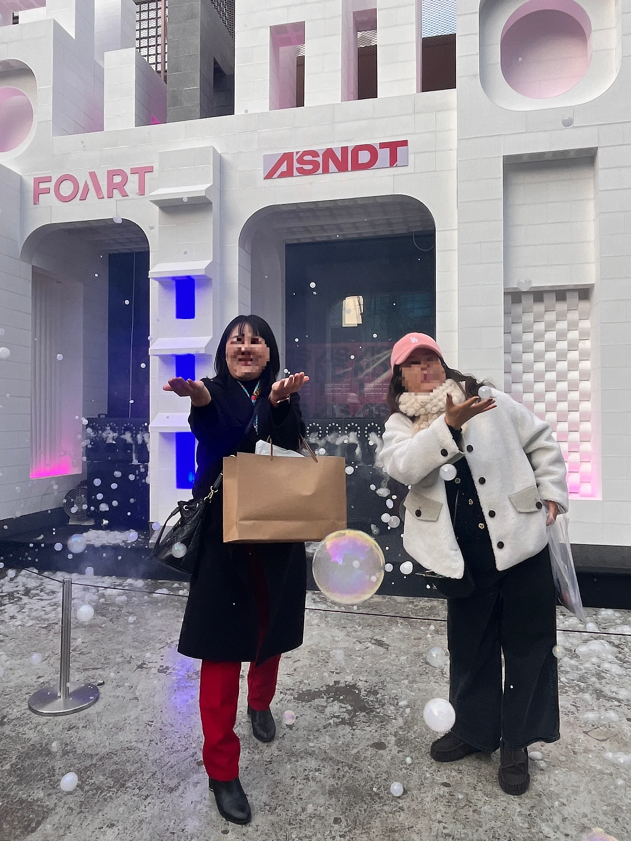 어느새 눈앞에 반짝이는 비눗방울이 떠다니는 곳이 나타났다. "ASNDT : Blaze-up Store"라는 팝업스토어였다. 입구에서부터 동화 속 한 장면처럼 반짝이는 조명과 신비로운 분위기가 우리를 맞아주었다. 안으로 들어서니 음악과 조명이 어우러진 공간이 펼쳐졌고, 크리스마스와 연말의 흥겨운 감성을 그대로 담고 있었다.