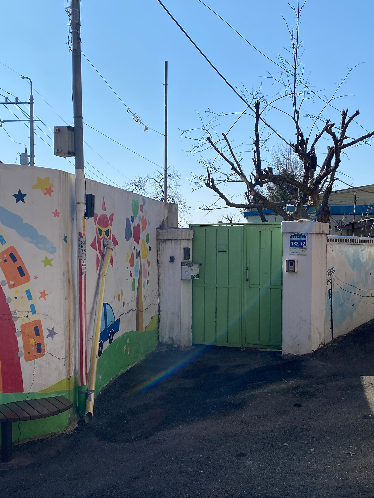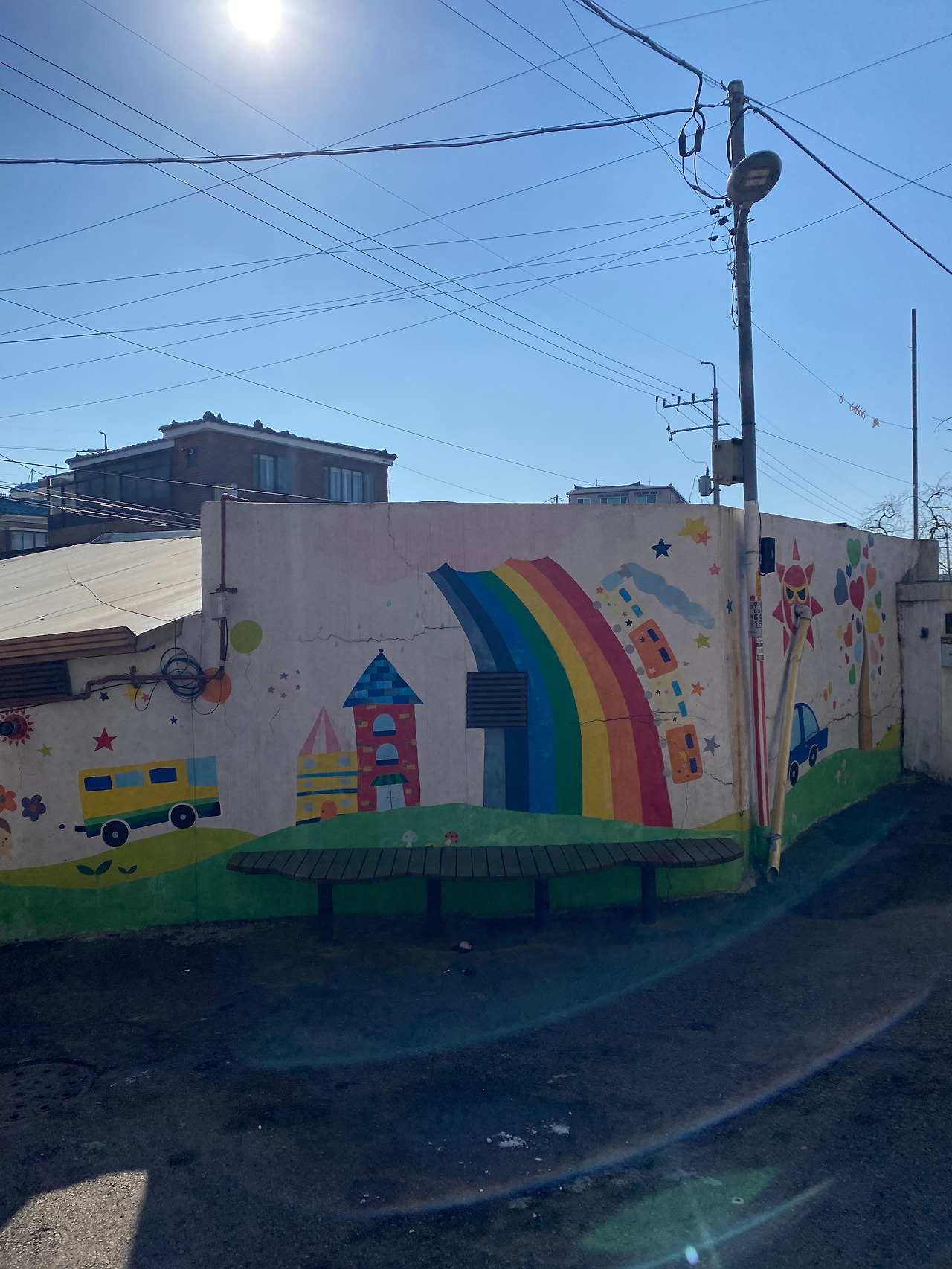 우리가 도착했을 때 이미 몇 분이서 와서 사진을 찍고 계셨다. 그분들이 집 앞에서 사진을 찍는 동안 나와 친구는 먼저 이 무지개 벽화를 찍었다. 왼쪽은 촬영 대기 시간 동안 최우식과 김다미가 사진 찍은 곳, 그리고 오른쪽은 연수와 웅이가 다시 사귄 후에 나온 씬의 배경이다.