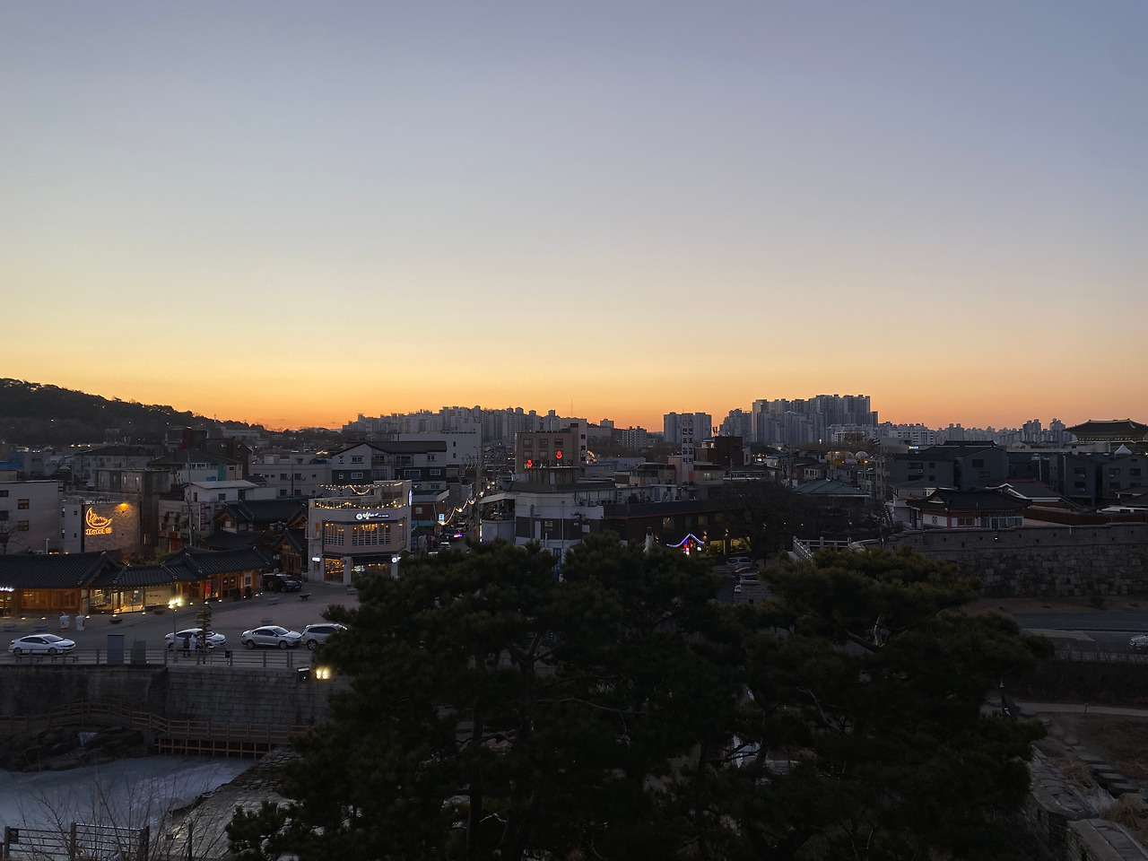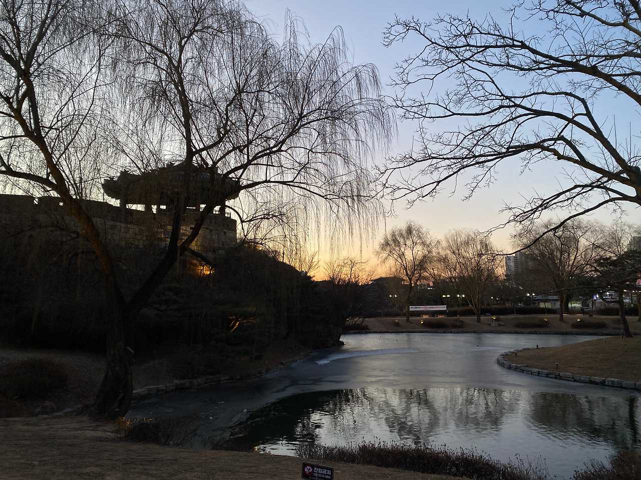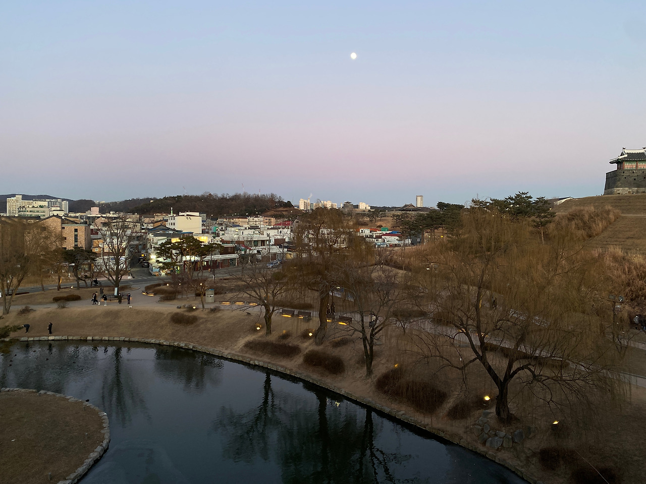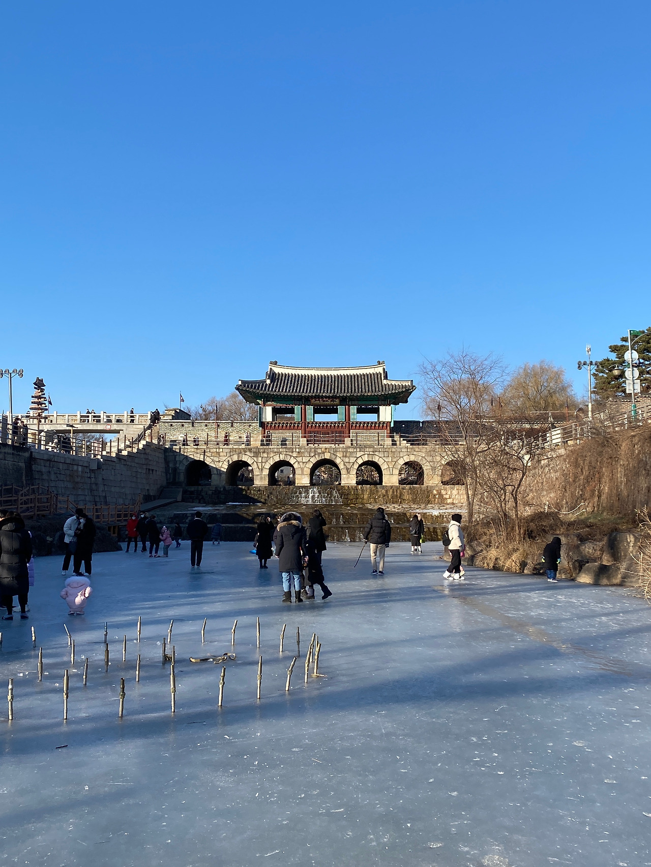 화홍문에도 올라가 볼 수 있었는데 해가 많이 내려온 상태여서 금빛 햇살 아래에서, 얼어붙은 수원천 위에서 스케이트 타고 있는 사람들이 너무나 동화 같았다.