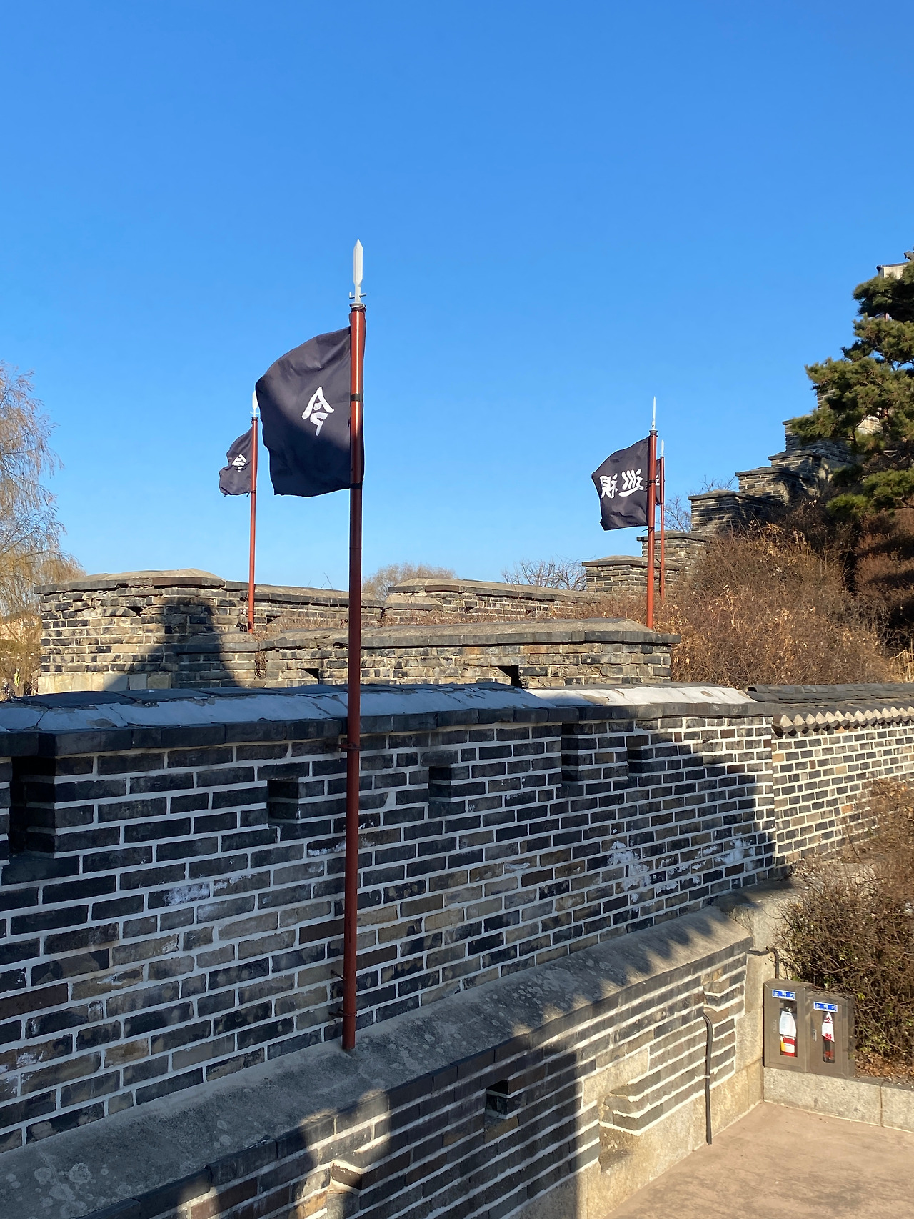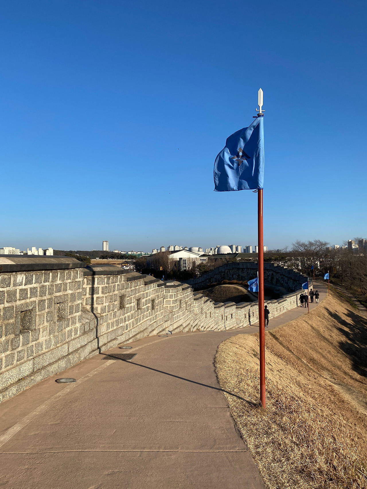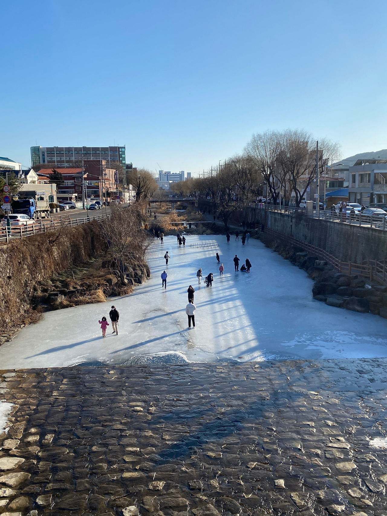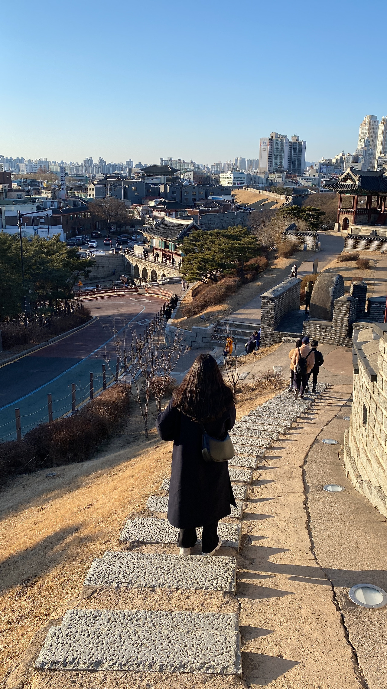 화홍문에도 올라가 볼 수 있었는데 해가 많이 내려온 상태여서 금빛 햇살 아래에서, 얼어붙은 수원천 위에서 스케이트 타고 있는 사람들이 너무나 동화 같았다.