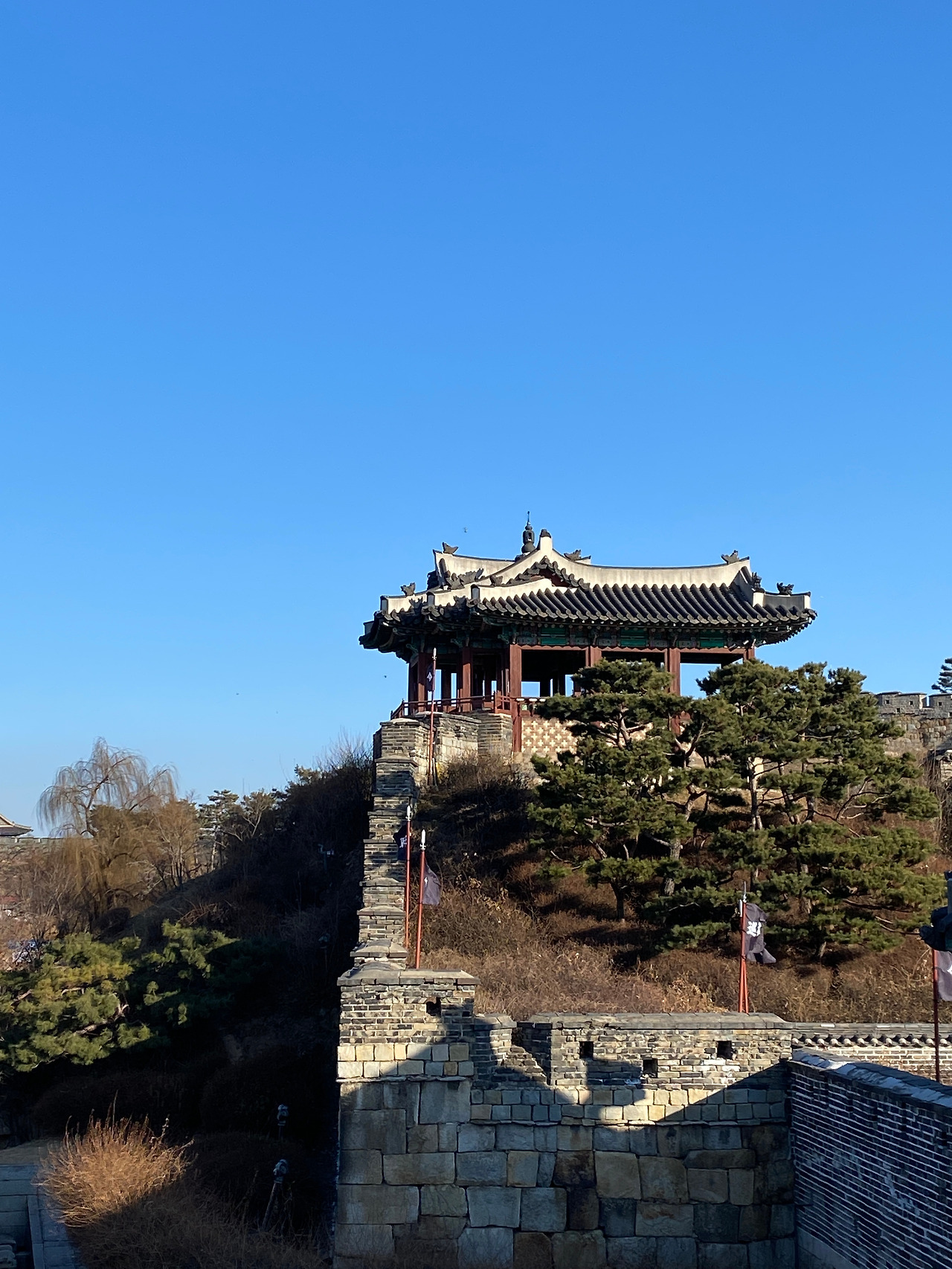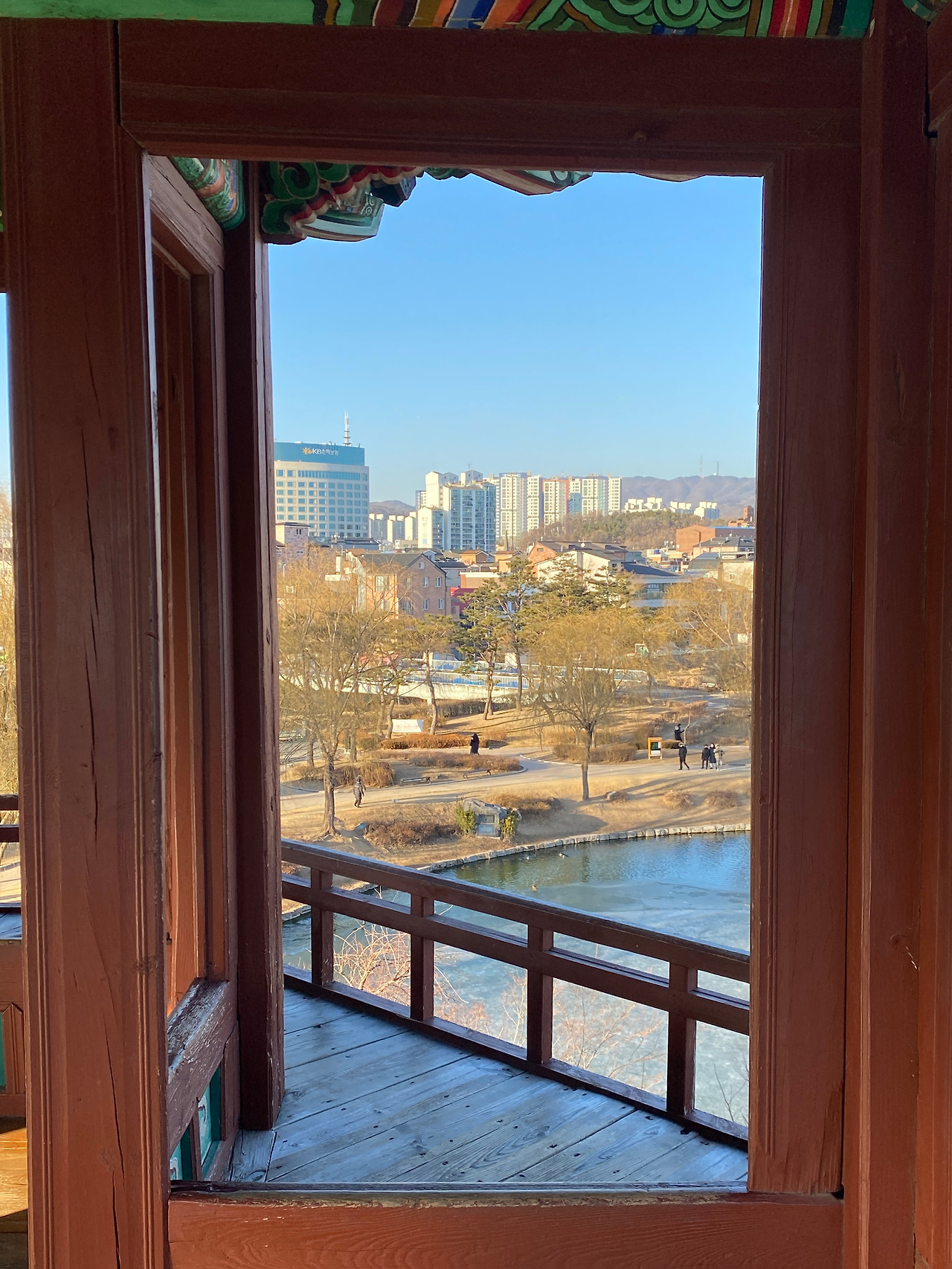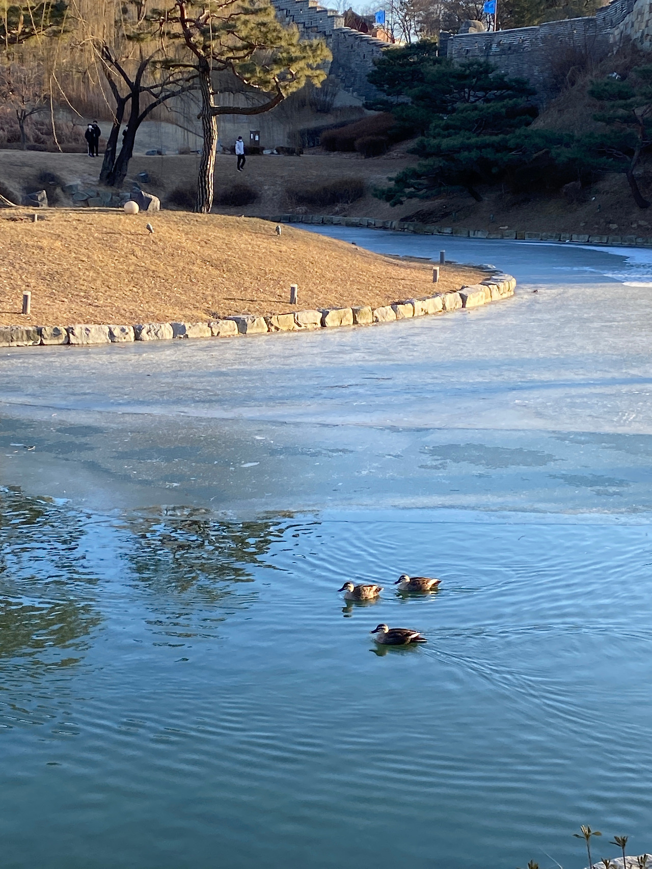 그리고 동북각루에 올라가면 위에서 용연을 내려다볼 수 있다. 정조가 화성행차 시에 휴식을 취했다고 하는데 얼음이 살짝 얼어 있는 것도 그렇고 오리 떼도 그렇고 여기 앉아만 있는 걸로도 절로 걱정이 다 사라질 것 같다는 느낌을 받았다.