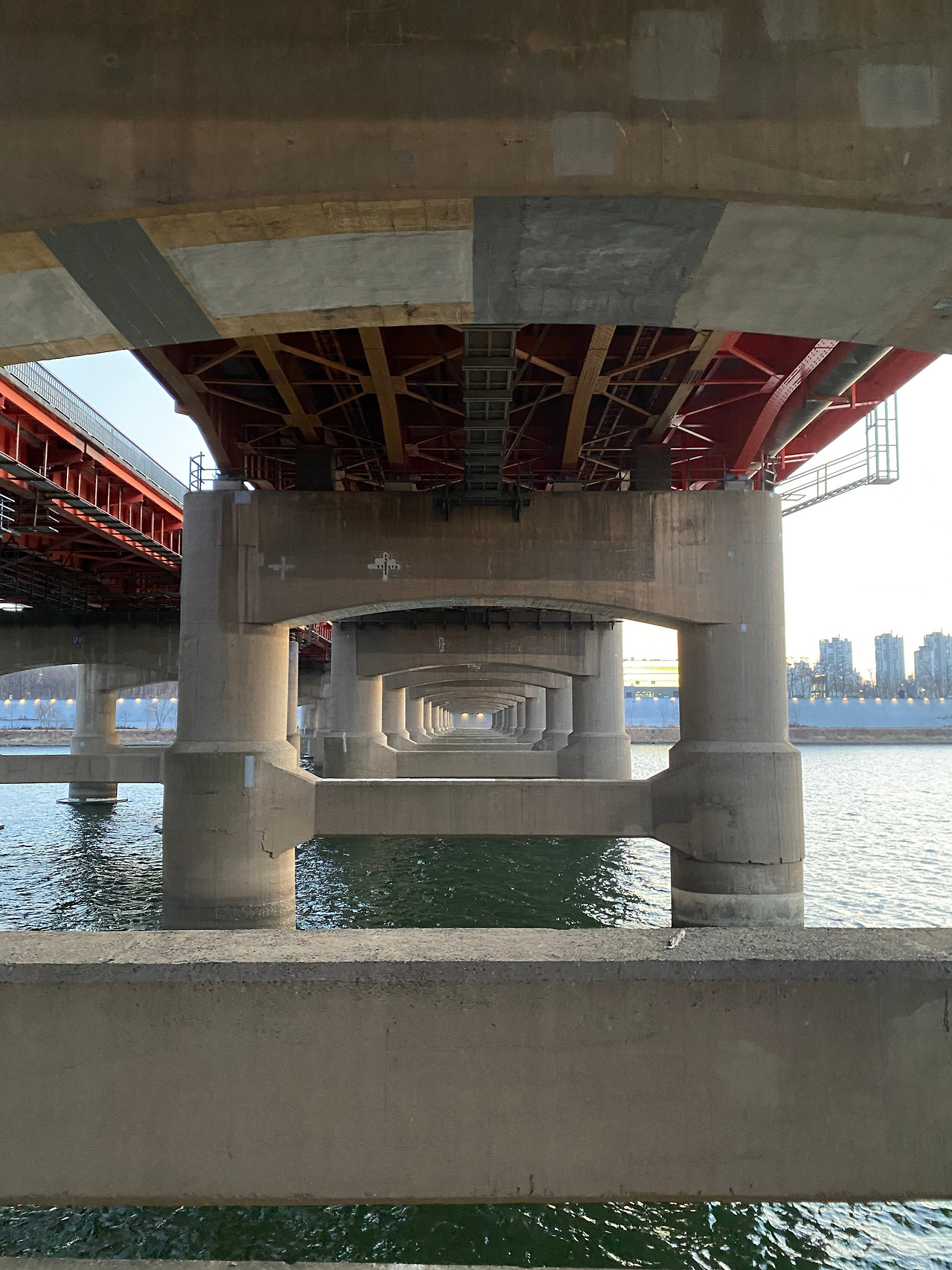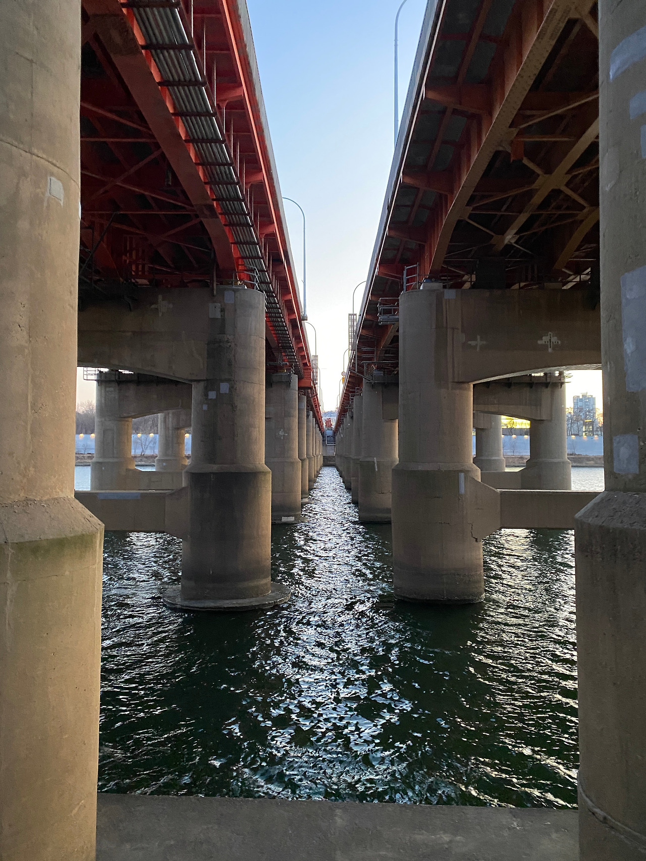 6시 10분쯤을 일몰 시각으로 보고 갔는데 10분이 지났음에도 완전히 어두워지지는 않았다. 아직은 남아있는 해 옆에서 다리 사진을 찍었다. 한강대교 북단에서 찍은 다리 사진이다. 거울에 반사되어 무한히 보이는 듯한 느낌이 들게 해주는 이 다리를 좋아한다.