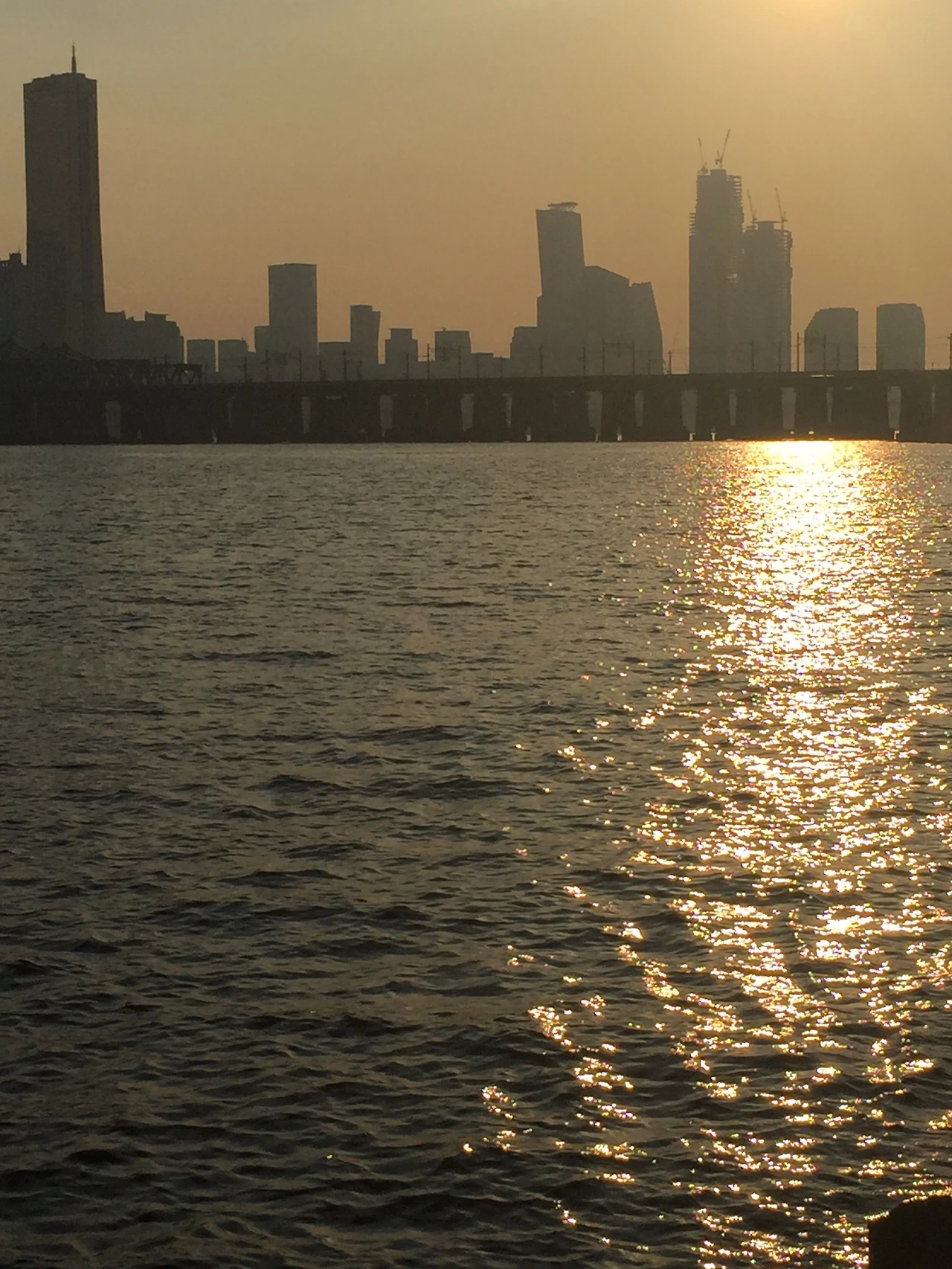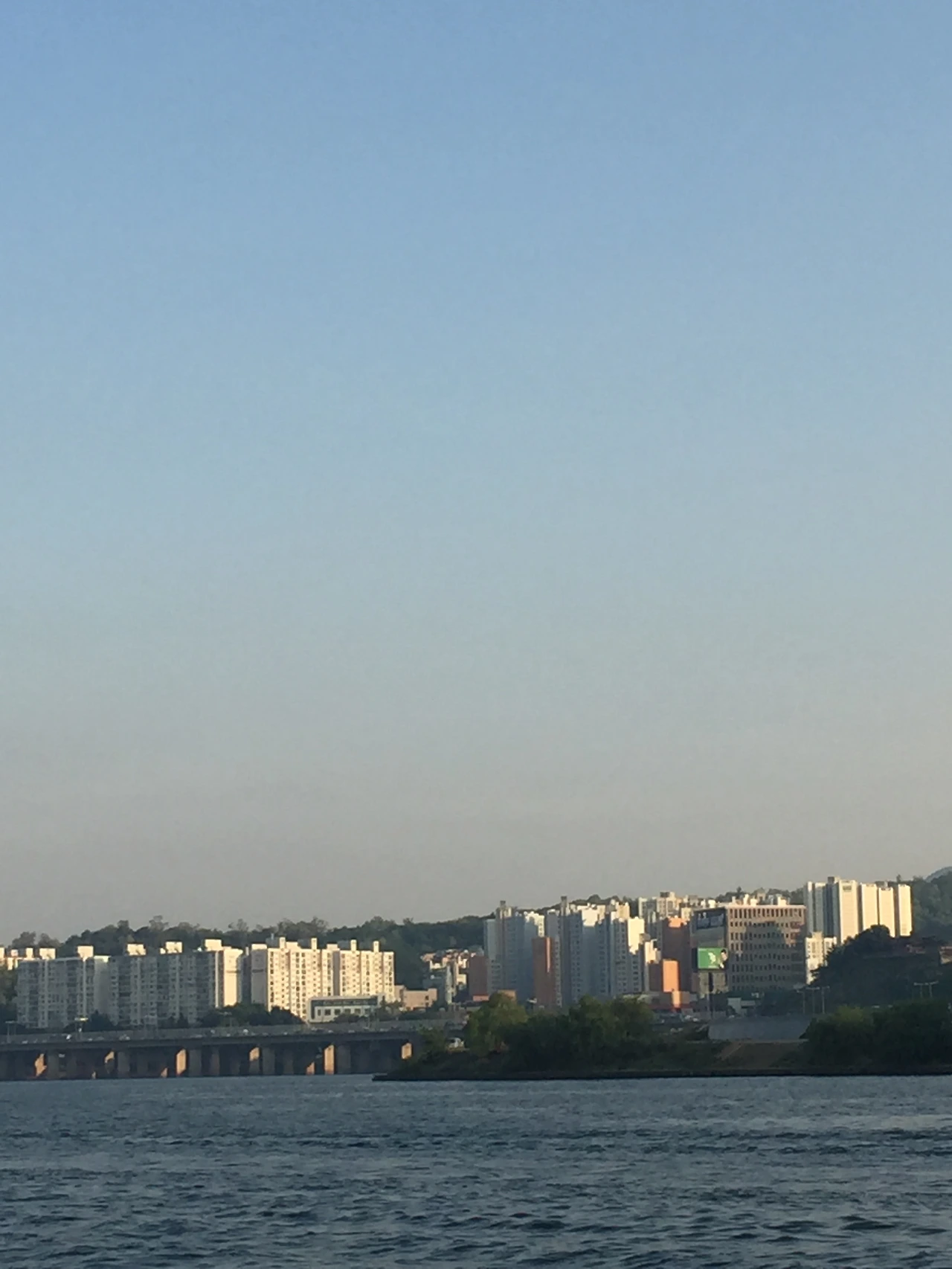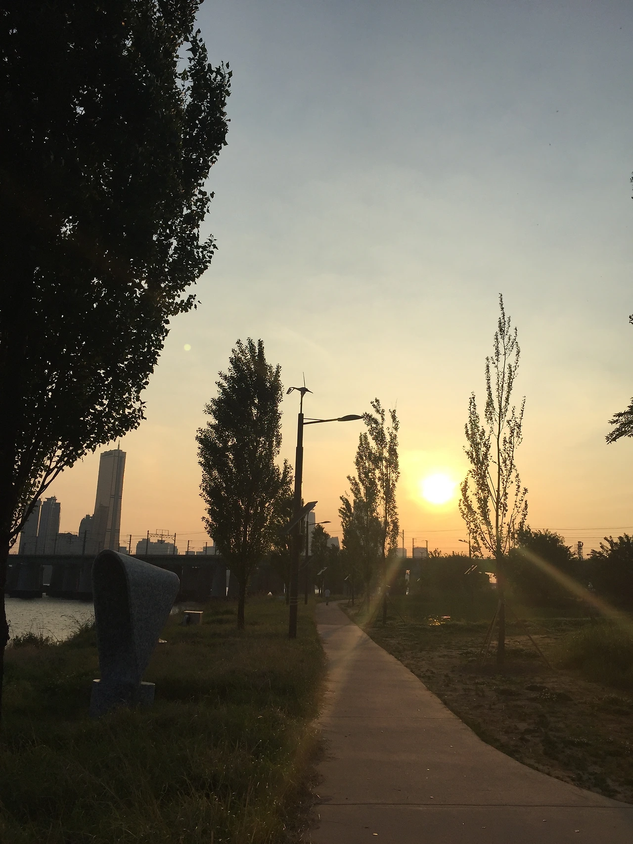 이 장면을 보며 드디어 오늘의 해가 지는 모습을 보는 것도 막바지구나 하는 생각이 들었다. 점점 사라지는 해와 어두워지는 하늘로 인해 한강 물결은 검은색인지 진한 파란색인지 분간할 수 없을 정도가 되었다. 가만히 서서 그 장면을 지켜보았다.