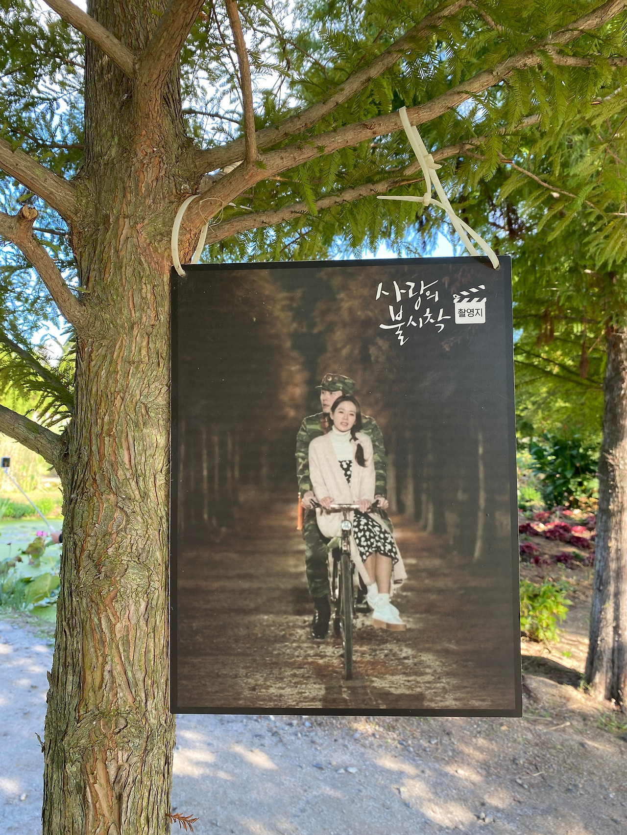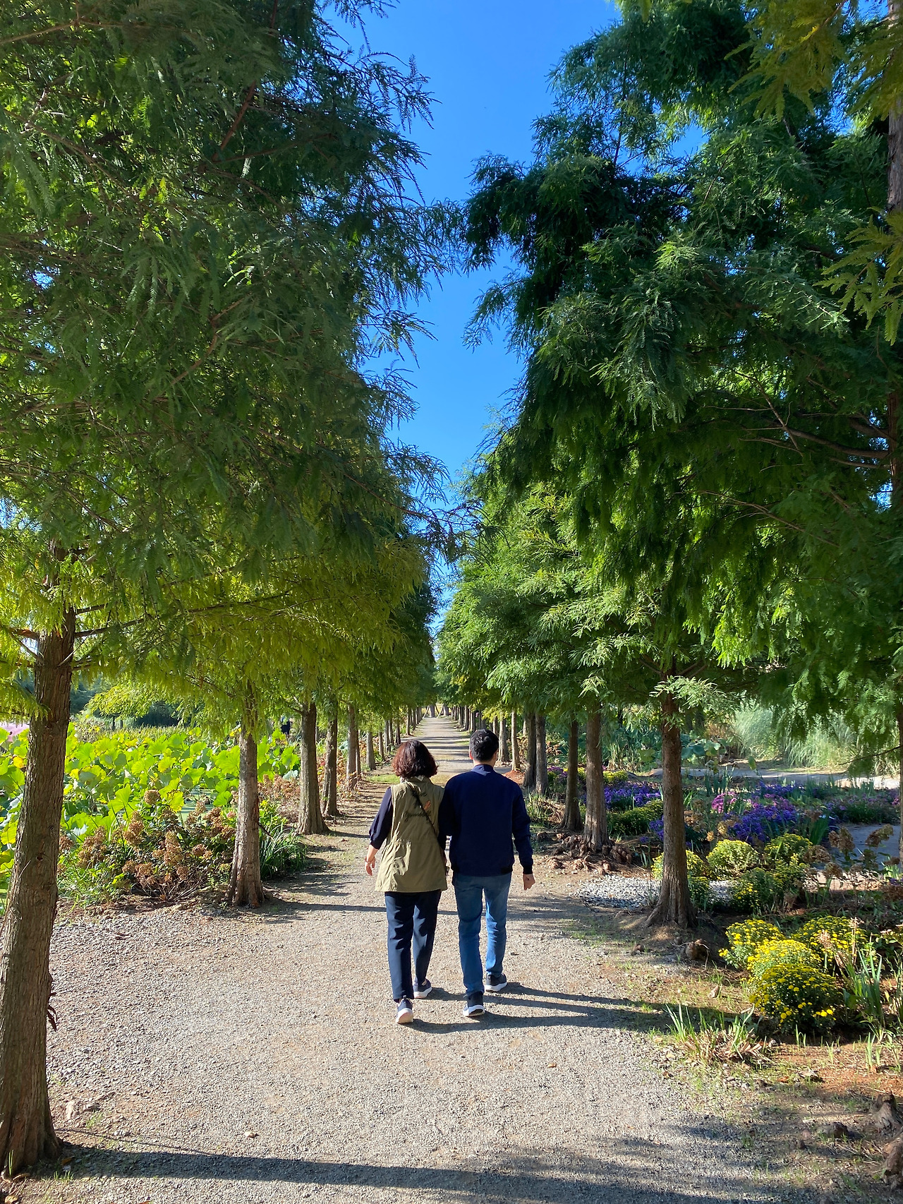 딱 처음 수목원에 발을 딛자마자 마주한 곳은 드라마 <사랑의 불시착> 촬영지였다. 촬영지라고 하니 괜히 한 컷 멋지게 찍어줘야 할 것 같아서 엄마, 아빠의 사진을 찍어주었다. 근데 사실 촬영지라는 점을 빼고 봐도 정말 멋있는 길이었다. 울창한 나무들!
