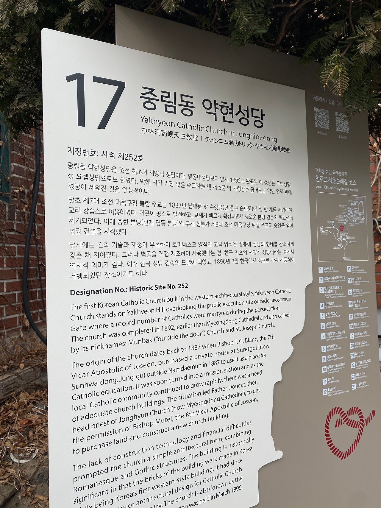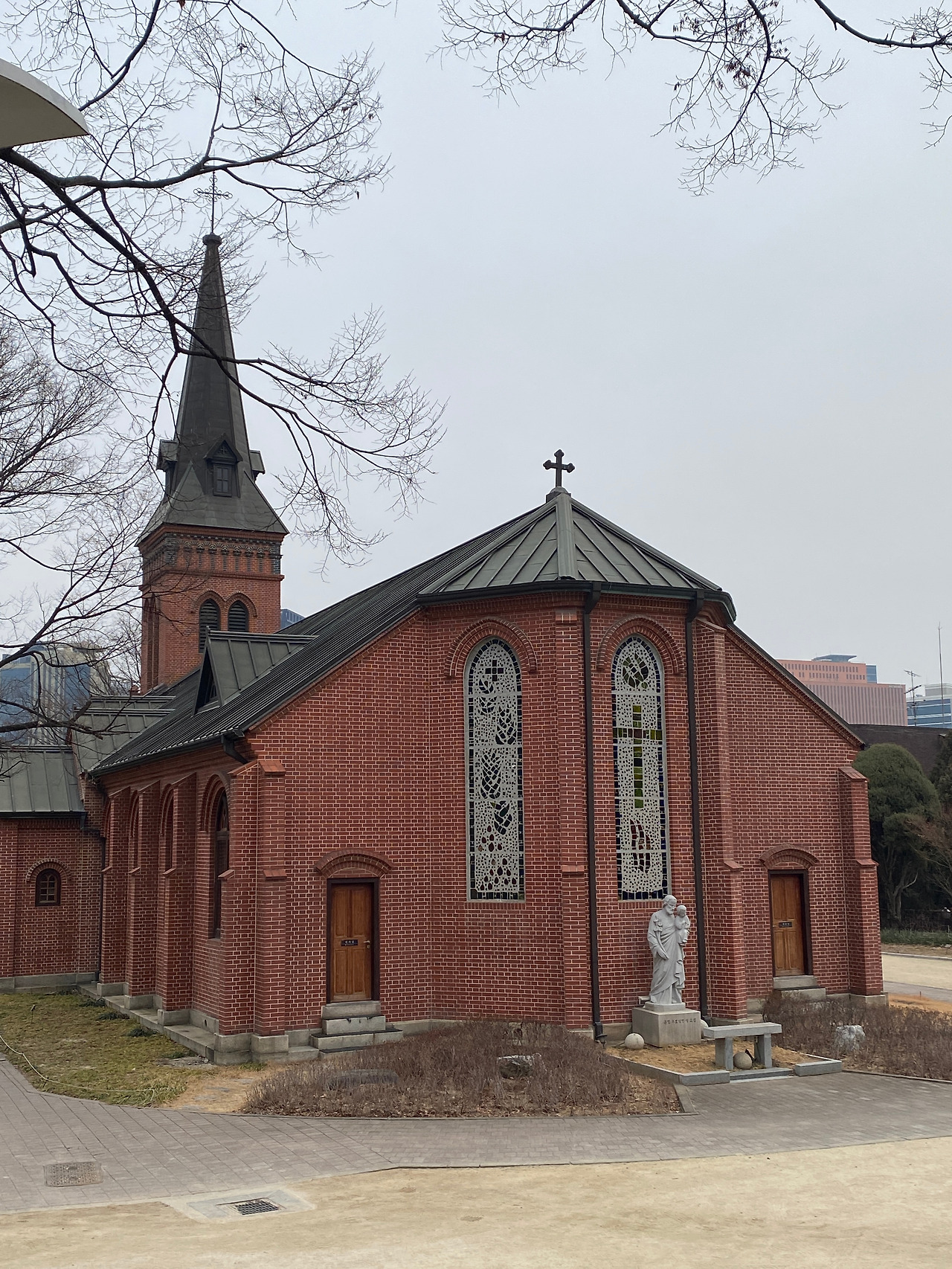생각보다 성당 전체 사진을 찍기 어려웠는데 나름 마음에 든 중림동 약현성당의 전경이다. 약현성당은 1886년 한불조약 이후 종교의 자유가 허용되면서 지어진 조선 최초의 서양식 성당이라고 한다. 그렇기 때문에 약현성당이 한국 천주교회사와 건축사에 있어 가지는 의미도 굉장히 크다고 한다.