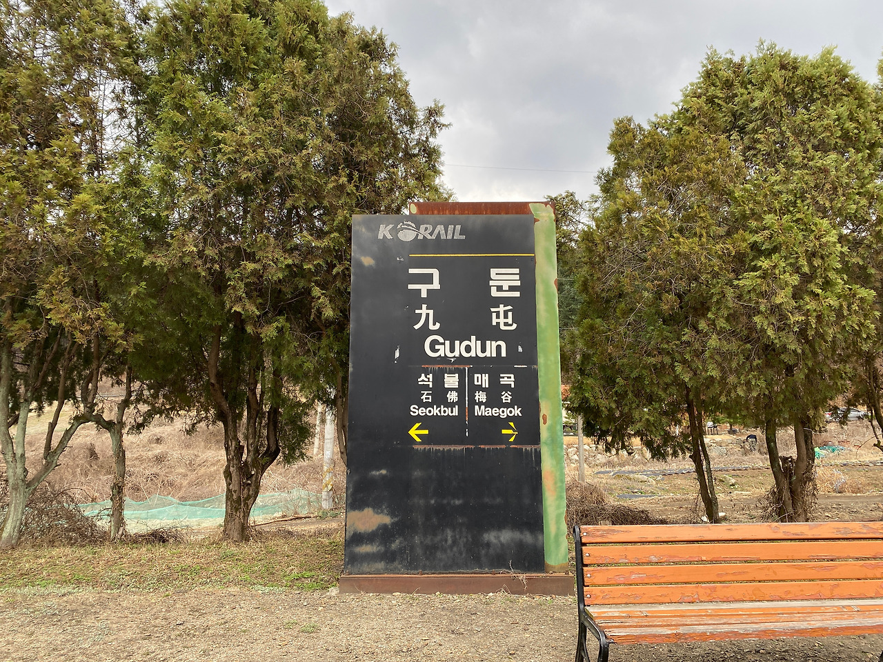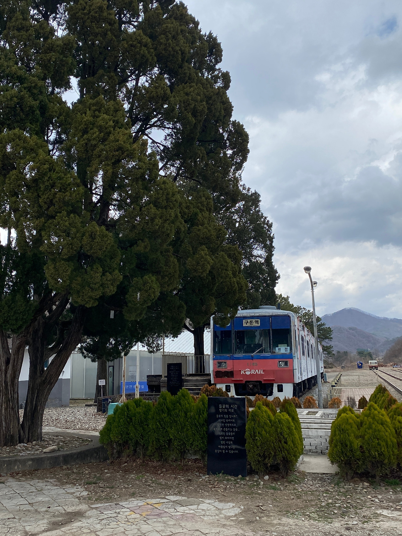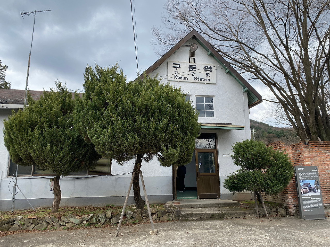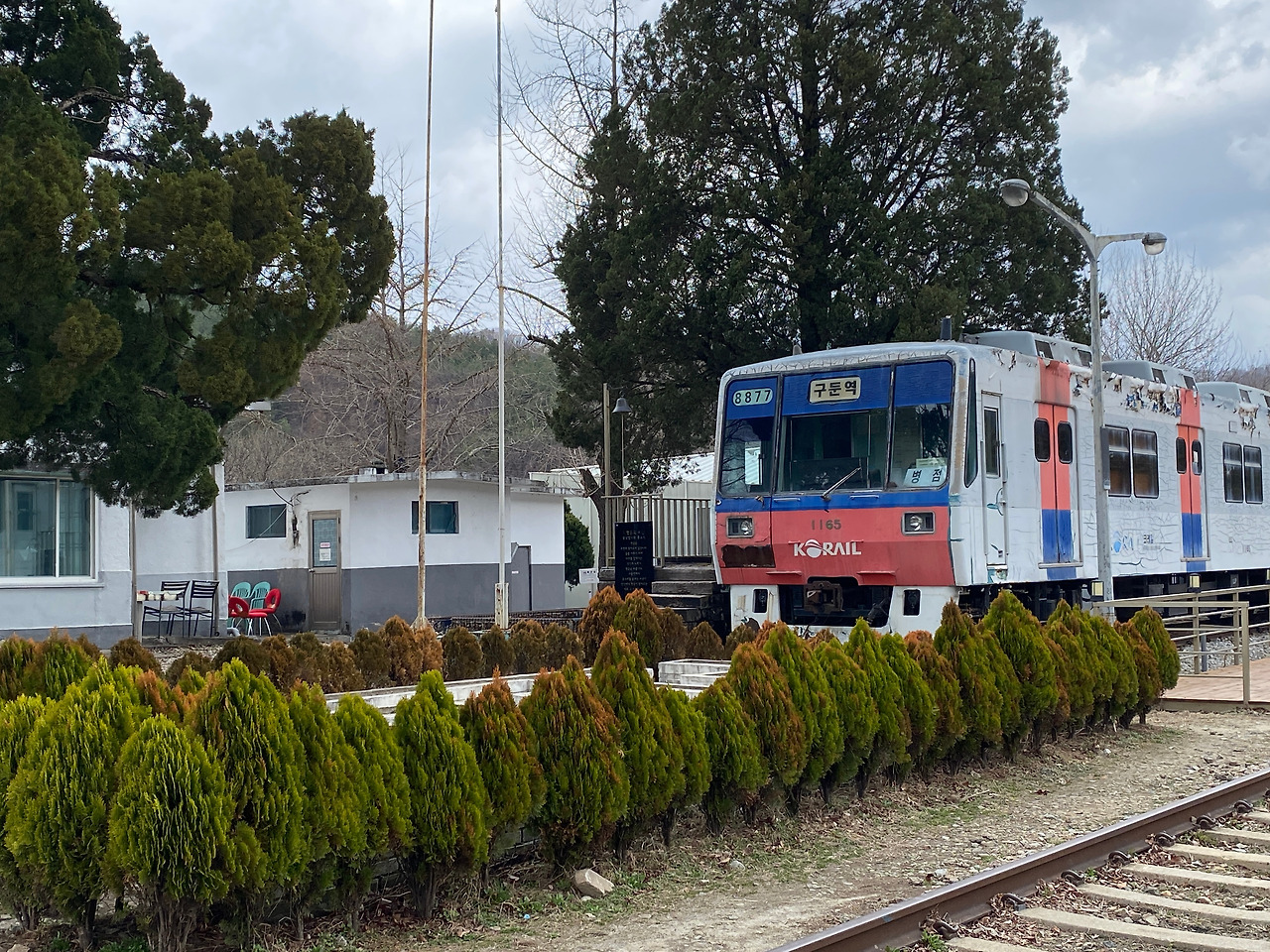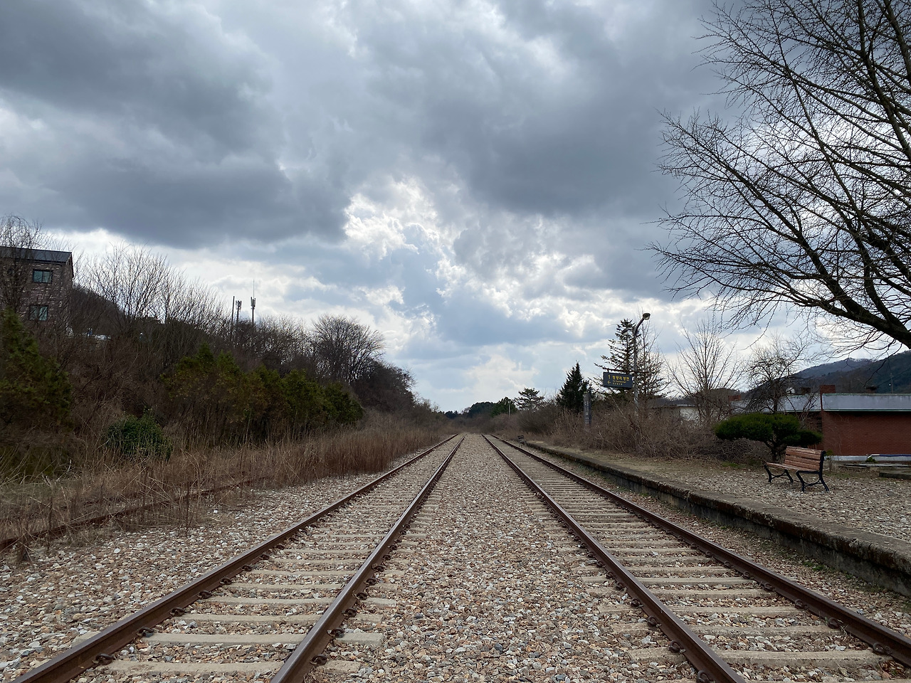 원주 뮤지엄산 관람을 마치고 구둔역으로 향했다. 나름 핫한 곳이었음에도 평일이기도 하고, 맑은 날도 아니었기 때문에 사람이 단 한 명도 없었다. 그래도 방탄소년단이 온 곳이라고 하니까 사진을 따라서 찍으려고 했는데 미묘하게 달랐다. 앞에서 찍은 게 아니라 뒤에서 찍은 거였다. 그래서 역사 내부를 거쳐서 반대쪽으로 넘어갔다.