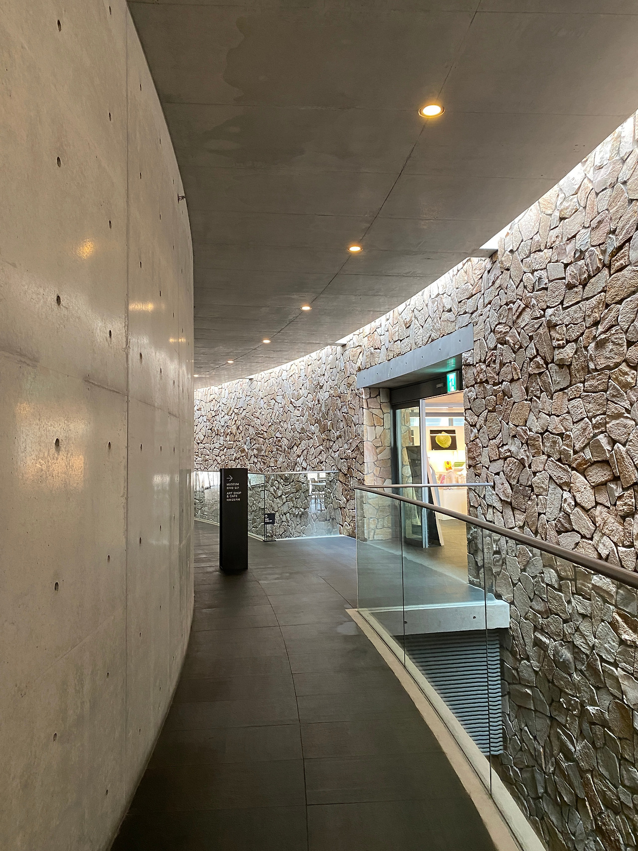티켓을 끊고 입장하는데 가장 먼저 기념품샵을 지나게 된다. 이곳은 기념품샵으로 가는 길인데 둥그런 길이 멋있어서 찍었다. 세계적인 건축가 안도 타다오가 지은 곳이라던데 앞으로 만날 뮤지엄산의 건축에 대한 기대를 한껏 높여주었다. 왠지 벽면의 재질은 아모레퍼시픽 본사 벽면이 떠올랐다. 실제로 만져보기도 했는데 아모레퍼시픽 본사 벽면의 촉감과 비슷했다.