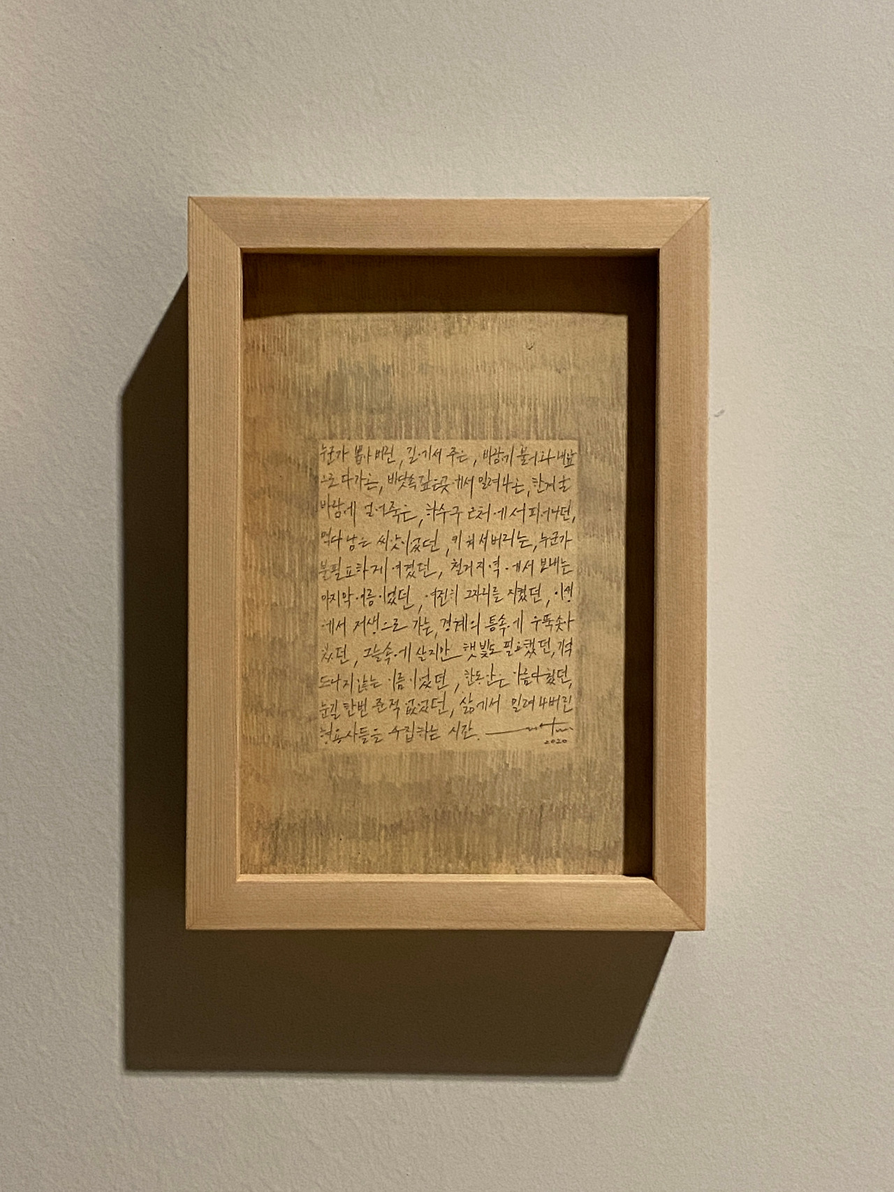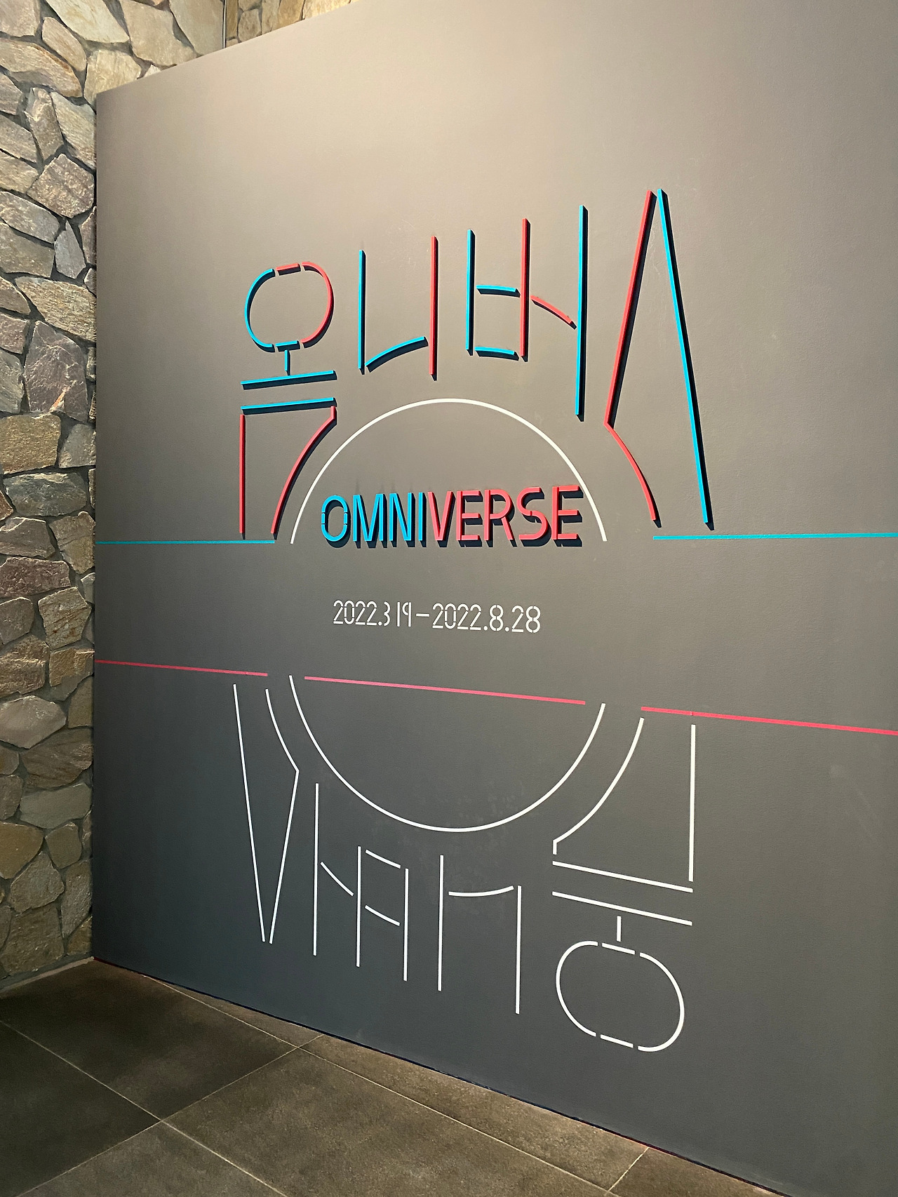 가서 첫 번째로 본 전시는 <옴니버스 OMNIVERSE>라는 전시였다. 어떤 전시가 진행되는지 모르고 와서 별로 기대를 하지 않았는데 웬걸 전시도 정말 마음에 들었다. 가장 처음으로 마음에 든 작품은 김수 작가의 작품이었다. '삶에서 밀려나버린 형용사들을 수립하는 시간'이라는 문장이 담긴 작품이 좋았다. 원래 전시를 볼 때 하나만 마음에 드는 작품이 있어도 성공이라고 생각하기에 이날은 성공에 해당하는 날이었다.