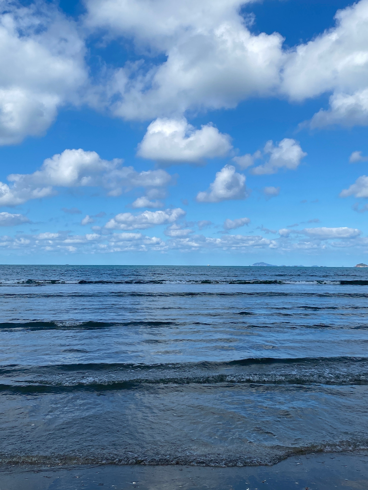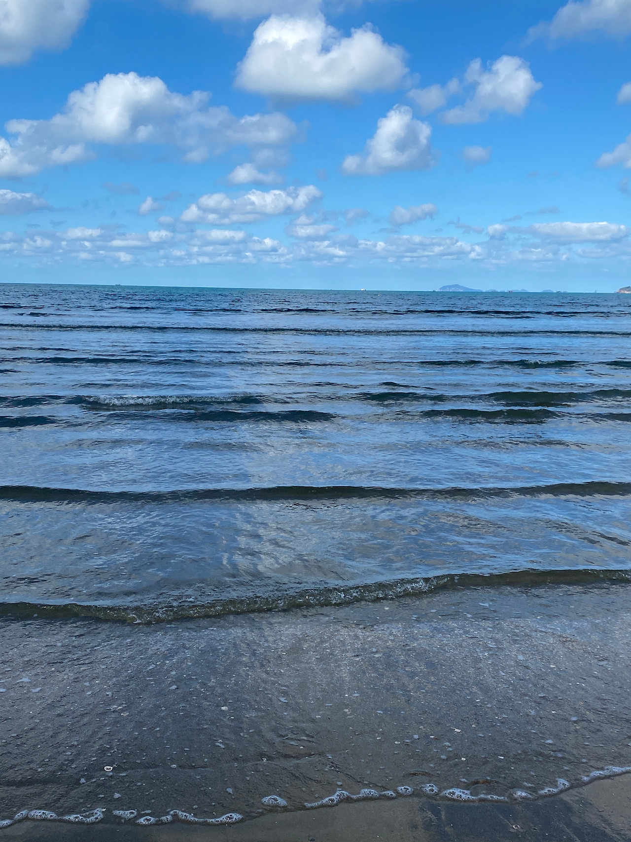 왼쪽 두 장은 해가 가려졌을 때 찍은 사진이고, 가장 오른쪽 사진은 해가 들어왔을 때에 찍은 사진이다. 해가 없을 때는 물 색이 진해보이고 해가 나오면 물이 투명해보인다. 각자의 취향에 따라 해의 유무 선호가 나뉠 것 같다. 나는 개인적으로 짙은 파도색을 담은 가운데 있는 사진이 가장 마음에 들어서 핸드폰 배경화면으로 설정해놨다. 겹겹이 쌓인 바다의 결이 참 예쁘지 않은가? 그런 생각이 든다.