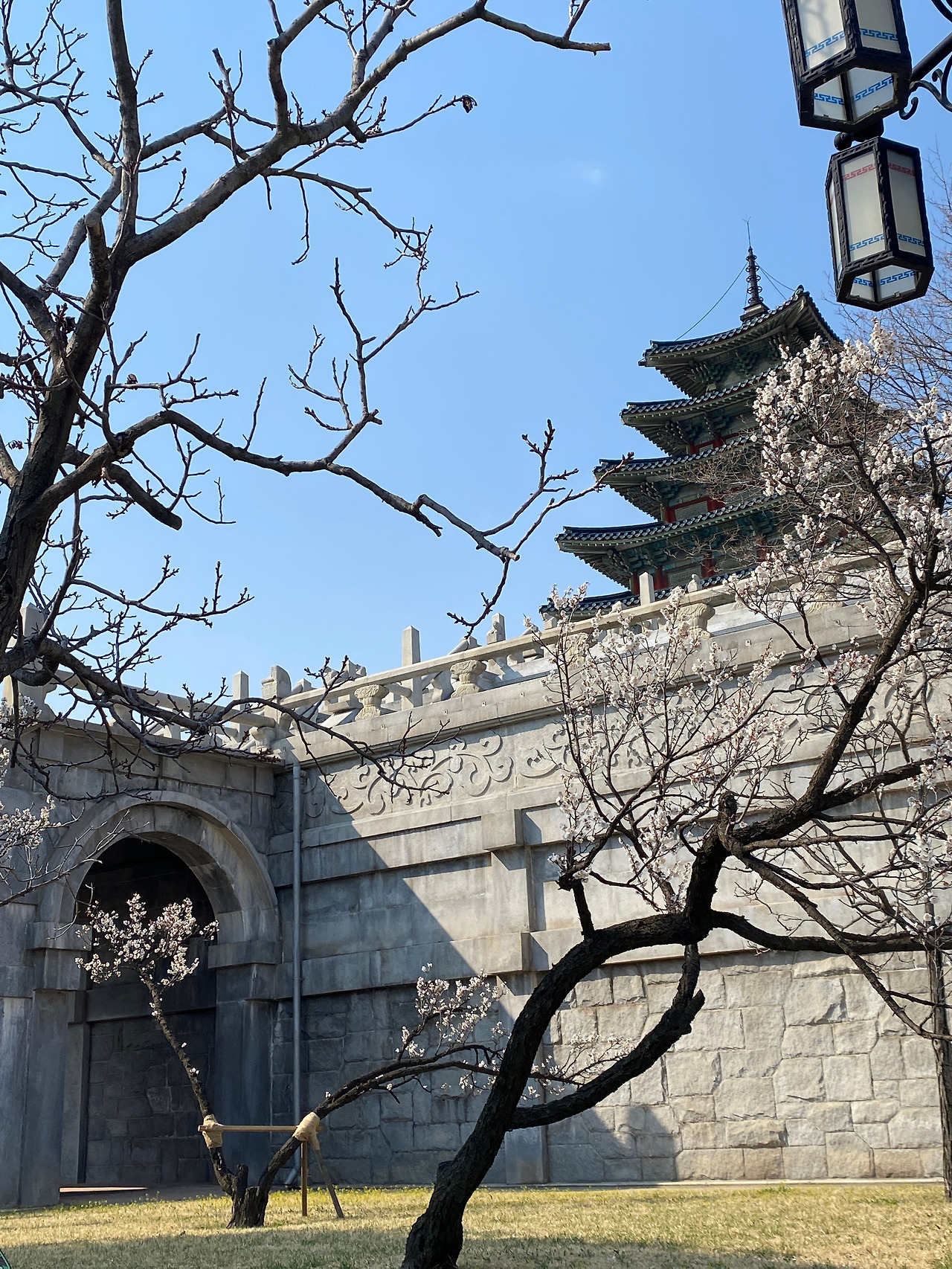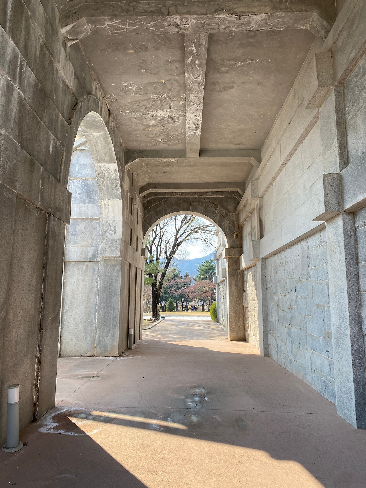 벚꽃과 함께 찍은 건물 사진, 이 왼쪽 사진은 내가 가장 좋아하는 사진 중 하나이다. 그리고 오른쪽 사진은 원형 아치 사이로 봄이 보이는 모습이 좋았다. 이곳에서 엄마가 아빠와 아이 사진을 찍어주고 있길래 가서 세 가족의 모습을 함께 담아주고 싶었다. 가서 사진 찍어드려도 되는지 여쭤봤다.