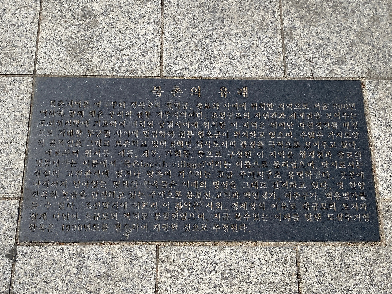 창덕궁에서 나와 북촌을 걸으려는데 발견한 글이다. 북촌은 서울 600년 역사와 함께 해온 우리의 전통 거주지역이라고 한다. 청계천과 종로의 윗동네라는 이름에서 '북촌'이라는 이름으로 불리었다고 한다. 그리고 고급 주거지구였다고! 종로구 일대를 걸으면 진짜 나도 여기에 집 한 채만 갖고 싶어 진다.