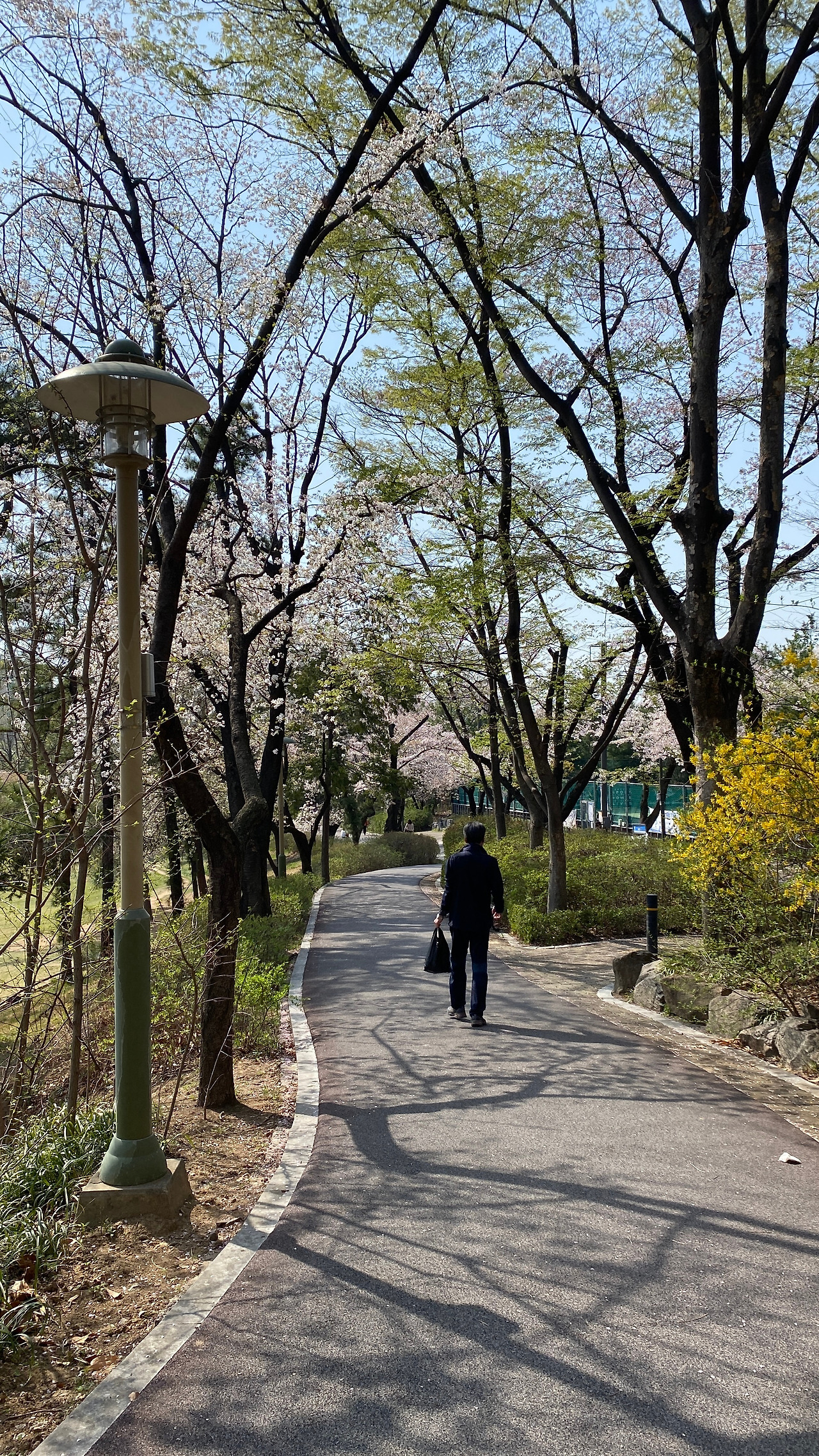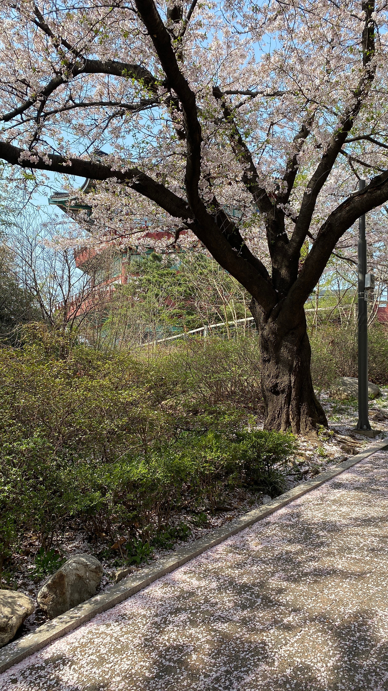 4월 한창 벚꽃 철에 가니 곳곳에 벚꽃이 피어있었다. 벚꽃 길도 너무 예뻤지만 떨어진 벚꽃잎을 때문에 핑크색으로 뒤덮인 거리가 너무 예뻤다.