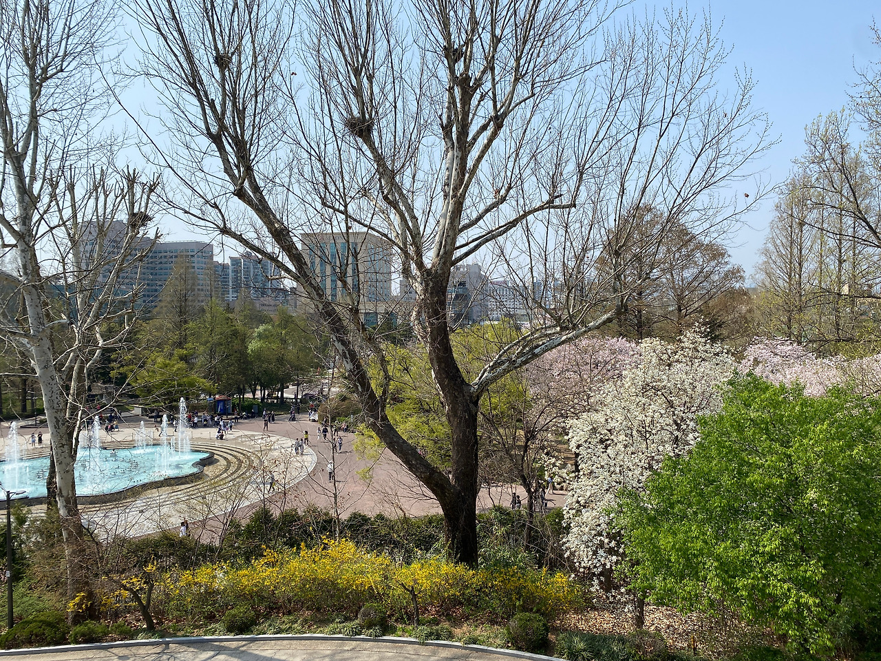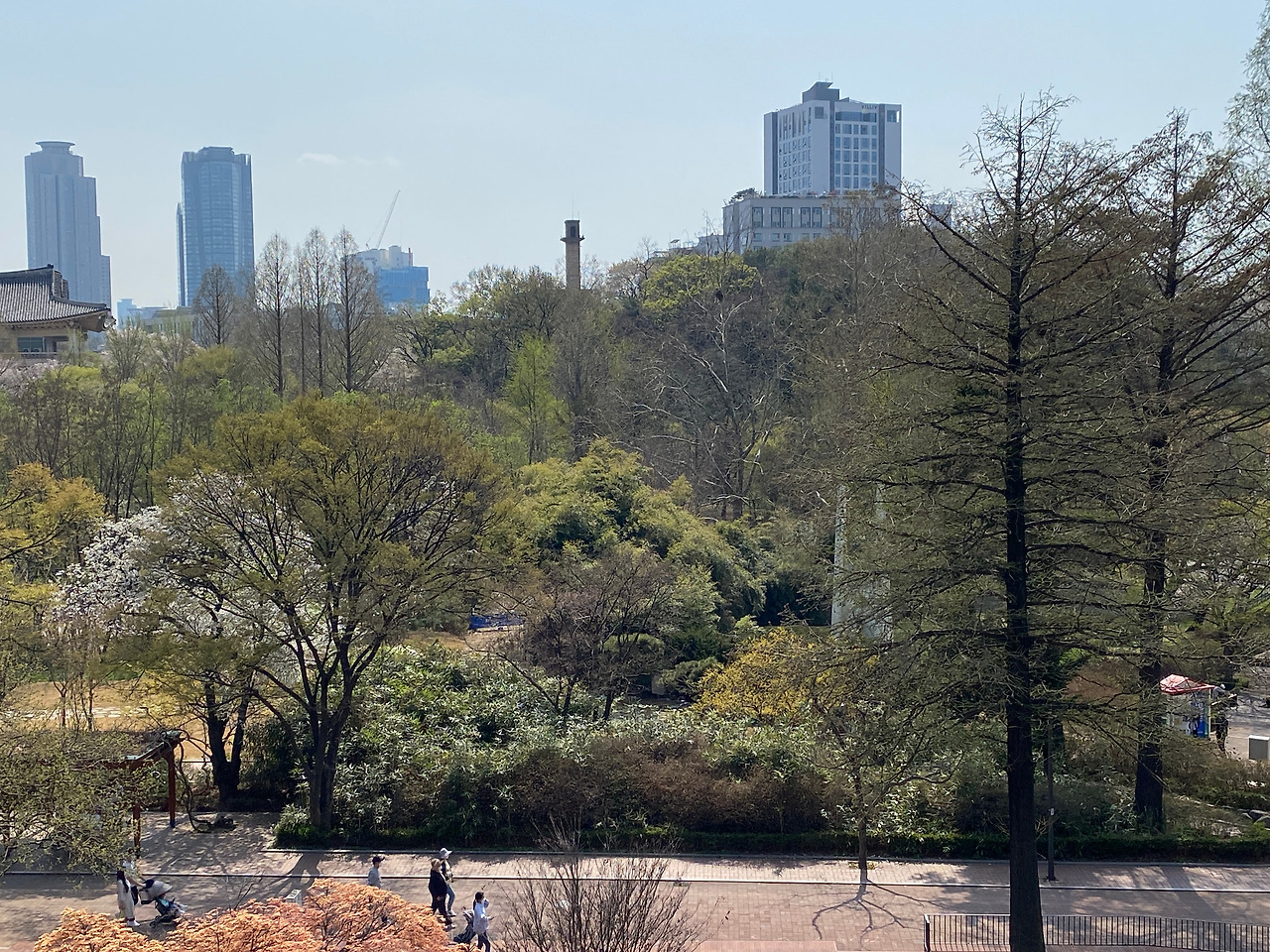 꿈마루에 올라 바라보는 어린이대공원 뷰가 무척 좋다. 다양한 색감의 나무들을 한눈에 내려다볼 수도 있고, 분수대의 춤과 어린이들의 웃음으로 활기를 띠는 분수대 쪽도 지켜볼 수 있다. 너무너무 좋은 곳! 비밀 플레이스다.