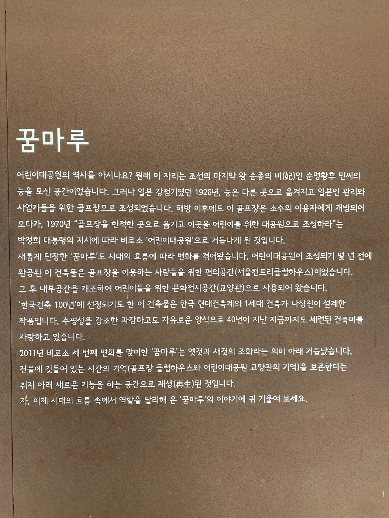 가보고자 했던 곳은 바로 어린이대공원 꿈마루다. 건축에 관심이 생겼을 때 이곳을 한국 현대 건축계의 1세대 건축가 나상진이 설계했다는 것을 알게 되어 꼭 한 번 와보고 싶다고 생각했던 곳이다. 와서 설명을 읽는데 우리나라 최초의 골프장 클럽하우스 건물이며, '한국 건축 100년'에도 해당한다는 것을 알게 되었다.