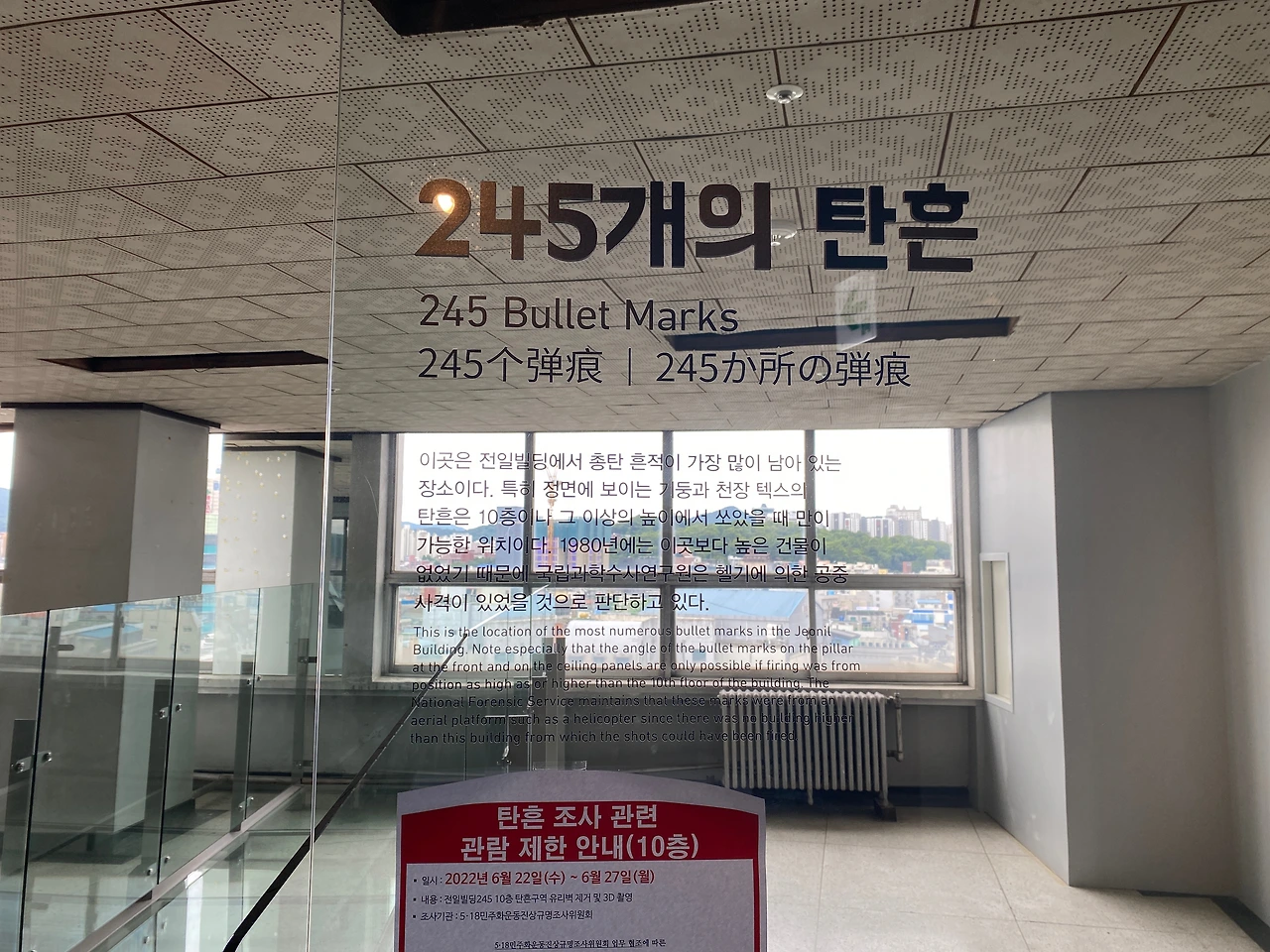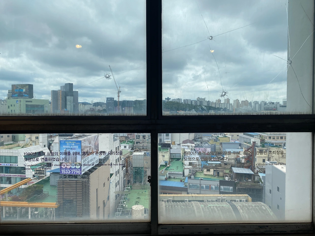 왼쪽의 사진은 1980년 총격 상황의 이해를 위해 총알이 관통된 모습을 연출한 유리창이고, 오른쪽 사진은 당시의 상황을 분석한 내용이 담겨 있다. 위에서 본 탄환의 진행 방향을 보았을 때 최소 10층 이상의 높이에서 사격한 것으로 판단된다고 한다. 근데 중요한 점은 이때 당시 주변에 10층 이상의 건물이 존재하지 않았기 때문에 헬기와 같은 비행체에서 발사되었을 가능성이 매우 높은 것으로 평가한다는 점이다. 그래서 이 건물이 계엄군의 폭력성을 보여주는 역사적 증거 그 자체라는 점을 알게 됐다.