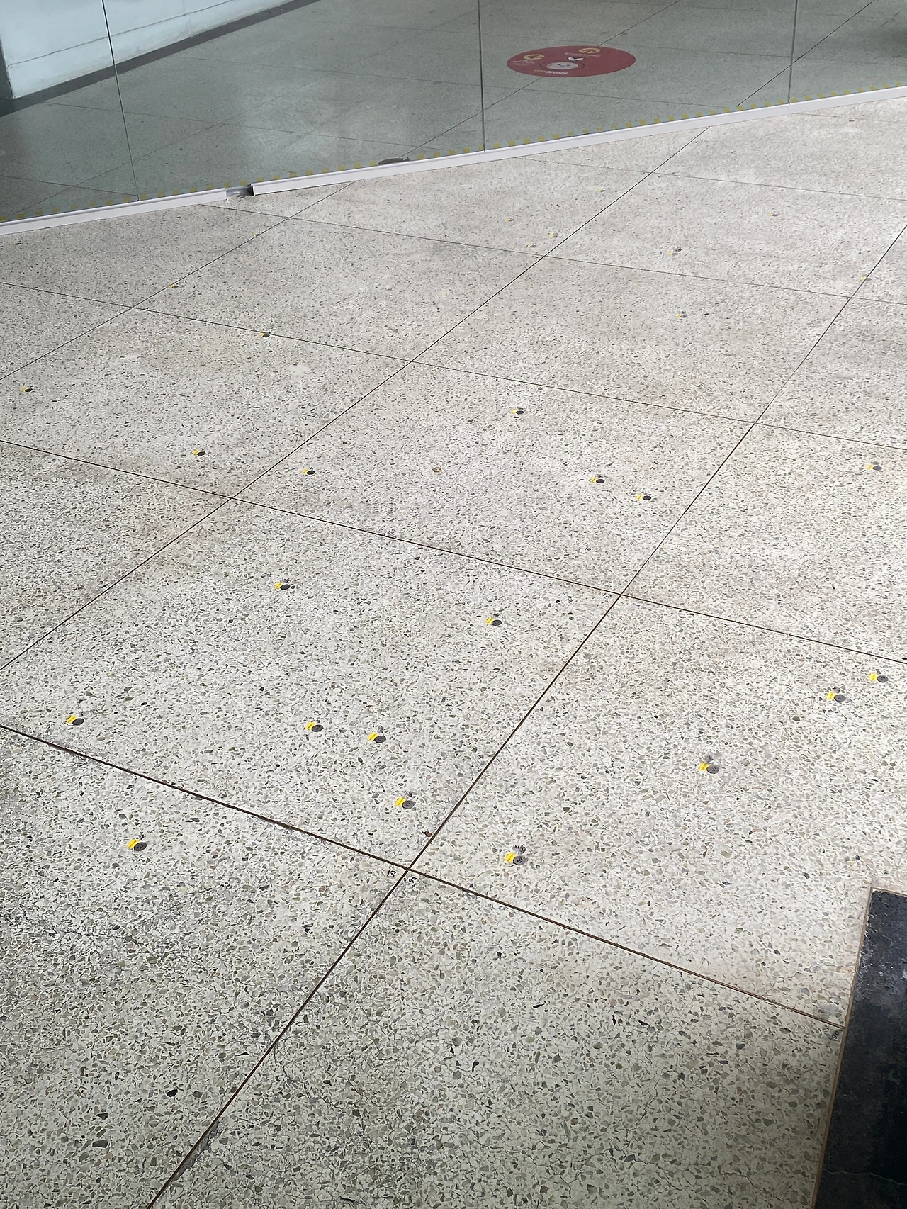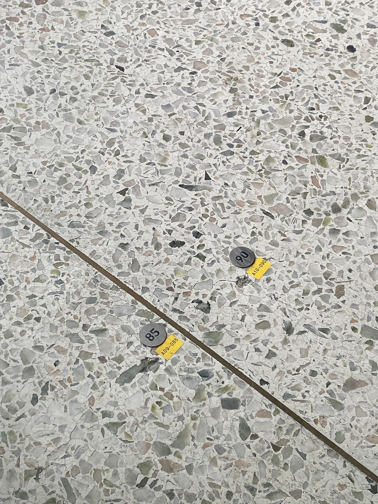 정면에 보이는 기둥과 천장 텍스의 탄흔은 10층이나 그 이상의 높이에서 쏘았을 때 가능한 위치라고 한다. 실제로 기둥과 바닥 모두 정말 많은 탄흔 자국이 있었다. 기둥의 면에 남은 탄흔 자국을 더욱 쉽게 볼 수 있도록 거울이 한 면에 부착되어 있었다.