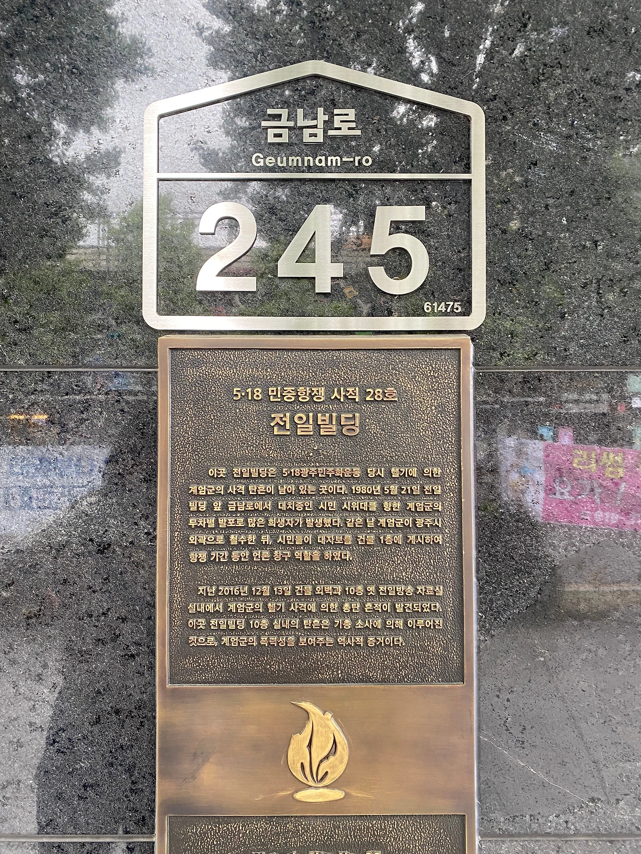 빌딩 이름이 전일빌딩 245였는데 헬기에 의한 사격 탄흔이 245개 발견된 건물이라고 한다. 주소도 광주광역시 동구 금남로 245였다. 또 검색해보니 사진 속 전일빌딩 245의 BI 정중앙의 원은 탄흔을 의미한다고 한다. 나도 아마 브런치를 쓰며 검색해보지 않았더라면 영영 몰랐을 것이다. 아니까 BI의 원이 눈에 들어오는 것도 신기했다.