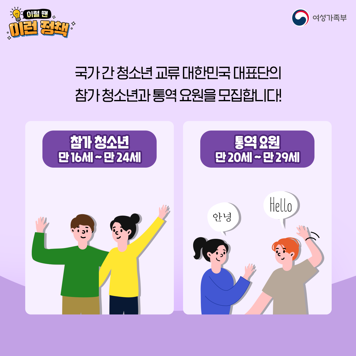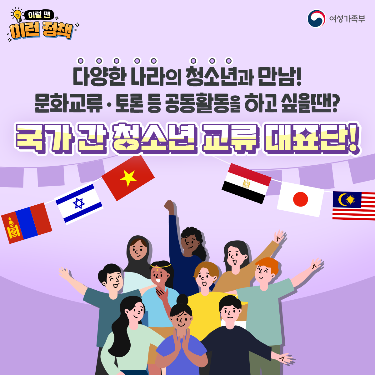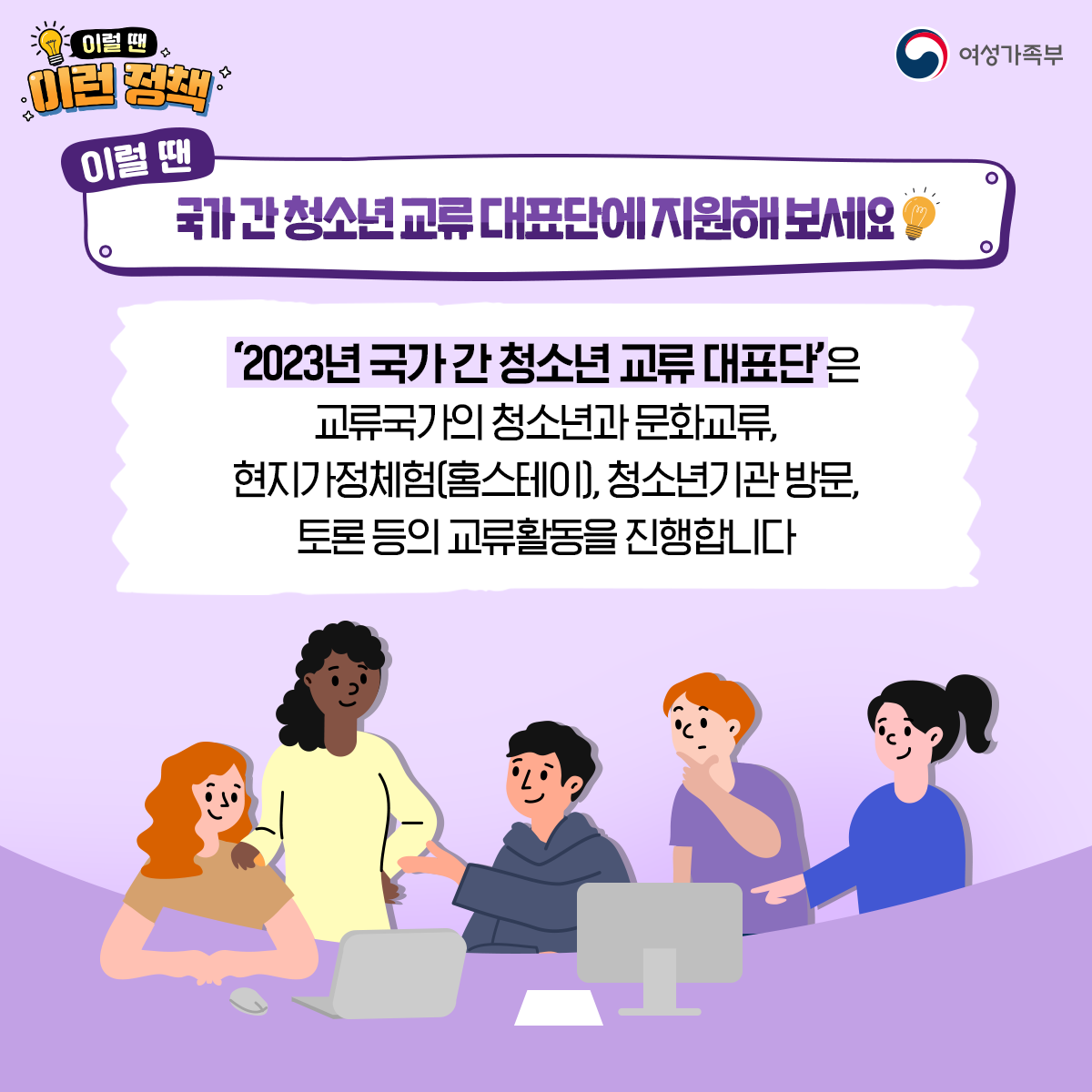 여성가족부는 국제교류 활동을 위해 '2023년도 국가 간 청소년 교류 청소년대표단'을 모집하고 있습니다. 코로나19의 확산으로 비대면 방식으로 진행되던 프로그램이 3년 만에 대면으로 다시 전환되었다고 해요.