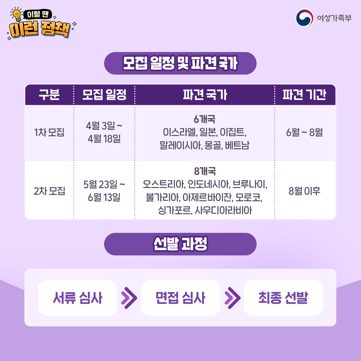 참가자 모집은 파견 시기에 따라 2회에 걸쳐 이뤄지며, 총 200여 명을 선발하는데요. 지금 진행되고 있는 이번 1차 모집에서는 이스라엘, 일본, 이집트, 말레이시아, 몽골, 베트남에 파견될 청소년 80명가량을 뽑으며 2차 파견 대상국은 오스트리아, 인도네시아, 브루나이, 불가리아, 아제르바이잔, 모로코, 싱가포르, 사우디아라비아라고 합니다.