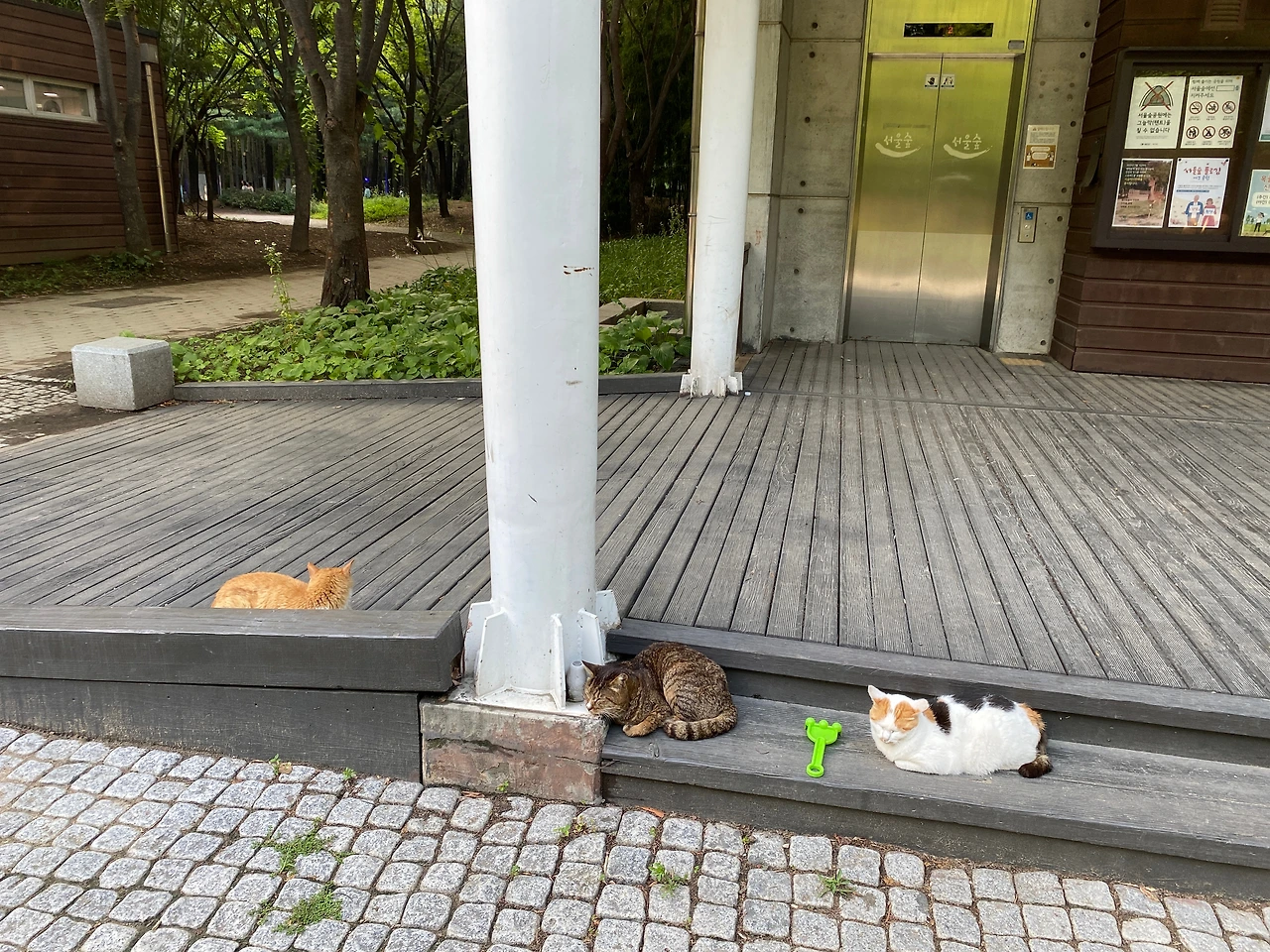 그리고 다리를 지나 수변 휴게실 커뮤니티 센터 앞에서 이 고양이 세 마리를 본 게 너무 신기했다! 왜냐하면 나머지 두 마리 말고 저 가운데의 어두운 고양이는 2019년에 왔을 때도 봤던 고양이였기 때문이다. 나른하게 자고 있는 세 마리 고양이 너무 귀엽다. 나는 만지지 않았지만 얘네 정말 순했다 <3