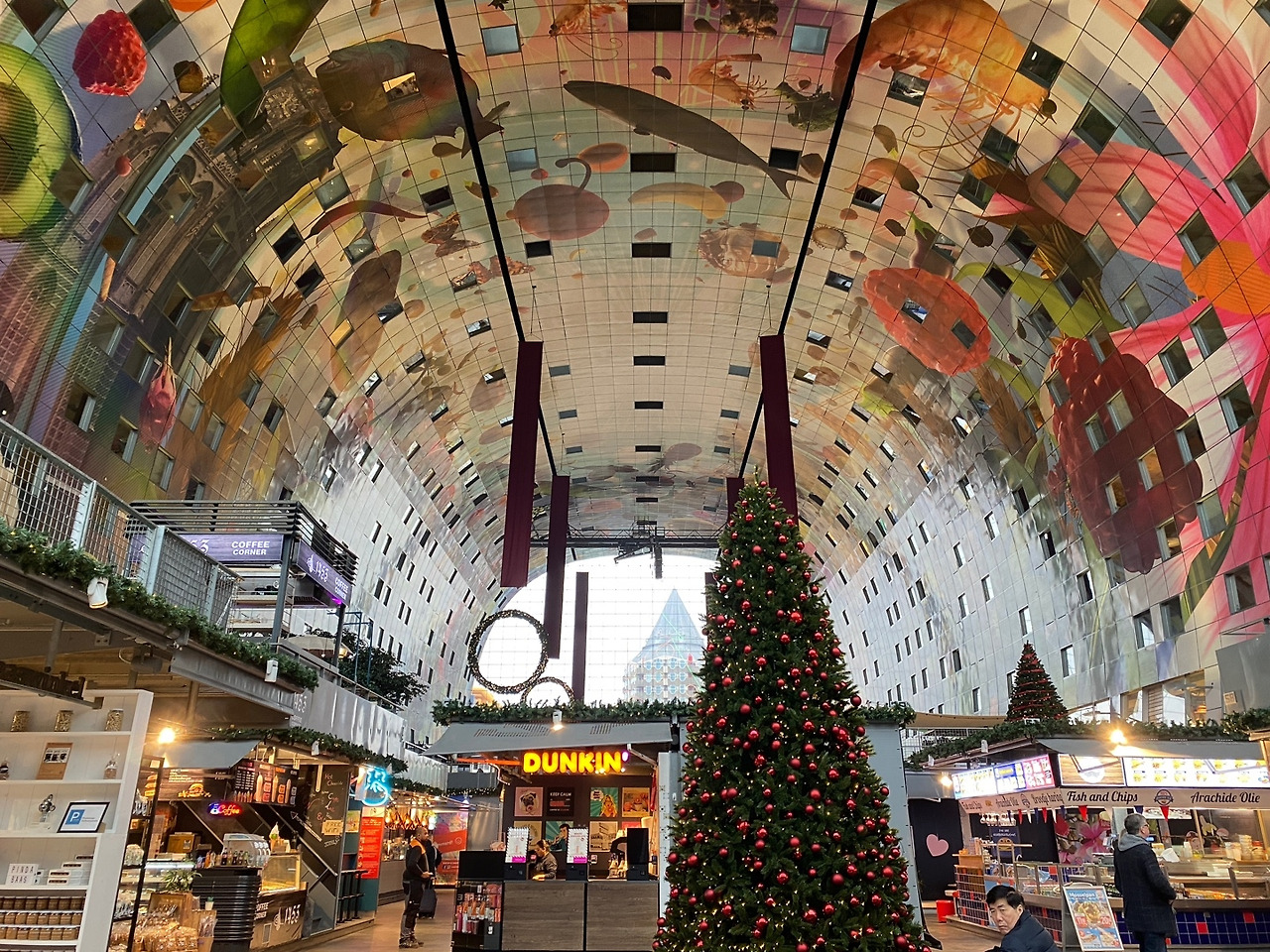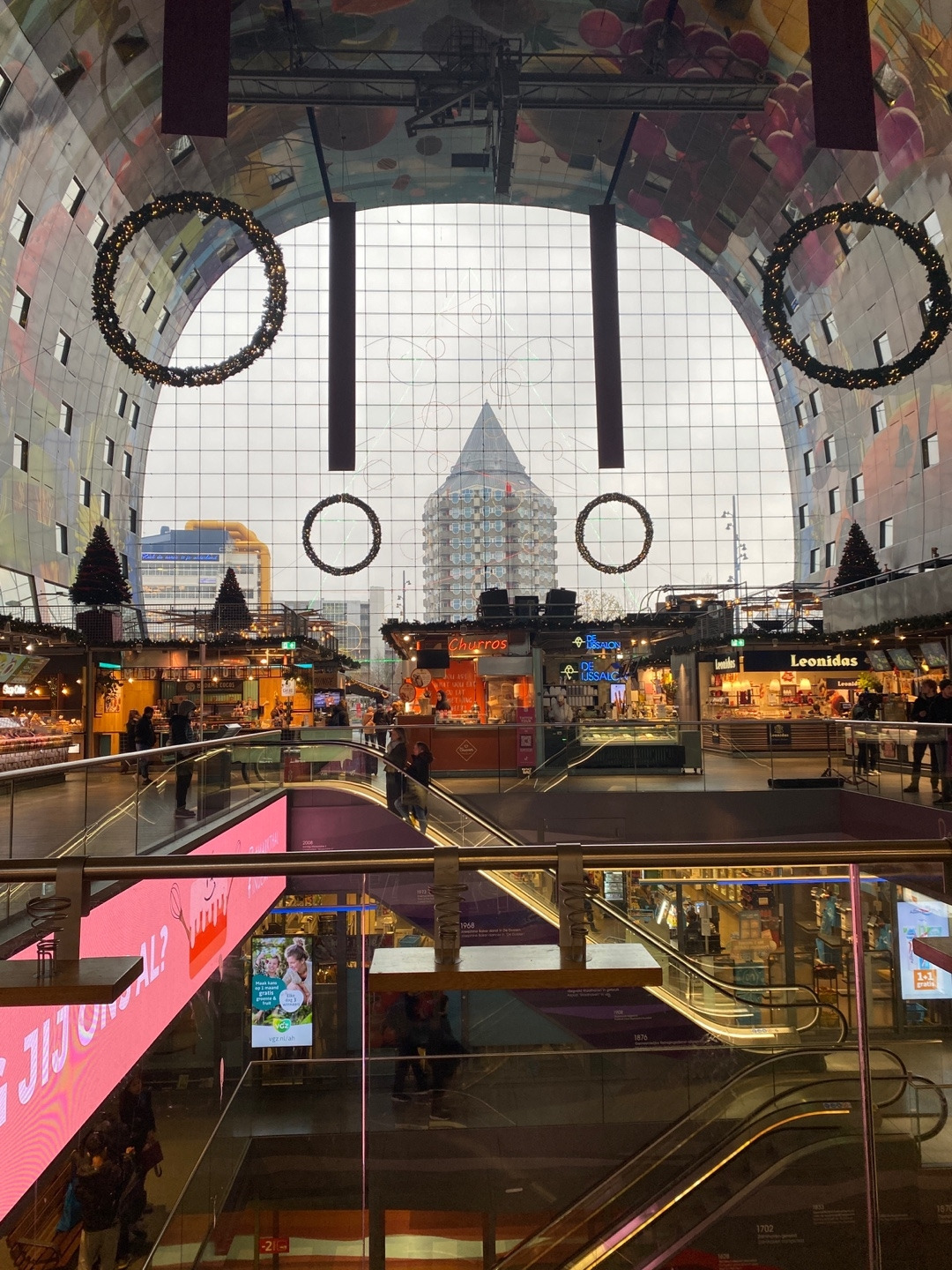 이곳은 로테르담의 랜드마크와도 같은 '마켓홀'이다. 이곳은 네덜란드의 건축가 사무소 MVRDV가 설계했으며, 재래시장과 200채가 넘는 주택의 복합건물이라고 한다. 내가 갔을 때는 12월 초였기 때문에 유리에 트리 모양으로 불이 들어와 있었다. 지역의 랜드마크를 자국의 건축가들이 지은 점도 인상 깊은 점이다.