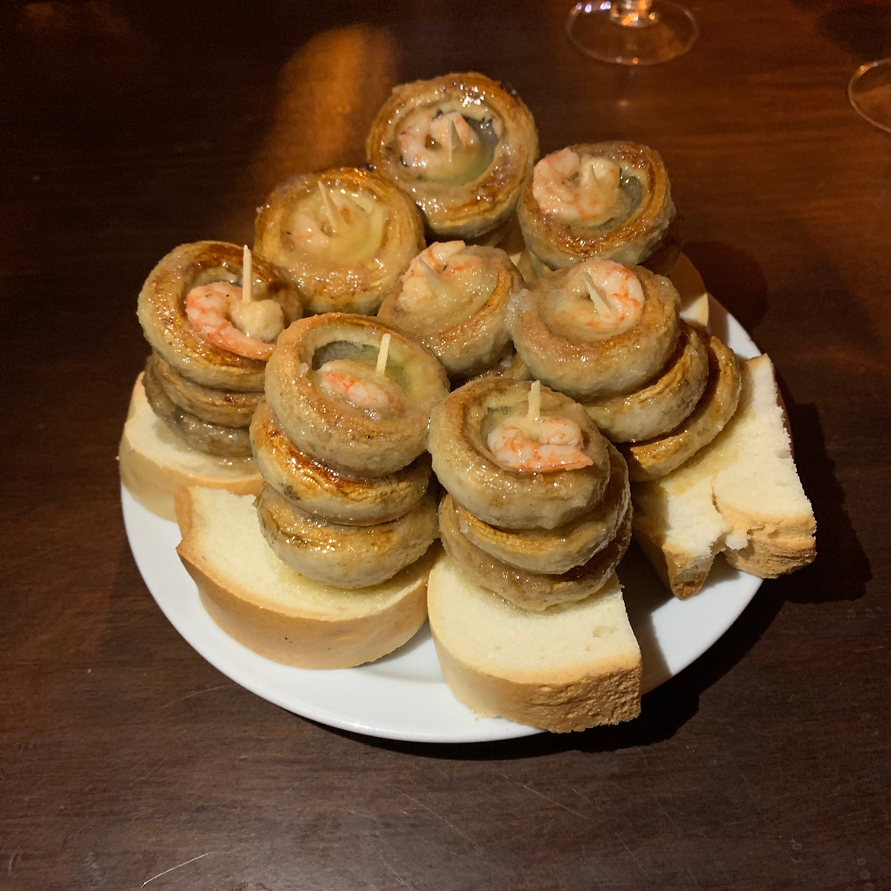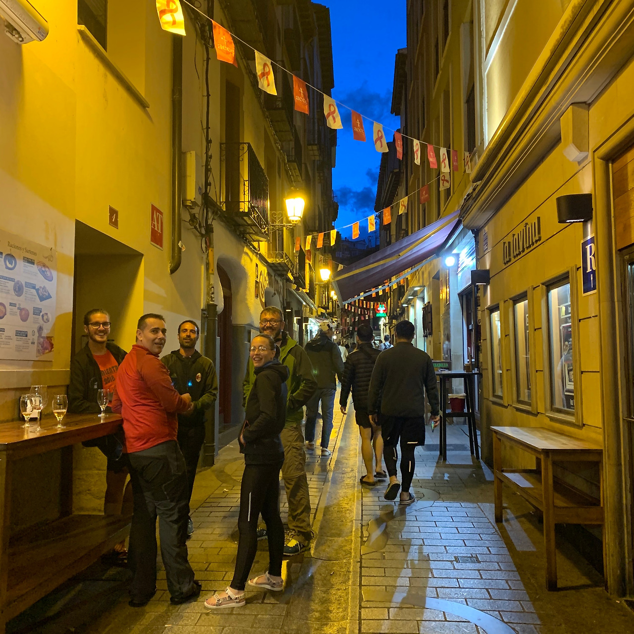 드디어 빨래 지옥 탈출! 기다리고 기다렸던 타파스를 먹으러 나갔다. 군데군데 보이는 가게들도 구경하다 보니 유명한 타파스 거리가 금방 보였다. 양송이 구이가 맛있다고 해서 첫 시작을 그쪽에서 하기로 했다. 가게까지 가는 길에 타파스 거리가 주욱 늘어서 있는데, 보니까 한 번씩 인사를 나누던 사람들이 타파스를 즐기고 있었다. 우선 1인당 10유로씩 내고 네 곳을 돌아다니며 와인과 안주를 먹기 시작했다.