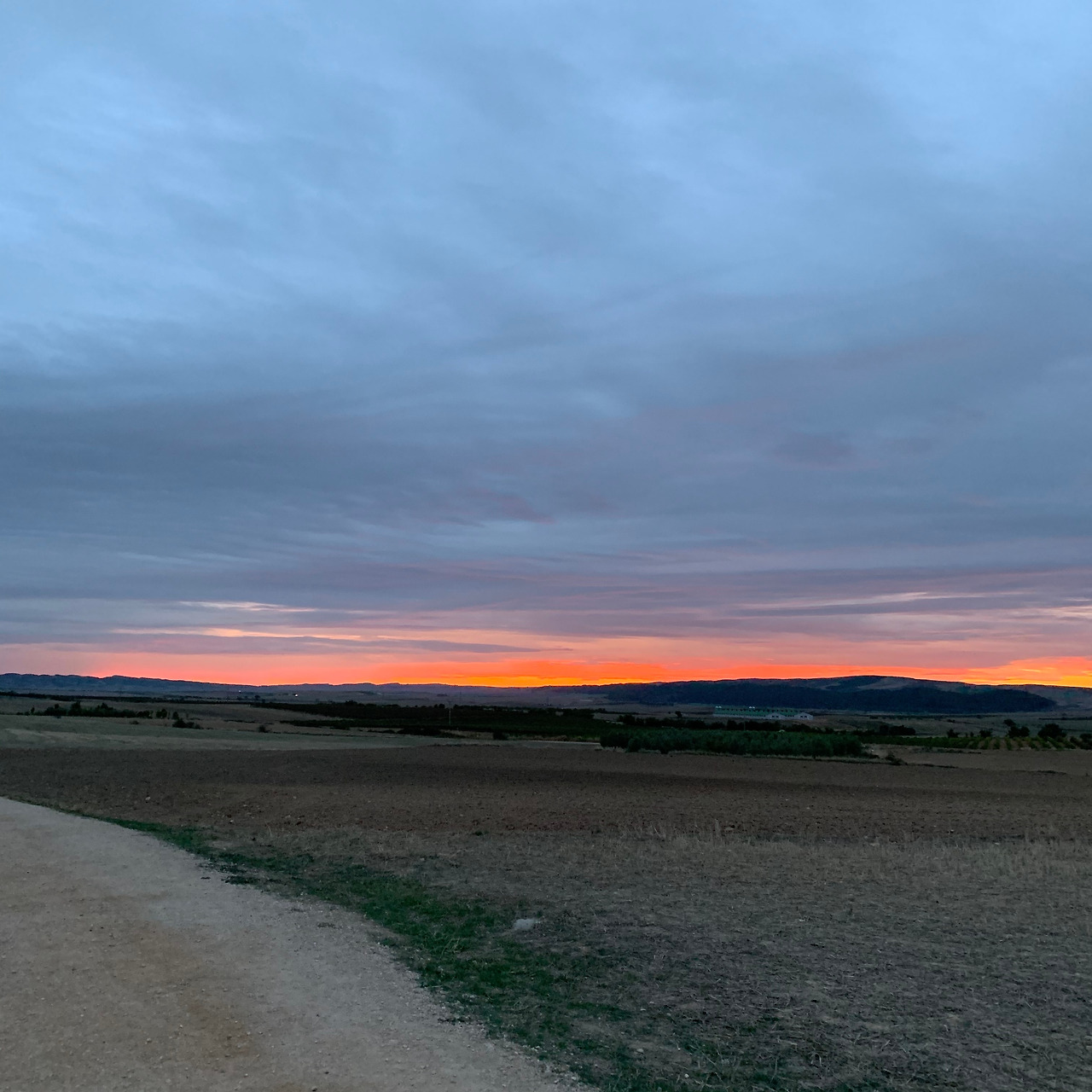 비가 온다고 했는데 왠지 날씨가 좋을 것 같은 느낌. 오늘도 너무나 예쁜 하늘이다. 이 지금, 잠깐의 시간 동안만 불그스름한 여운을 남기는 해가 어찌나 예쁜지. 하늘을 보기도 하고, 펼쳐진 들판을 보기도 하며, 걷고 또 걷는다. 28km, 왠지 모르게 무언의 압박이 느껴지는 거리지만... 부지런히 걷는 수밖에! 탁 트인 벌판에 한 명, 또 한 명, 걷는 사람들이 보이기 시작했다.