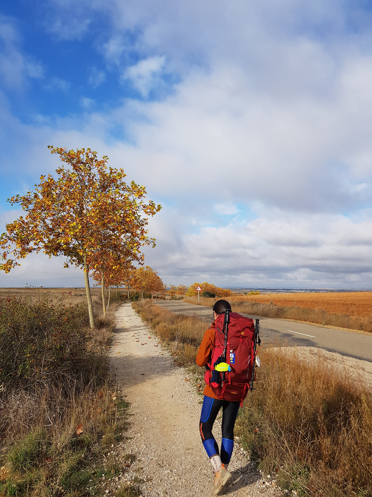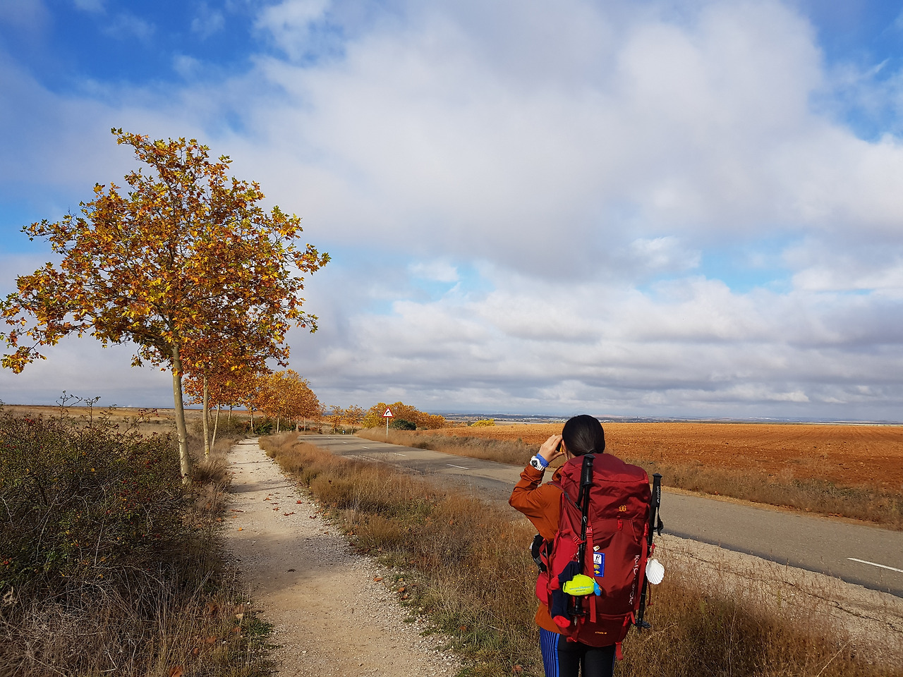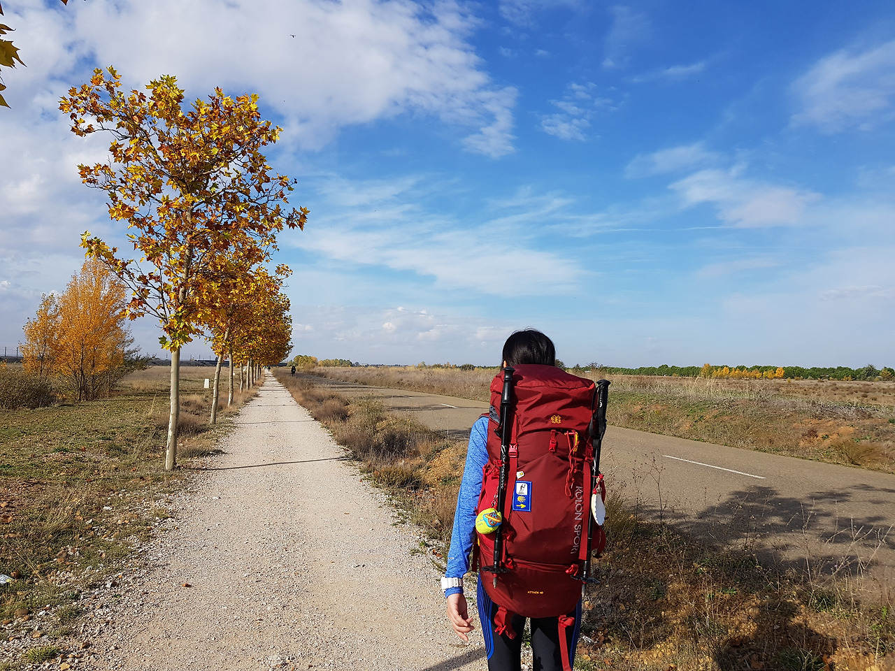 많은 순례자들에게 지루한 길로 여겨지는 이 곳, 메세타 평원길이 점프를 많이 하는 구간이라는 말을 오늘에서야 실감했다. 가을 나뭇잎을 안고 있는 나무들, 광활하게 뻗어있는 길, 탁 트인 시야를 처음 마주했을 때는 감탄의 연속이었지만, 계속 비슷한 풍경이 펼쳐진 평지길은 지루함을 불러일으키기도 했다.